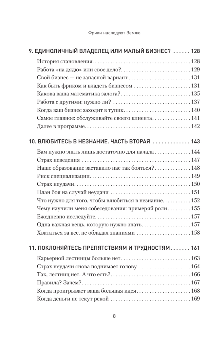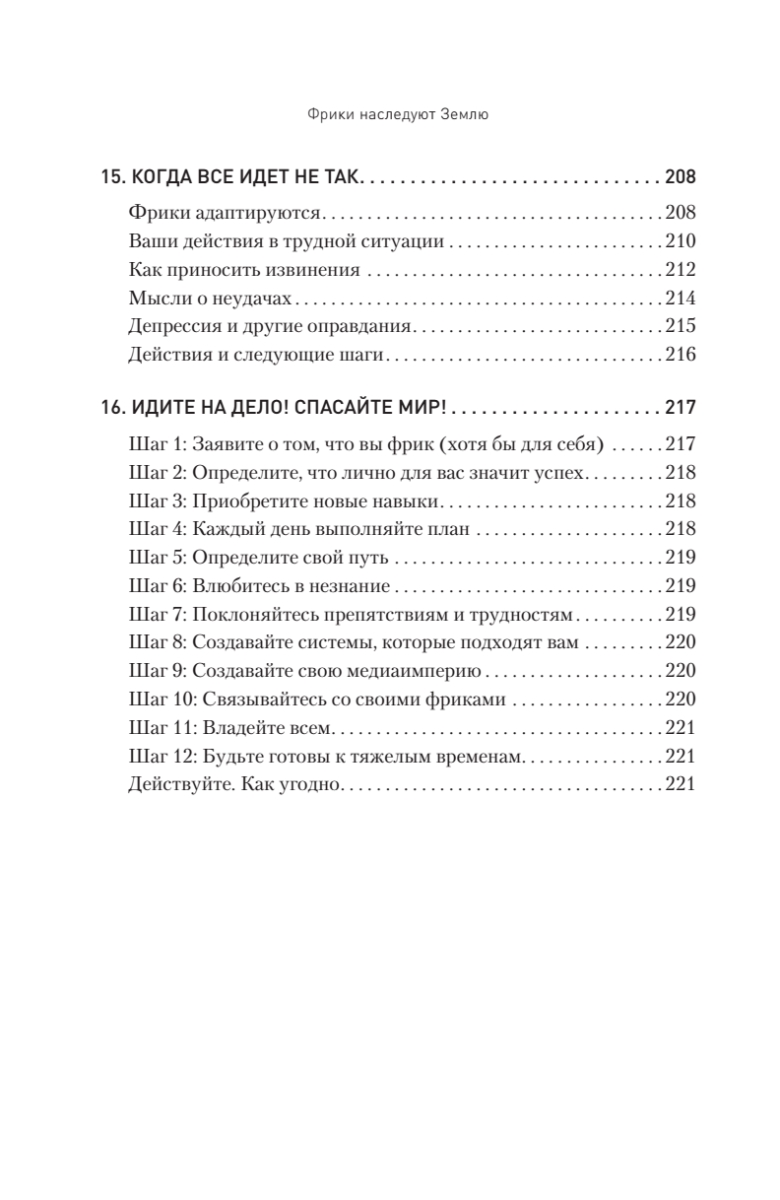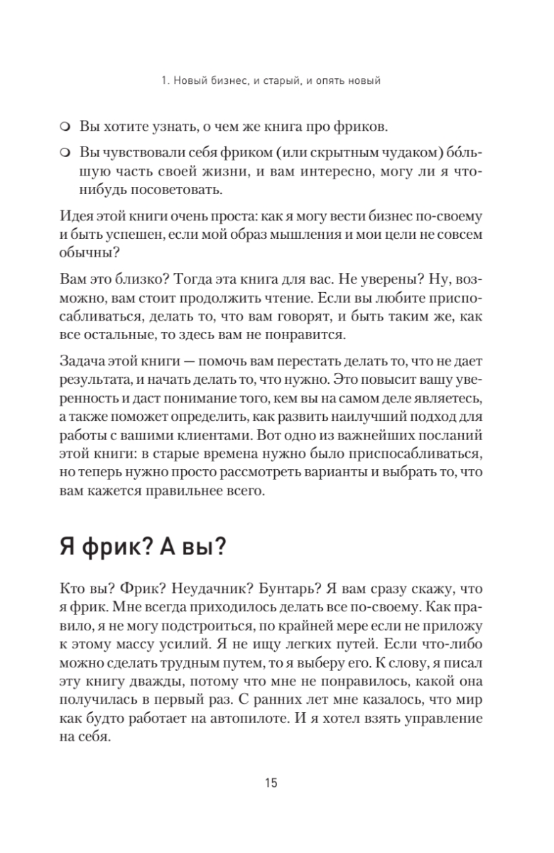 Фрики доминируют и покоряют мир. Были времена, когда все безумные и нестандартные идеи относились к андеграунду. Теперь же андеграунд стал центром процветающей экономики, которая развивается совершенно непредсказуемым образом. Старые правила не работают, пора обратить свой взор на новые тенденции.Эта книга — боевой клич, вера в то, что «я могу это сделать», это необходимая поддержка, особенно если вы ее больше нигде не получаете. Идея очень проста: как вести бизнес по-своему и быть успешным, если ваш образ мышления и цели не совсем обычны? Перестаньте делать то, что не дает результата, и начните делать то, что нужно. Это повысит вашу уверенность и даст понимание того, кем вы на самом деле являетесь, а также поможет определить, как развить наилучший подход для работы с вашими клиентами. Одно из важнейших посланий автора: в старые времена нужно было приспосабливаться, но теперь нужно просто рассмотреть варианты и выбрать то, что вам кажется правильнее всего. Стройте планы и следуйте им. Пытайтесь, а если не получается, пробуйте еще и еще. И побеждайте. Освойте путь, которым шли другие фрики — неординарные люди, умеющие жить и заниматься делом на своих условиях. Вы готовы к ним присоединиться? Вперед, фрики!Издание адресовано всем, кто считает себя фриком и бунтарем, кому всегда приходится все делать по-своему, кто, как правило, не ищет легких путей. Также книга будет полезна собственникам и управляющим небольших компаний, которые ведут дела не так, как диктуют правила.Не стоит уступать и приспосабливаться. Оставайтесь фриком и превратите свою странность в преимущество!