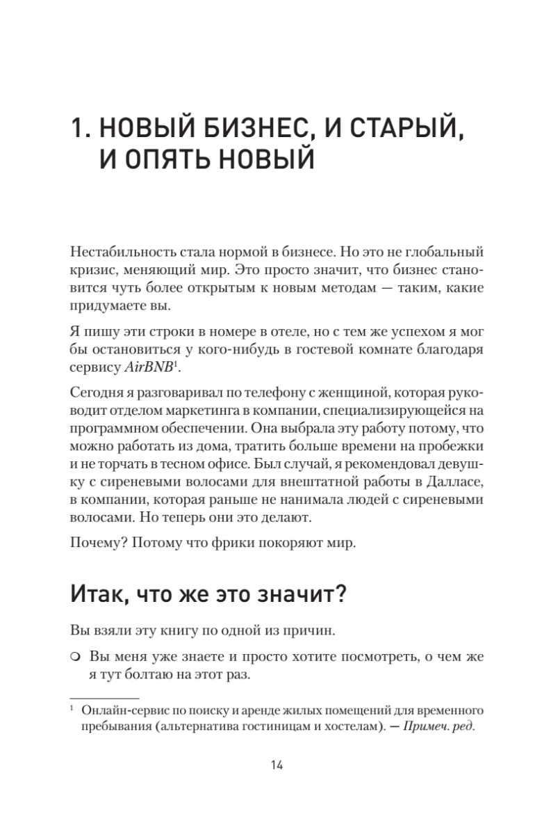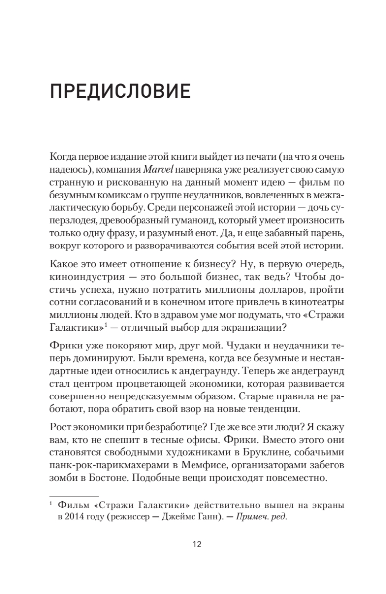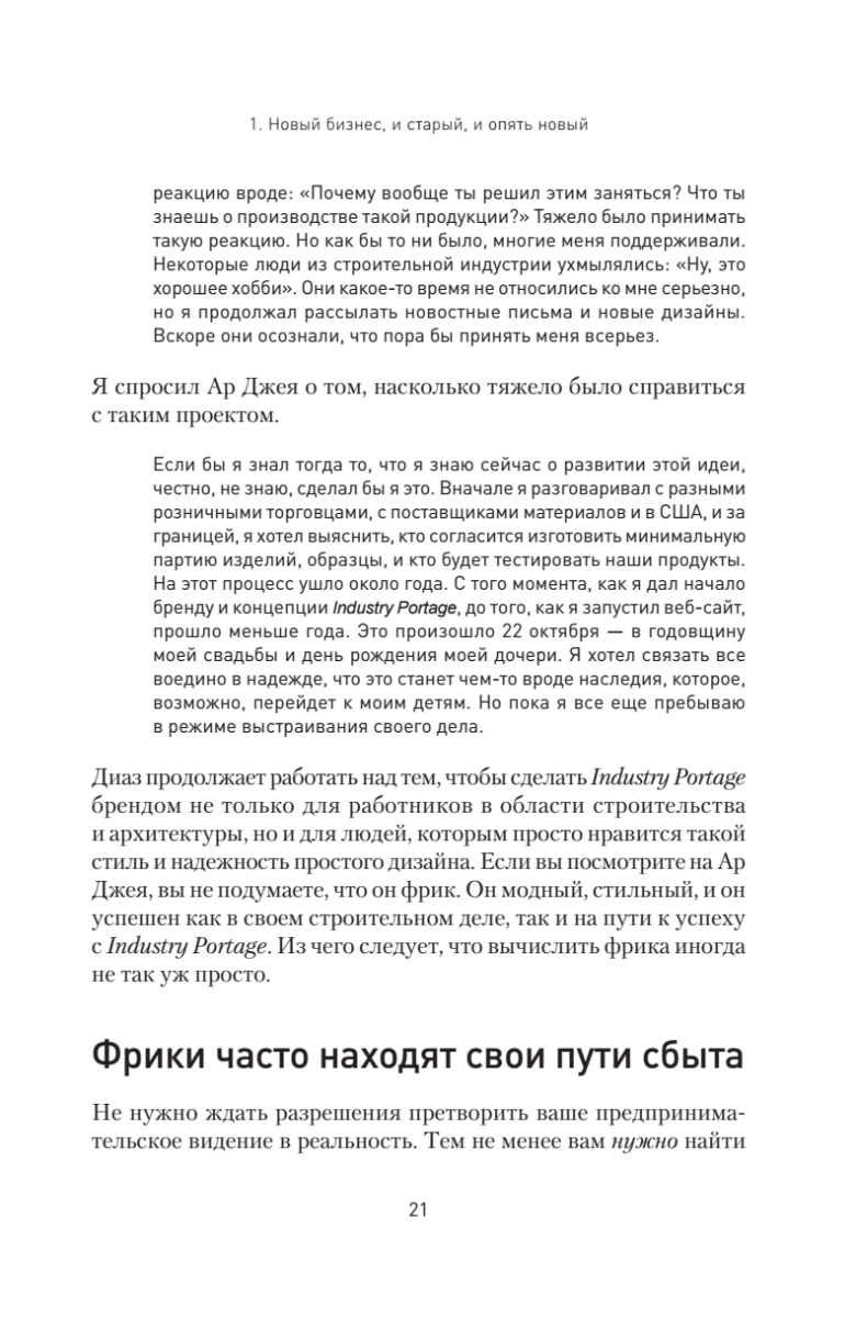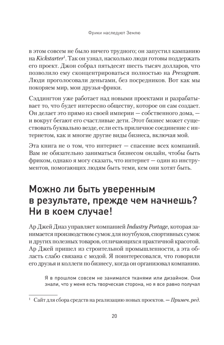 Фрики доминируют и покоряют мир. Были времена, когда все безумные и нестандартные идеи относились к андеграунду. Теперь же андеграунд стал центром процветающей экономики, которая развивается совершенно непредсказуемым образом. Старые правила не работают, пора обратить свой взор на новые тенденции.Эта книга — боевой клич, вера в то, что «я могу это сделать», это необходимая поддержка, особенно если вы ее больше нигде не получаете. Идея очень проста: как вести бизнес по-своему и быть успешным, если ваш образ мышления и цели не совсем обычны? Перестаньте делать то, что не дает результата, и начните делать то, что нужно. Это повысит вашу уверенность и даст понимание того, кем вы на самом деле являетесь, а также поможет определить, как развить наилучший подход для работы с вашими клиентами. Одно из важнейших посланий автора: в старые времена нужно было приспосабливаться, но теперь нужно просто рассмотреть варианты и выбрать то, что вам кажется правильнее всего. Стройте планы и следуйте им. Пытайтесь, а если не получается, пробуйте еще и еще. И побеждайте. Освойте путь, которым шли другие фрики — неординарные люди, умеющие жить и заниматься делом на своих условиях. Вы готовы к ним присоединиться? Вперед, фрики!Издание адресовано всем, кто считает себя фриком и бунтарем, кому всегда приходится все делать по-своему, кто, как правило, не ищет легких путей. Также книга будет полезна собственникам и управляющим небольших компаний, которые ведут дела не так, как диктуют правила.Не стоит уступать и приспосабливаться. Оставайтесь фриком и превратите свою странность в преимущество!