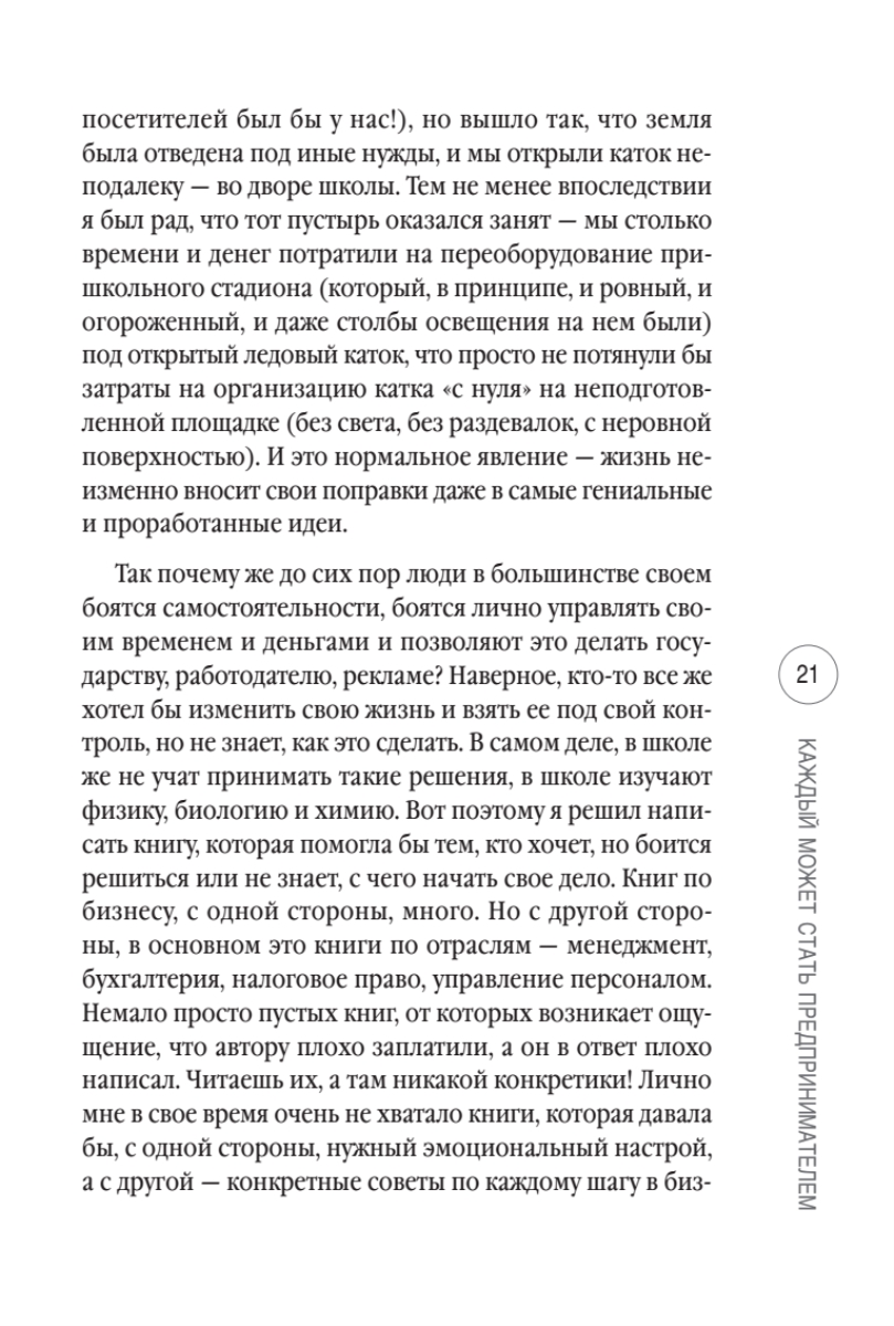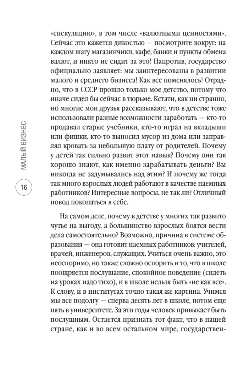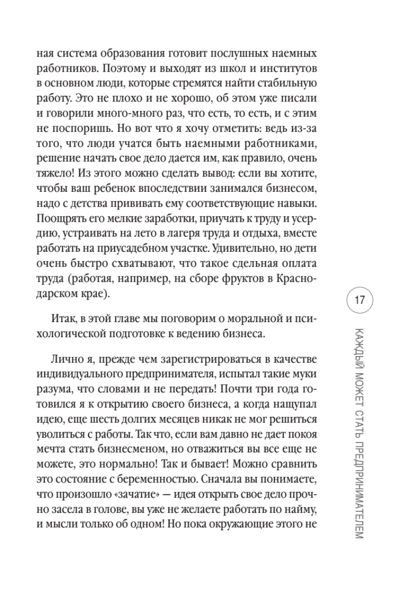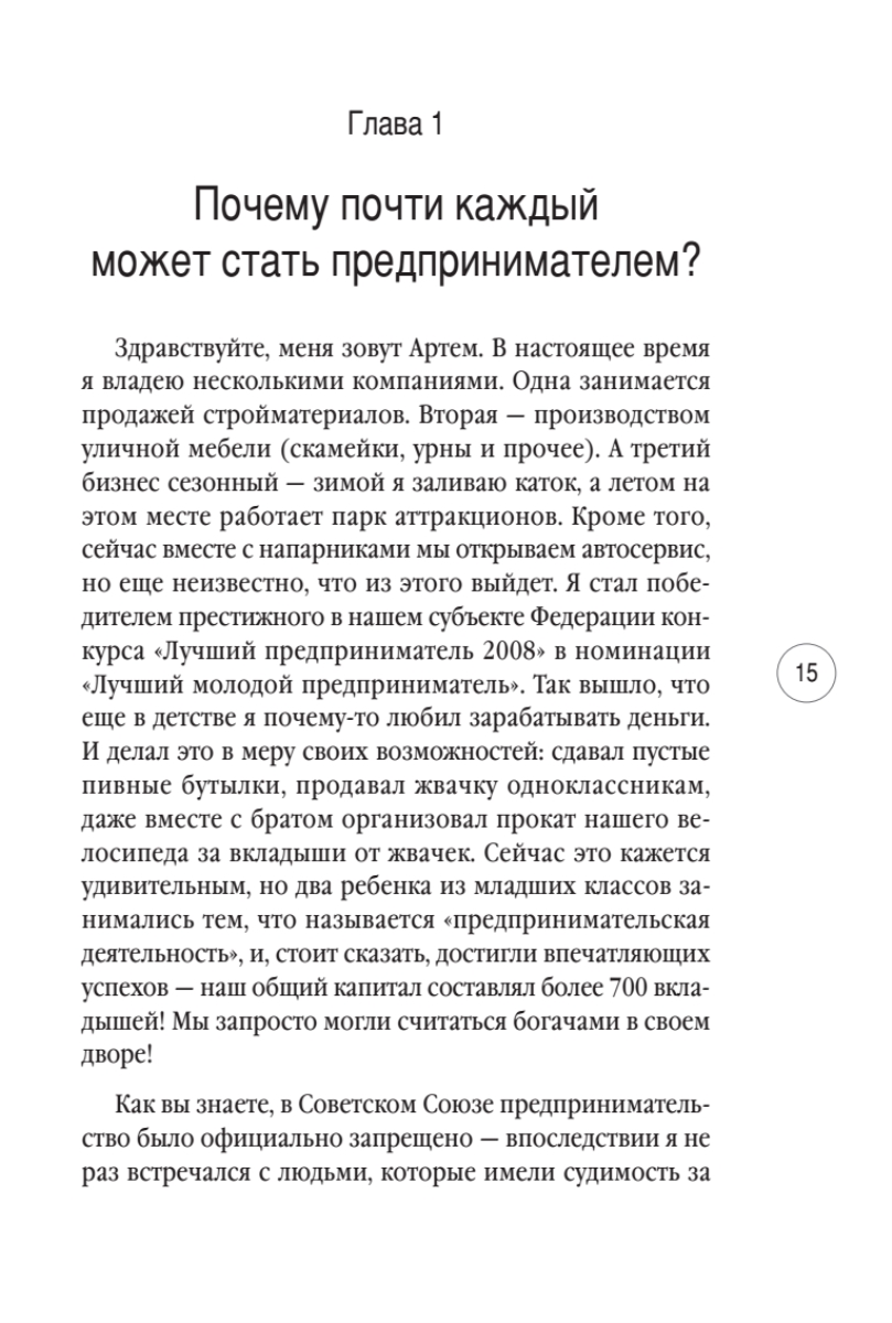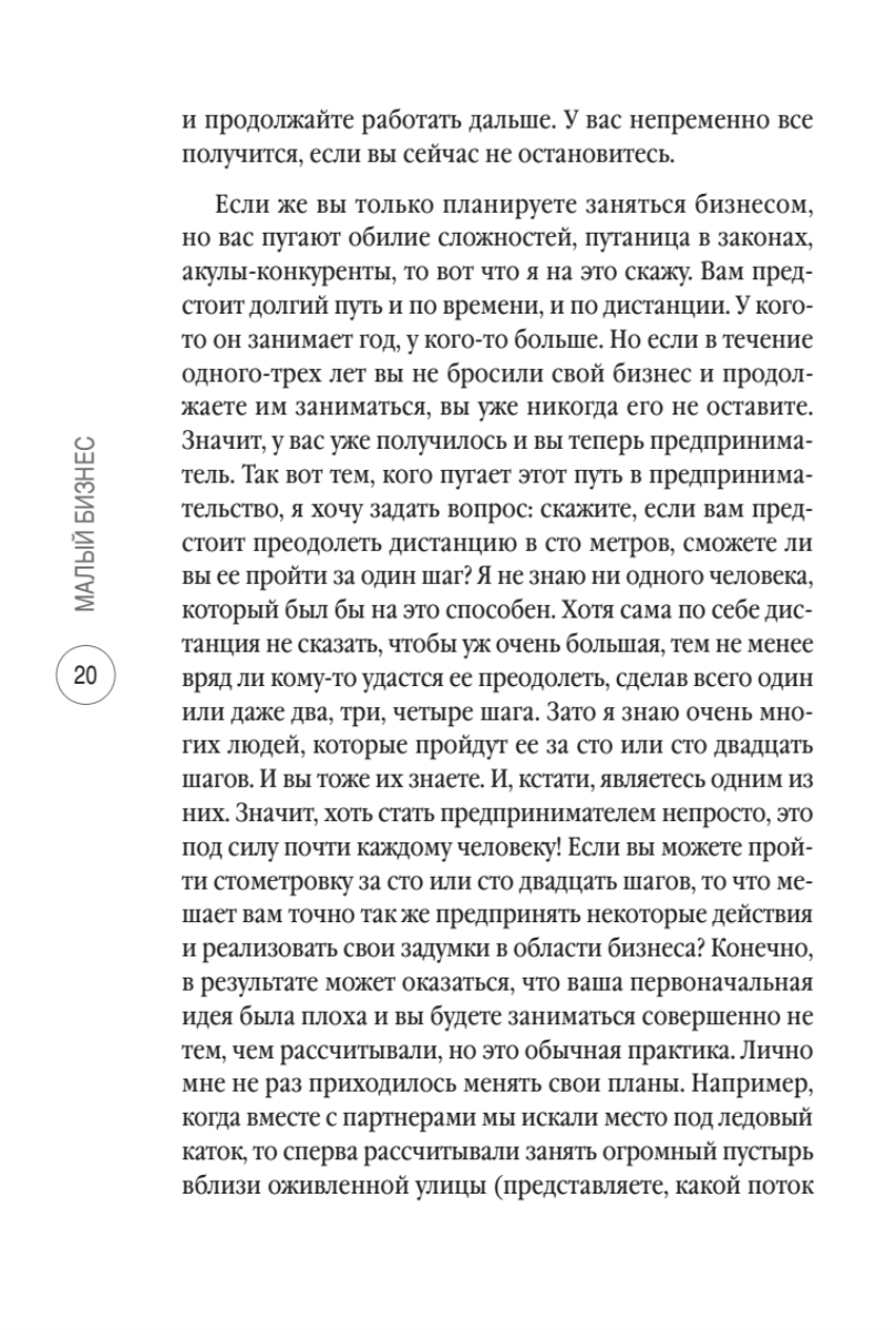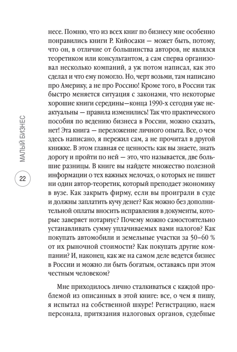 Как начать малый бизнес и преуспеть в нем? В этой книге дается пошаговый план открытия малого предприятия с нуля: поиск идеи, написание бизнес-плана, правильный выбор системы налогообложения, регистрация «ИП» и «ООО», найм сотрудников, управление расходами, организация продаж, оперативное управление и развитие бизнеса и многое другое. Вы найдете истории из реальной жизни, практические советы по ведению бизнеса в различных ситуациях, узнаете, какие ошибки чаще всего совершаются предпринимателями и как их избежать или минимизировать. Получите представление о том, как же на самом деле ведется бизнес в современной России и какие отрасли сейчас наиболее интересны с точки зрения успешности нового предприятия. Книга написана на основе богатого предпринимательского опыта автора, являющегося совладельцем четырех небольших компаний самых разных отраслей (авторемонт, спортивный досуг, торговля стройматериалами) и признанного в 2008 году лучшим предпринимателем Удмуртии. Издание предназначено всем, кто планирует открыть свой бизнес и сделать его успешным.