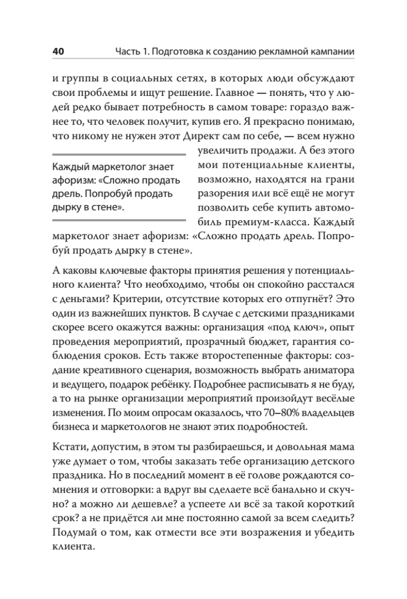 Эта книга не просто пошаговое руководство по созданию и ведению рекламной кампании в Яндекс.Директ, но и возможность заглянуть за кулисы Яндекс.Директ и разобраться в кухне работы директологов.