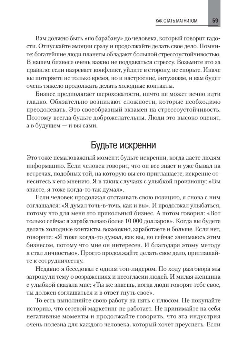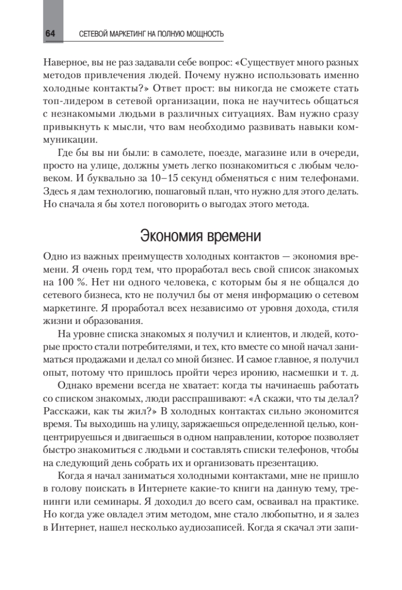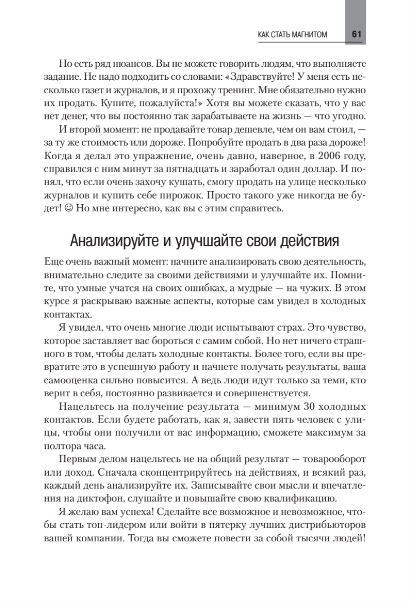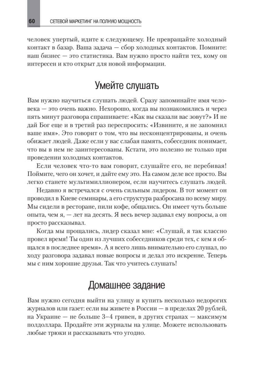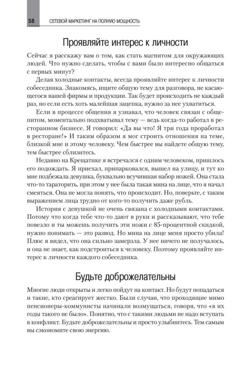 В книге показаны технологии, которые за короткое время приводят к успеху в сетевом бизнесе. Не потому, что они какие-то волшебные. И даже не потому, что автор сам успешно опробовал их на практике. А потому, что они технически очень просты и эффективны и позволяют быстро располагать к себе других людей. Они будут полезны как для новичков, так и для профессионалов. Начинающим бизнесменам нужно будет только брать и внедрять то, о чем рассказано в книге. А профессионалам напомним слова Массимо Бини из Италии: «Любой успешный топ-лидер всегда возвращается к основам». Автор — один из самых известных и успешных специалистов сетевого маркетинга в СНГ. Его называют гением коммуникаций, который может выжить в незнакомом городе без единой копейки. Эта книга — сборник практического опыта, который хорошо себя показал и многих вдохновил на достижение новых целей.