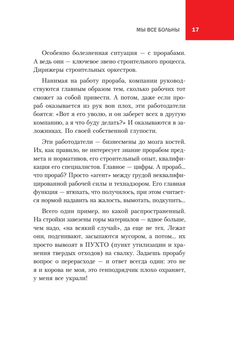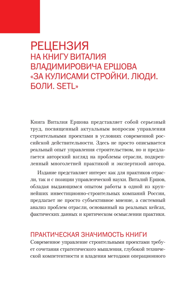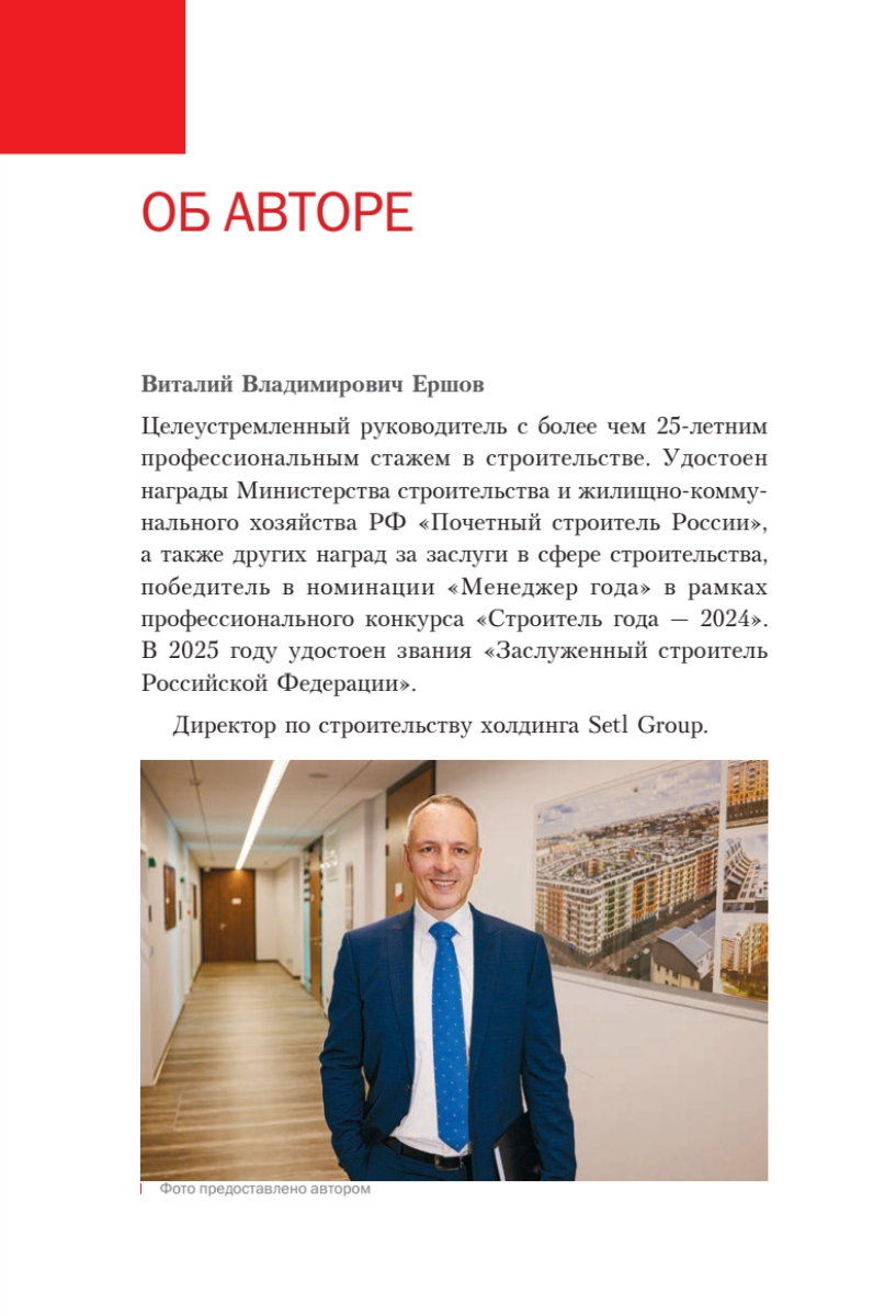 Книга Виталия Ершова, руководителя с 25-летним профессиональным стажем, посвящена ежедневным задачам строительной отрасли. Автор поможет всем причастным, от рабочих и прораба до руководящих инженеров строить высококлассное современное жилье в соответствии с нормами и стандартами, с применением современных разработок и технологий.Основной акцент сделан на кадровой политике, уделено особое внимание опыту компании Setl Group, который заключается в постоянном обучении сотрудников и поддержании квалификации на высоком уровне.Издание адресовано специалистам строительной отрасли, в том числе девелоперам и подрядчикам, желающим расти профессионально. А также будет полезно студентам инженерно-строительных вузов.