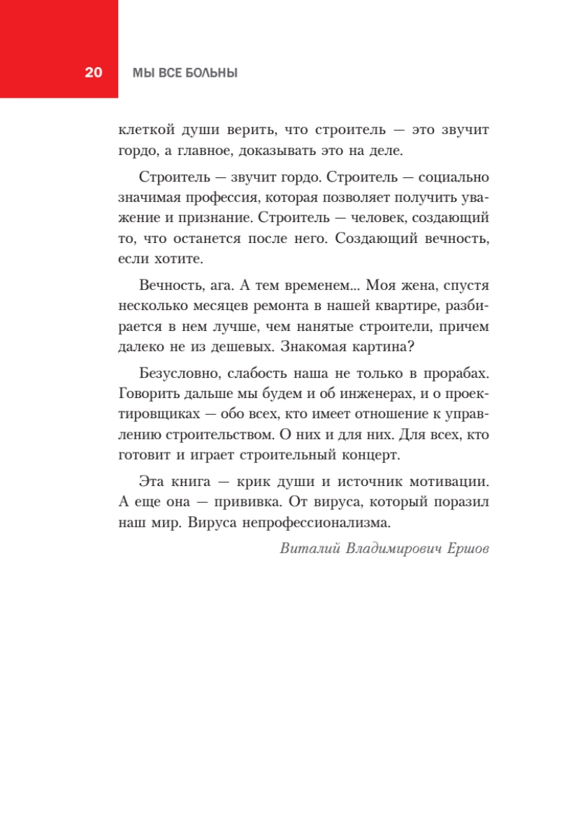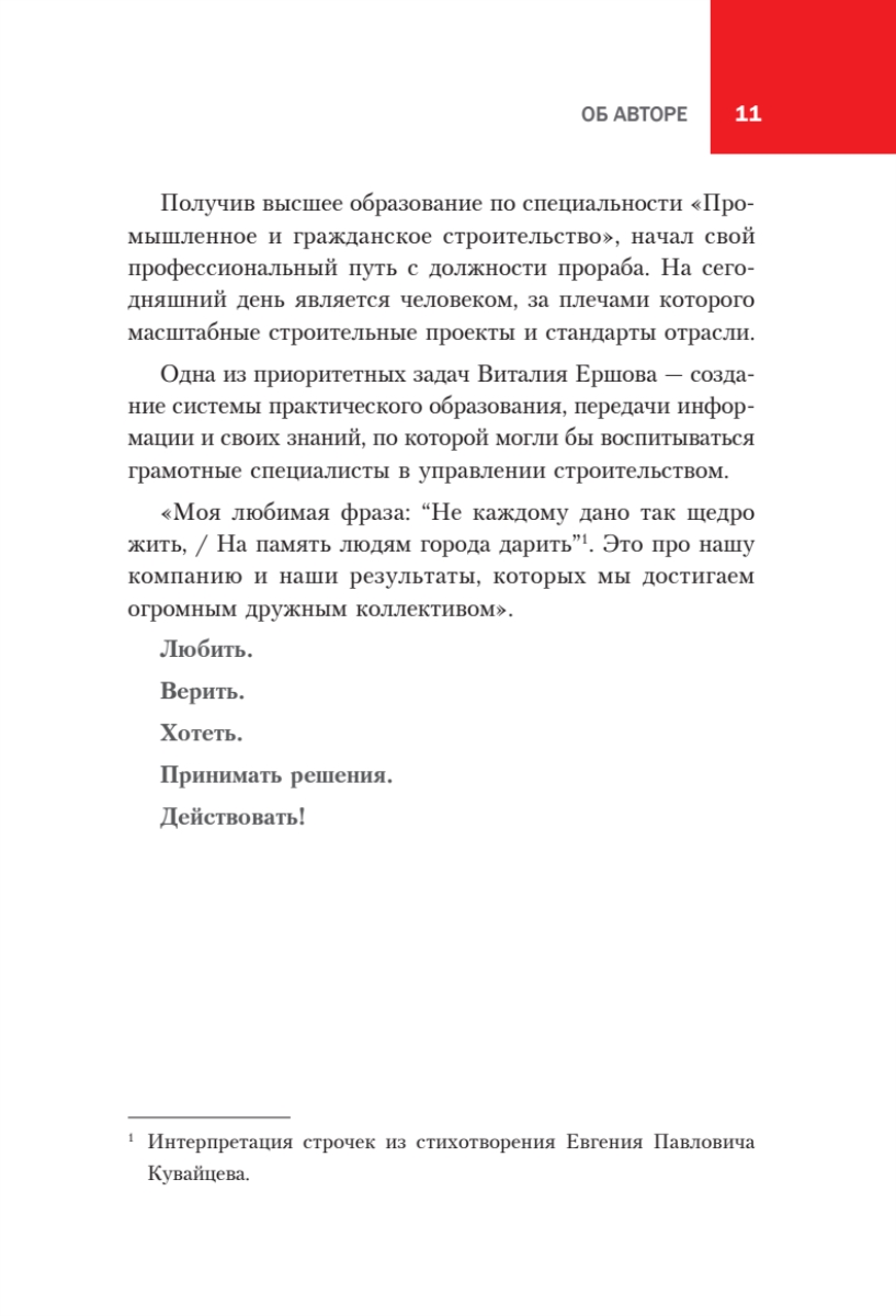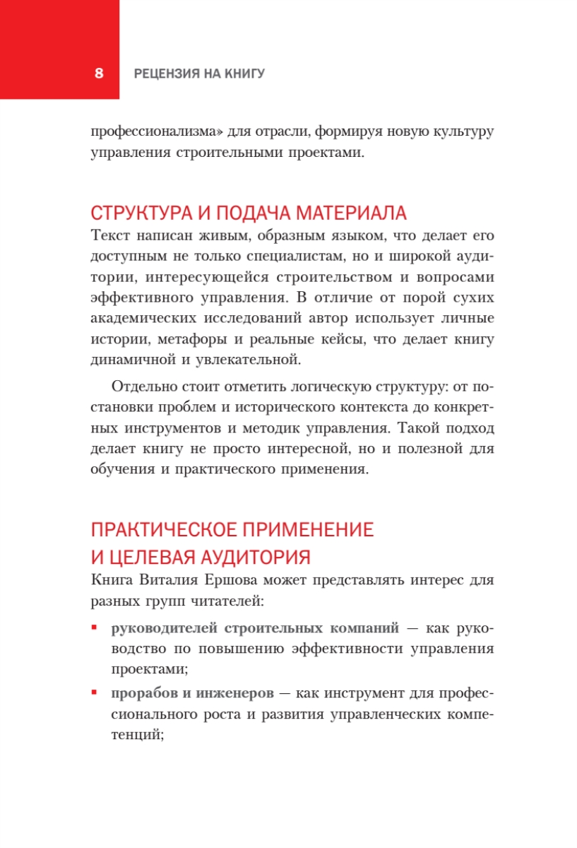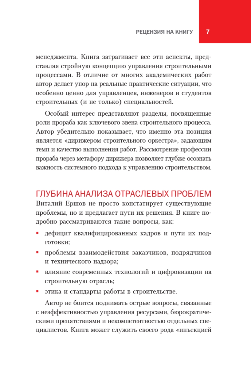 Книга Виталия Ершова, руководителя с 25-летним профессиональным стажем, посвящена ежедневным задачам строительной отрасли. Автор поможет всем причастным, от рабочих и прораба до руководящих инженеров строить высококлассное современное жилье в соответствии с нормами и стандартами, с применением современных разработок и технологий.Основной акцент сделан на кадровой политике, уделено особое внимание опыту компании Setl Group, который заключается в постоянном обучении сотрудников и поддержании квалификации на высоком уровне.Издание адресовано специалистам строительной отрасли, в том числе девелоперам и подрядчикам, желающим расти профессионально. А также будет полезно студентам инженерно-строительных вузов.