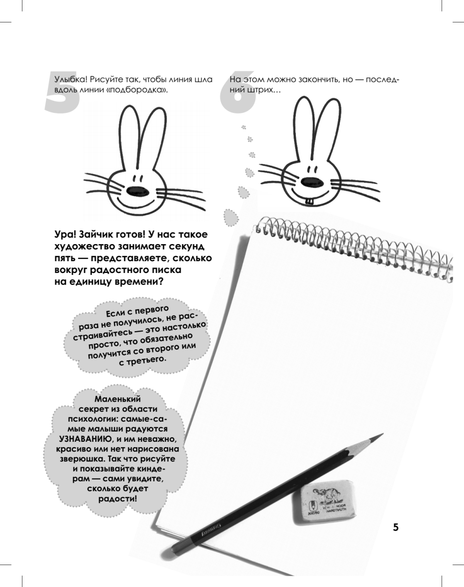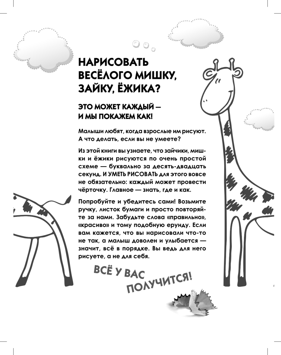 Малыши любят, когда им рисуют. А что делать, если вы не умеете?Ребята постарше любят рисовать сами, но у них не всегда получается. А что делать, если научить некому?Из этой книги вы узнаете, что нарисовать зайчика-мишку-ёжика можно, пользуясь простой схемой, — буквально за десять-двадцать секунд. И УМЕТЬ РИСОВАТЬ для этого вовсе не обязательно: каждый способен провести чёрточку. Главное — знать, где и как. Попробуйте — и убедитесь сами! Возьмите ручку, листок бумаги и просто повторяйте за нами. Забудьте слова «правильно», «красиво» и тому подобную ерунду. Если вам кажется, что вы нарисовали что-то не так, а малыш доволен и улыбается, — значит, всё в порядке: вы ведь для него рисуете, а не для себя.Всё у вас получится!