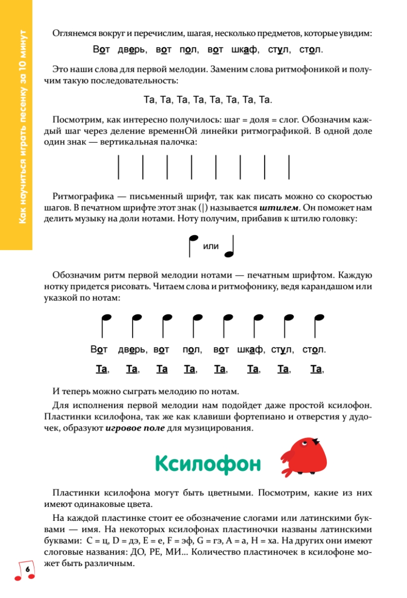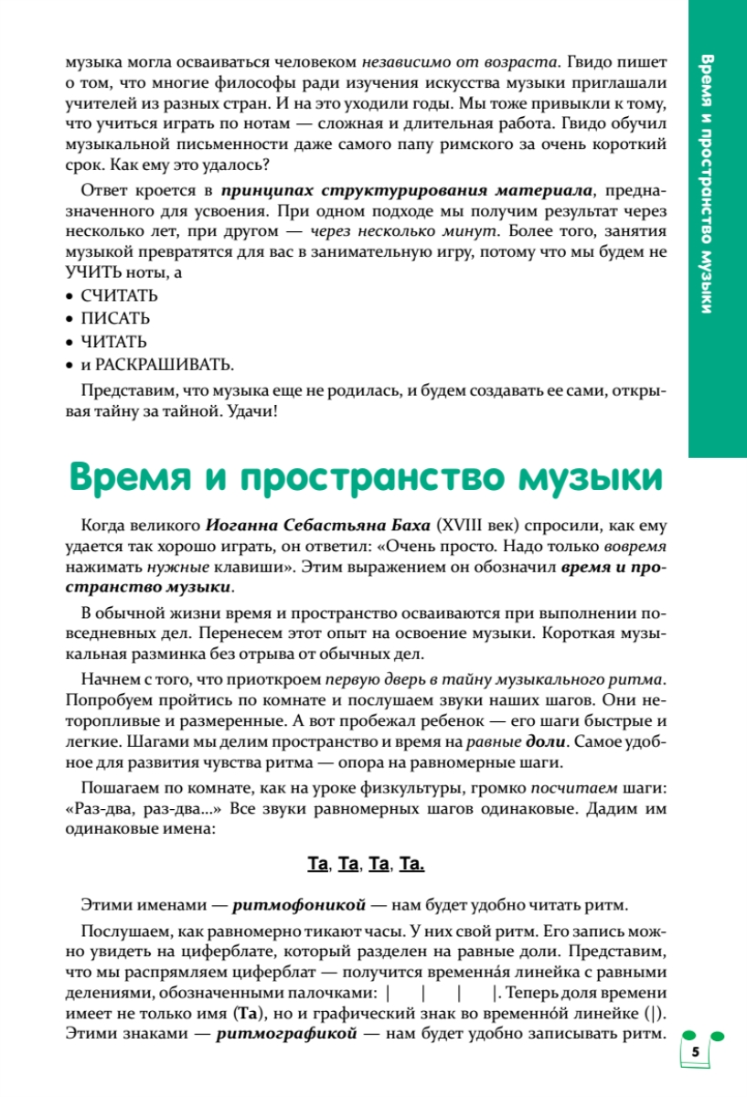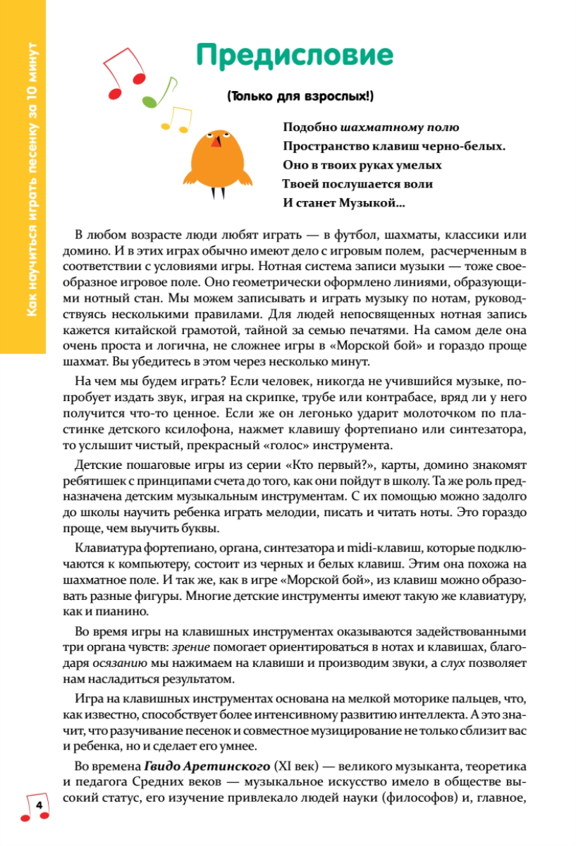 Музыкой можно — и нужно! — заниматься с самыми маленькими детьми, начиная с ясельного возраста, когда малыш еще даже не научился ходить. Музыкальные занятия положительно влияют на настроение и самочувствие детей, развитие внимания, творческих способностей, интеллекта и физической координации. Это самые важные занятия для гармонического развития ребенка!Чтобы музыкальные занятия всегда были для малыша радостью и удовольствием, с ним нужно «играть» в музыку. С помощью этой книги каждый родитель, даже если он совсем не знает нот, сможет разучить с ребенком простые песенки. Причем на любом инструменте — пианино, детском синтезаторе, металлофоне... Никакой учитель так не научит, как мама или папа, бабушка или дедушка. Заодно и вы сами начнете музицировать!«Забудьте, пожалуйста, обо всех медведях и слонах, наступивших на ухо. Просто попробуйте — а я вам помогу!»Нина Александровна Бергер — заслуженный работник высшей школы, доктор искусствоведения, доцент кафедры теории музыки Санкт-Петербургской консерватории им. Н. А. Римского-Корсакова, старший научный сотрудник Учебно-методической лаборатории «Музыкально-компьютерные технологии» РГПУ им. А. И. Герцена.