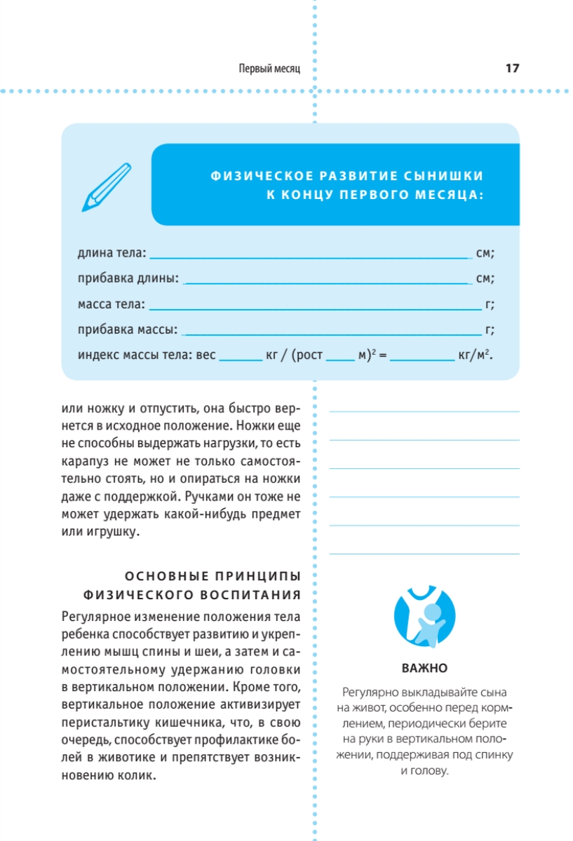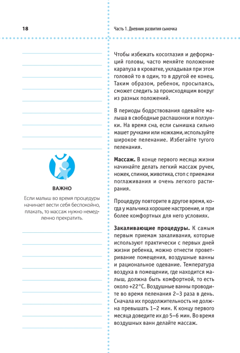 Наш дневник поможет разобраться в том, что происходит с вашим сыночком в первый год его жизни. Вы научитесь не паниковать, если малыш расплакался, не бояться кишечных колик и режущихся зубок. Будете радоваться первой улыбке и задорному смеху сынишки, станете замирать от счастья, услышав первое слово и увидев первые шаги. В дневнике специально предусмотрены странички для записи, чтобы вы могли фиксировать все достижения вашего малыша, контролировать его рост и развитие. Эта книга — уникальный советчик и помощник, а в дальнейшем — семейная реликвия и бесценные воспоминания.