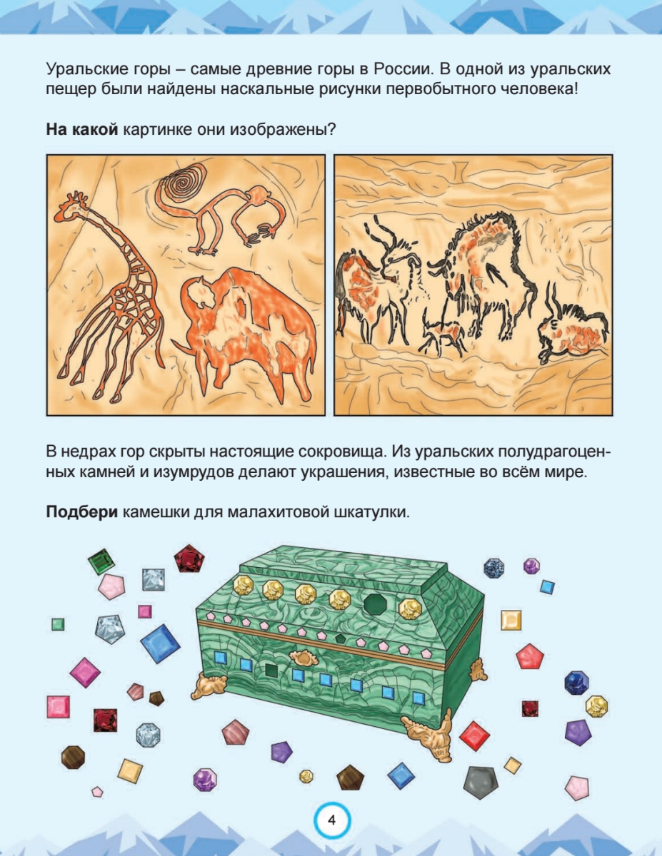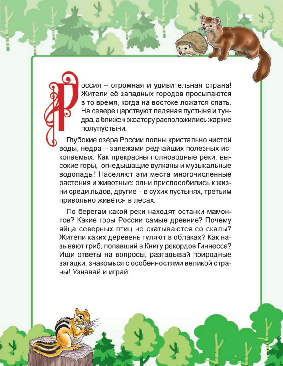 Красива природа России, богата полезными ископаемыми. Горы и вулканы, реки, озёра и моря, леса и степи! Нефть, газ, малахит, алмазы... Здесь поселились ирбис и амурский тигр, бурый медведь и северный олень, чистик и кайра. Всего не перечесть! Решай головоломки, проходи лабиринты, выполняй задания с наклейками. Играй и узнавай всё о природе и богатствах великой России.