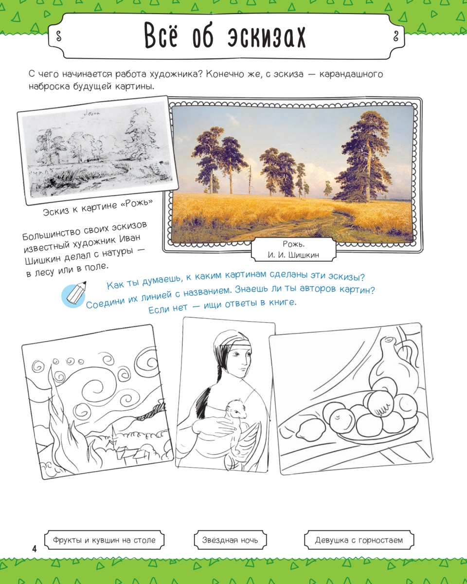 Перед тобой альбом увлекательнейших заданий с трафаретами, наклейками и арт-бумагой. Познакомься с шедеврами великих художников, скульпторов и ювелиров. Нарисуй натюрморт, портрет и пейзаж. Прогуляйся по залам Эрмитажа, Третьяковской галереи. Драгоценными камнями укрась шапку Мономаха. Рисуй, играй и создавай свои шедевры!