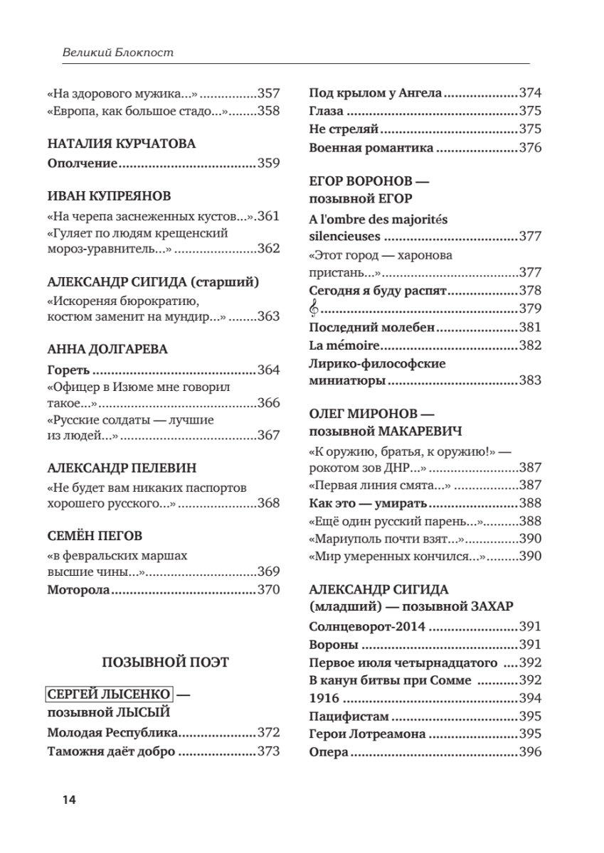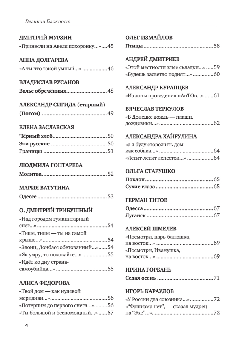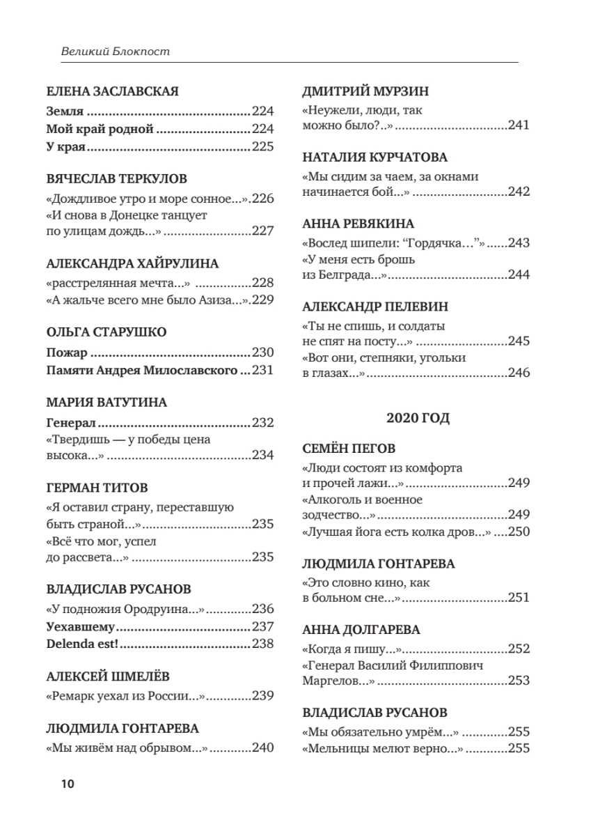 Антология донбасской поэзии «Великий Блокпост» — уникальное явление современной литературы. Сборник собрал под одной обложкой лучшие стихи поэтов Донбасса, созданные в драматический период с 2014 по 2022 год, став, по сути, ярчайшим, искренним и очень эмоциональным отражением хронологии героической борьбы Донбасса за право решать свою судьбу. В антологию вошли произведения и поэтов общероссийской величины и стихи, рождённые в окопах одетыми в камуфляж поэтами-воинами. Не все авторы дожили до появления этой книги, но их искренние строки нашли заслуженное место на её страницах. Нет сомнений, что эта книга станет поистине монументальным памятником не только русской, но и мировой военной поэзии, по которому будущие поколения станут сверять свои идеалы и надежды. Сорок пять русских поэтов, каждый из которых добавил свой голос к звучанию новой поэтической эпохи! Сорок пять русских поэтов, приближающих Победу!