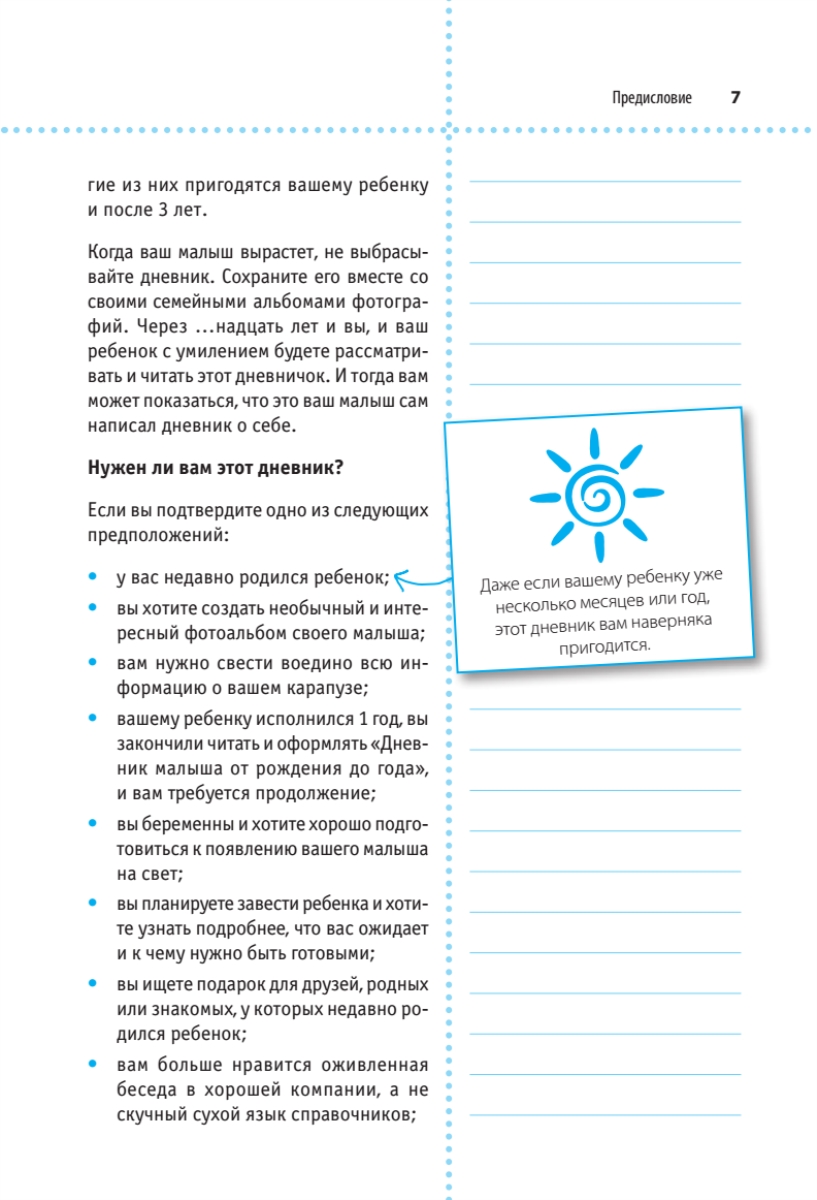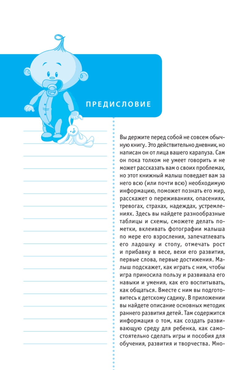 Это не совсем обычный дневник. Местами он напоминает детскую раскраску или даже комикс. Но это же детская книга! Здесь можно все! Написана книга от лица малыша. Этот книжный малыш поведает вам всю необходимую информацию, поможет познать вашего ребенка, расскажет о своих проблемах, переживаниях, опасениях, тревогах, страхах, надеждах, устремлениях.Когда ваш малыш вырастет, не выбрасывайте дневник. Сохраните его вместе со своими семейными альбомами фотографий. Через …надцать лет и вы, и ваш ребенок с умилением будете рассматривать и читать этот дневничок. И тогда вам может показаться, что это ваш малыш сам написал дневник о себе.