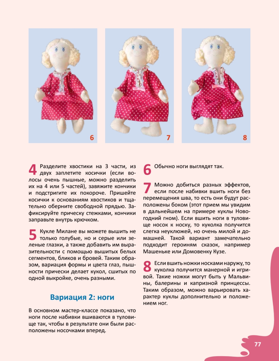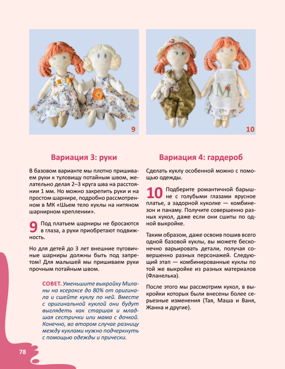 Ийя Чуракова — мама-рукодельница, мастер по вязанию, вышиванию и созданию авторских текстильных кукол и заек, автор популярного сайта и блога mamahobby.com.Именно она придумала чудесных кукол для девочек (и даже мальчиков) всех возрастов. Благодаря подробным мастер-классам их сможет сшить даже новичок. Куколка Фланелька порадует самых маленьких, а эффектная Жанна в потрясающем наряде очарует девочек постарше. Кукла-саше Флорентина станет чудесным подарком друзьям, Новогодний гном и Снеговик удивят ваших близких в зимние праздники, а Ангелы украсят интерьер и создадут гармонию в доме. Тряпичных кукол полюбит вся семья!«Не важно, насколько идеальны строчки и ровно подстрижены волосы кукляшки! Она все равно любима, так как сшита заботливыми и ласковыми руками. Все это отличает мамину куклу от самых дорогих фабричных игрушек. В минуты, когда вы сидите за машинкой или примеряете кукле прическу, — вы творите! Украшаете повседневную суетную реальность и приносите в мир улыбку. И такие минуты — ценность, которую надо беречь. А если вы попросите ребенка помочь или сделать что-то вместе с вами, то проложите мостик от сердца к сердцу». Разные способы создания куколВыкройки игрушек и одеждыПринципы вышивания по объемной фигуреОсновы вязания крючкомРаскрой, шитье и сборка куколОформление лица и прическиШитье и декорирование одежды