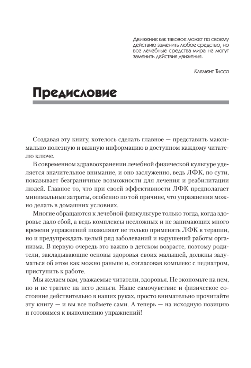 Лечебная физическая культура, или, проще говоря, ЛФК, — это большой комплекс, предназначенный для лечения и профилактики целого ряда заболеваний организма человека. Книга в доступной и понятной форме показывает современные подходы к ЛФК, описывает различные методики ее применения. Авторы последовательно представляют основные упражнения, тесты, комплексы, приводят их описание и комментируют достигаемые в ходе их применения результаты. Некоторые аспекты освещены более подробно, другие приводятся исключительно с ознакомительными целями, поскольку требуют специальной подготовки и знаний.