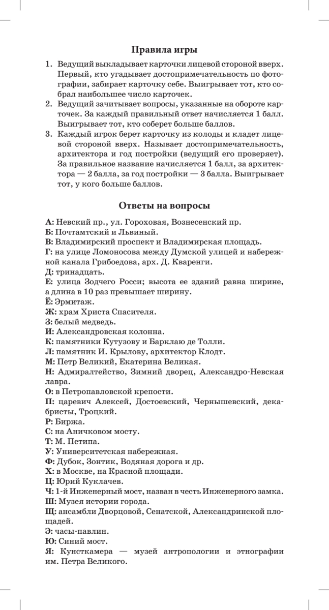 «Петербург от А до Я» — не только сувенирные открытки с интересными фактами. Это забавная азбука-игра по истории северной столицы.Сколько в Петербурге разводных мостов? Почему бронзовый памятник Петру I называется Медным всадником? Какое место в городе именуется «русским Монмартром»?Определяйте знаменитые здания и памятники по фотографиям, вспоминайте даты и архитекторов, отвечайте на каверзные вопросы — и узнавайте новые подробности истории Петербурга.