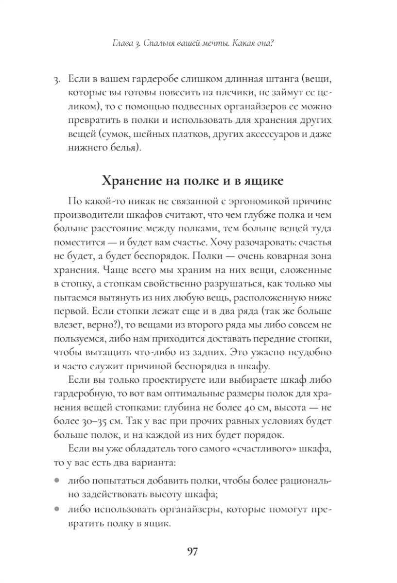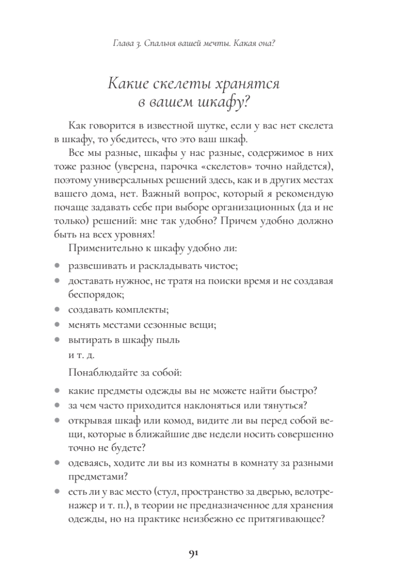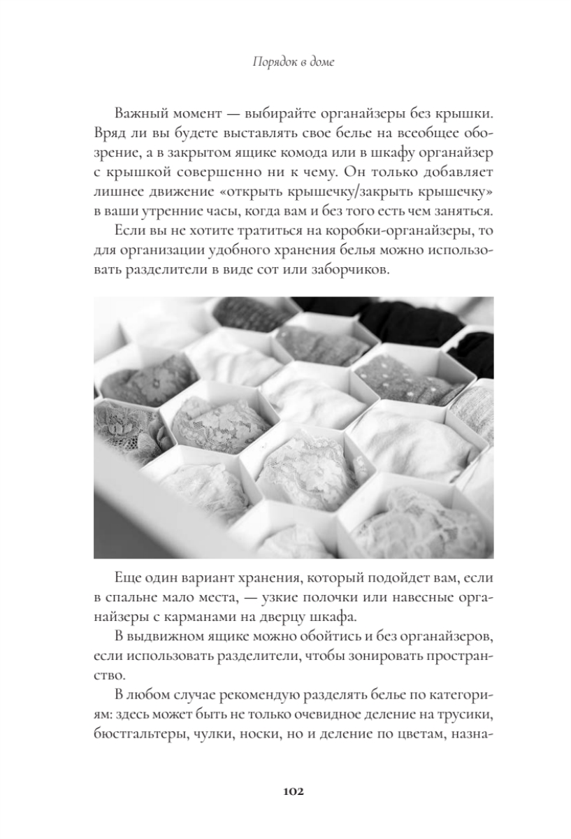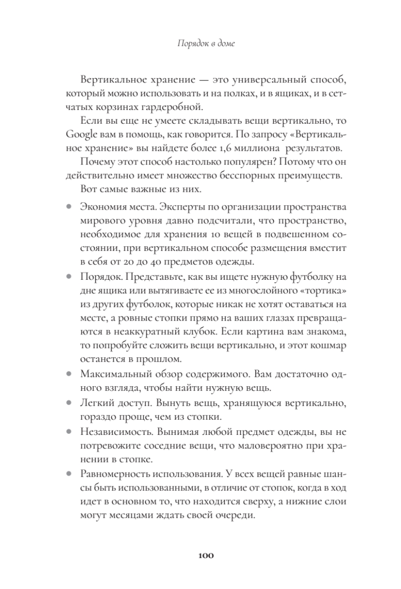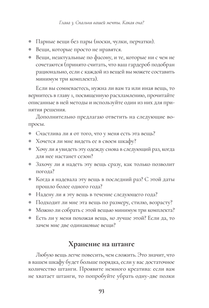 Поддержание порядка. Книга не только помогает навести порядок, но и учит полезным привычкам (правило “вход-выход”, календарь уборки, метод 15 минут), чтобы сохранить результат надолго.