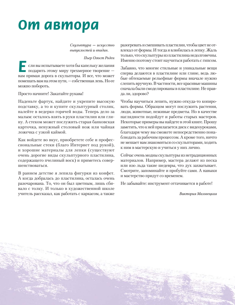 Вы держите в руках книгу, которая раскрывает основы мастерства в скульптуре. Издание предназначено для начинающих скульпторов, причем по нему смогут заниматься как дети, так и взрослые. Уроки доступно изложены и поэтапно проиллюстрированы фотографиями. Кроме того, к книге прилагается видеокурс, просмотрев который вы сможете обучиться основам владения классическими в скульптуре материалами: пластилином, гипсом и глиной.Только от вас зависит, станете вы дальше учиться, добиваясь профессионализма, или просто будете своими руками создавать красивые предметы интерьера для себя или своих друзей. Но пусть эта книга будет первой ступенью и прочным фундаментом на пути к созидательному творчеству и раскрытию вашего таланта.