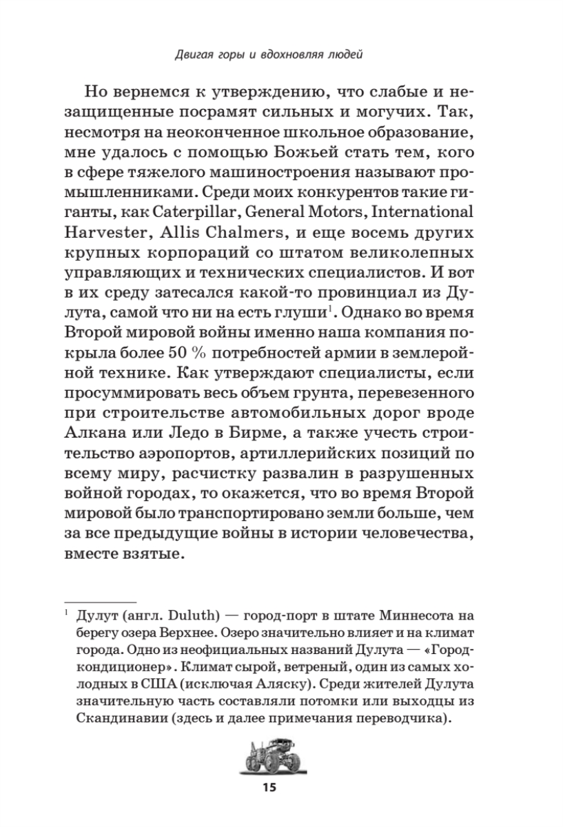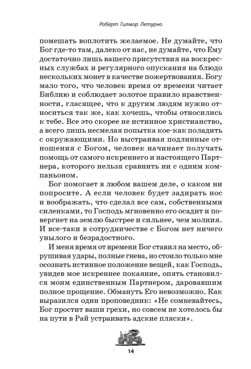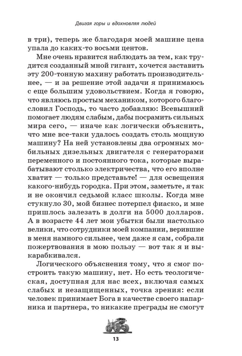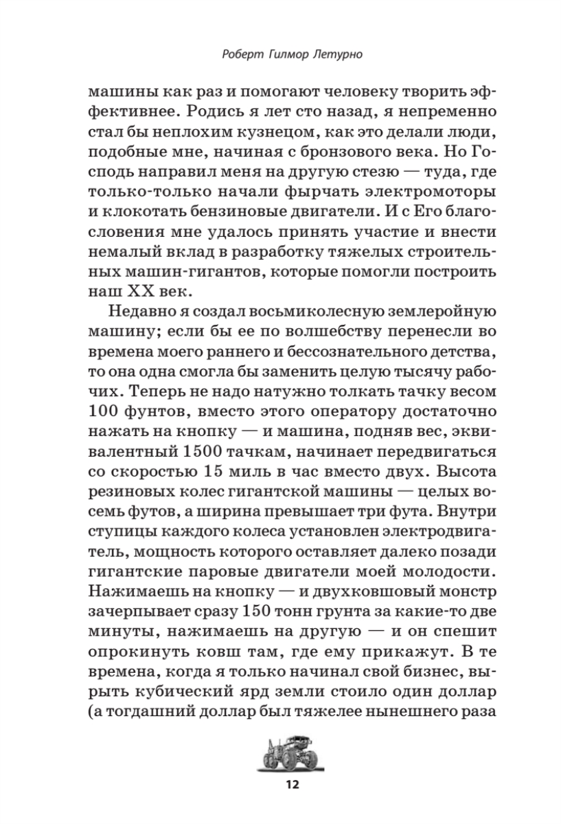 В основе этой книги лежит удивительная история жизни Роберта Гилмора Летурно (1888–1969), выдающегося американского изобретателя, бизнесмена и филантропа. Несмотря на первые неудачи, Летурно поднялся до невероятных высот в конкурентном мире производства машин и строительства. Хотя многие считали его мечтателем, история доказала, что его изобретательский гений на десятилетия опередил свое время. Гигантские бульдозеры, автопоезда и землеройные машины Летурно до сих пор поражают воображение. Со временем во всем мире фамилия Летурно стала синонимом качественной землеройной техники, превратившись в один из американских брендов, как в свое время произошло с фамилиями других выдающихся американцев – Генри Форда, Джона Браунинга, Уильяма Боинга. Летурно создал успешную компанию «R. G. LeTourneau Inc.» по выпуску машин как для мирных строительных задач, так и для военных целей. Кроме того Летурно вошел в историю как основатель LeTourneau University (LETU), одного из лучших технических университетов США. Летурно стал одним из первых, кто соединил высокие технологии и креативнность, этику христианства и практический бизнес-подход.