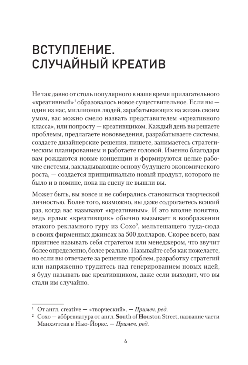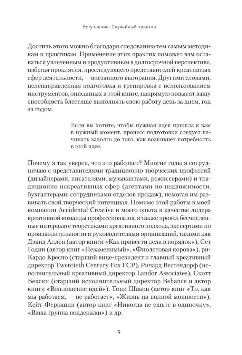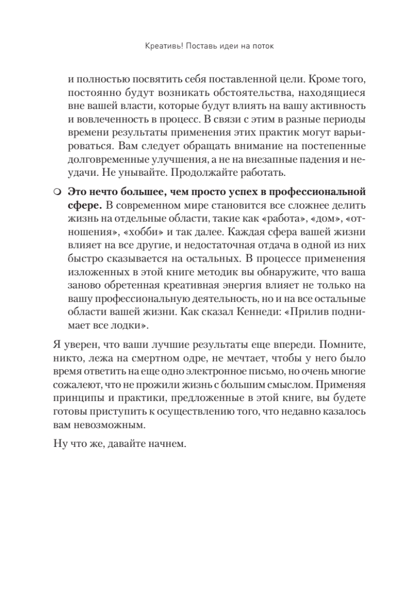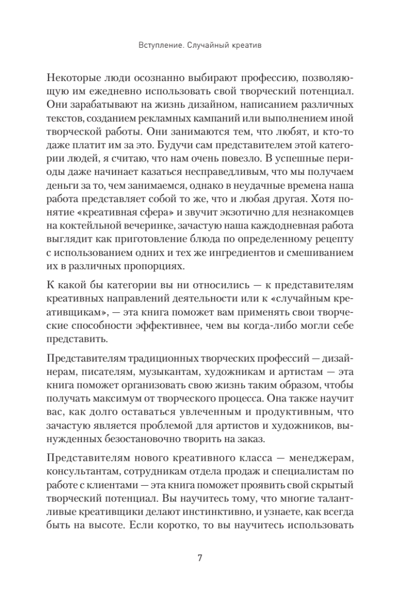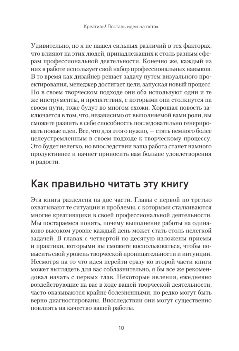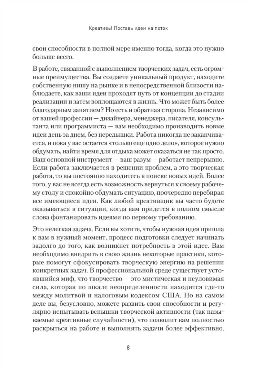 Почему стоит прочесть эту книгуЕсли вы один из миллионов людей, которые зарабатывают на жизнь своим умом, то, возможно, вас называют «креативным». И к какому типу креативных людей вы бы ни относились, эта книга поможет делать работу быстрее и эффективнее, чем вы когда-либо могли себе представить.Уникальность книгиПредложенные методы действительно работают, ведь в основу книги положена многолетняя практика консультирования представителей творческих профессий (дизайнеров, писателей и музыкантов), а также совершенно нетворческих (продавцов, агентов по недвижимости, бухгалтеров). В дополнение к этому проведены бесчисленные интервью с руководителями компаний и экспертами по производительности.Чем понравилась эта книгаПрименяя предлагаемые принципы и практики, вы сможете достичь в своей жизни таких вещей, которые раньше казались недостижимыми, станете более продуктивными, не боясь испытать безудержного выгорания, что часто отравляет жизнь творческих работников. Целенаправленная подготовка и обучение с помощью инструментов, представленных в книге, будет увеличивать количество ваших блестящих работ день за днем, год за годом.От автора:«Помните, никто, лежа на смертном одре, не мечтает, чтобы у него было время ответить на еще одно электронное письмо, но очень многие сожалеют, что не прожили жизнь с бóльшим смыслом.»Генри ТоддКнига подойдет• Дизайнерам, писателям, художникам, музыкантам и исполнителям — благодаря этой книге можно выстроить свою жизнь так, чтобы получать максимальную отдачу от творческого процесса.• Менеджерам, стратегам, консультантам, продавцам и специалистам по обслуживанию клиентов — издание поможет разблокировать скрытые творческие способности и подскажет, как быть блестящим, когда это крайне необходимо.ОтзывыБесценно для тех, кто задумывается о жизни.Сет Годин, автор книги «Незаменимый. Можно ли без вас обойтись?»Советы Генри по максимальной производительности представляют собой прозорливые, инновационные и в высшей степени практичные рекомендации. А книга «Креативь» – это высокооктановое топливо для творческой продуктивности.Стивен Прессфилд, автор книги «Война за креатив. Как преодолеть внутренние барьеры и начать творить»Не стоит растрачивать впустую свой творческий дар! Тод Генри подготовил руководство, которое обагатит ваши творческие поиски. Не пытайтесь фантазировать без него.Скот Белски, основатель и СЕО Behance, автор книги «Воплощение идей. Как преодолеть разрыв между видением и реальностью»Существует две версии вас: вы до чтения книги Тода и вы сразу после нее, заряженные на 100 процентов. Подводя итог, скажу, что «Креативь. Поставь идеи на поток» предлагает вдохновляющее видение того, каким образом лучше всего реализовать свой креативный потенциал в реальном мире.Рикардо Креспо, старший вице-президент/ креативный директор 20th Century Fox (FCP)Эта книга действительно пробуждает ото сна и открывает жизнь, наполненную сюрпризами и выгодой, а в этом и состоит смысл креативности. Книга содержит мудрые советы, упражнения и рекомендации, которые помогут нам успокоиться и сосредоточиться в мире, полном отвлекающих факторов.Питер Блок, автор книги «Сообщество»Каждому, кто начинает свой бизнес или уже является генеральым директором, необходимо прочитать «Креативь. Поставь идеи на поток». В к