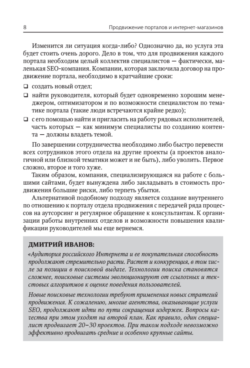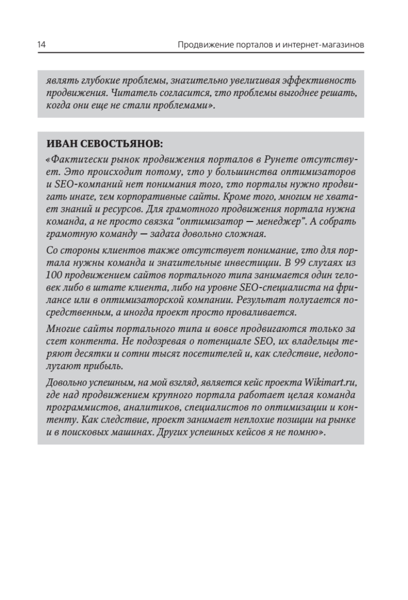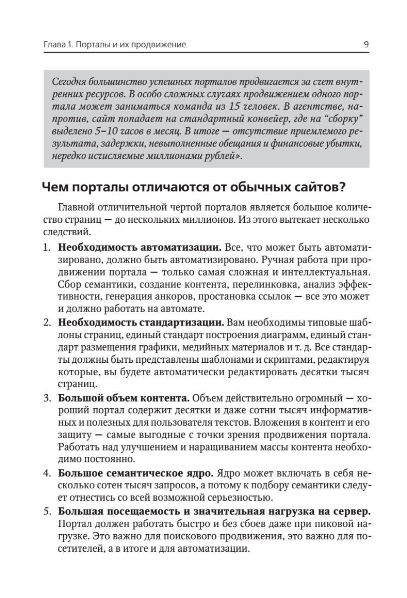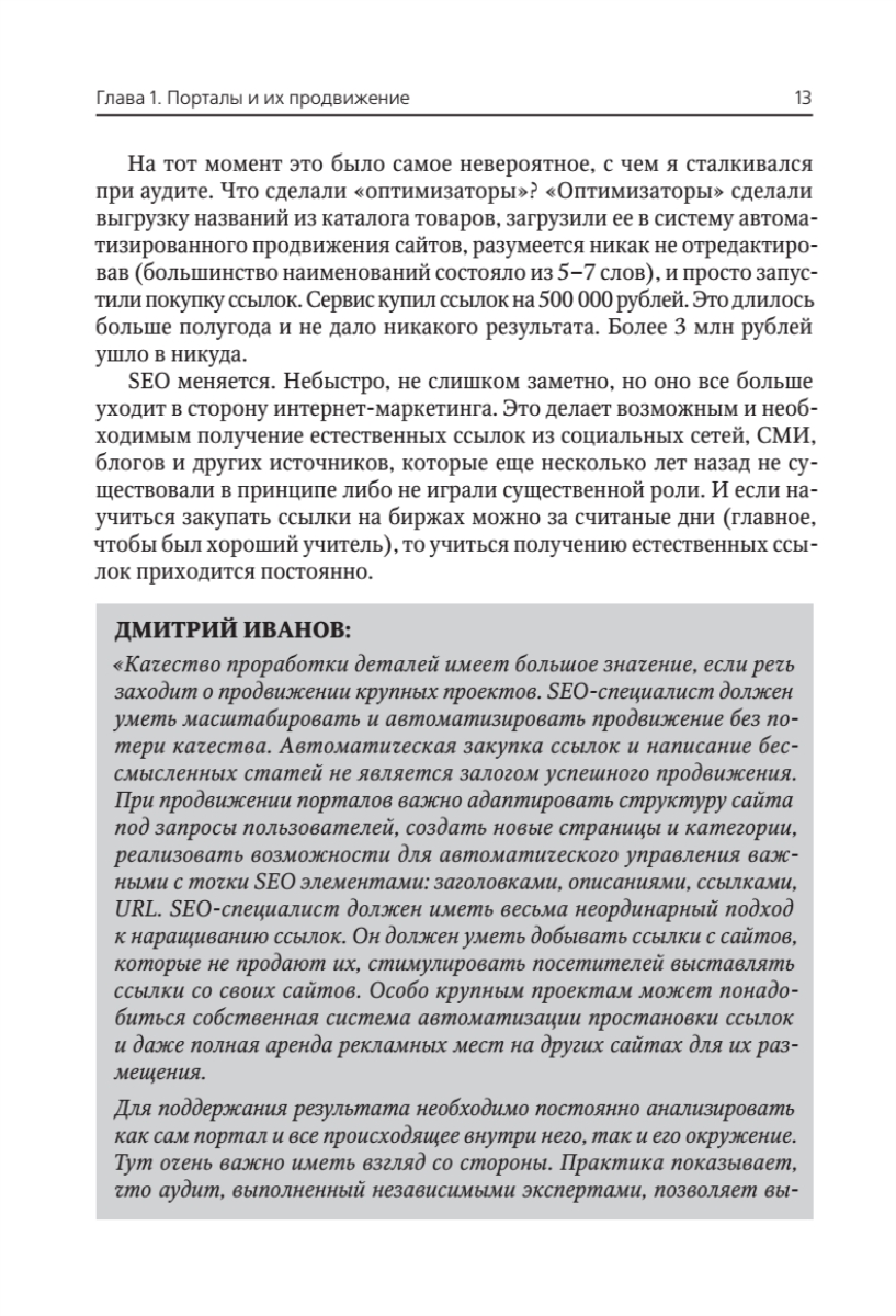 Эта книга о том, как продвигать большие сложные проекты. Здесь рассмотрено SEO в самом широком понимании, включая не только информационный поиск, но также PR, маркетинг и работу с контентом вообще. Подробно описываются технологии и подходы, которые непопулярны на рынке. Она о том, как продвигать сайт командой, провести исследование, разработать стратегию и внедрить разработанные технологии в работу. Книга будет интересна настоящим и будущим владельцам или руководителям больших интернет-магазинов и порталов, руководителям отделов продвижения, специалистам, а так же всем кто интересуется SEO.
