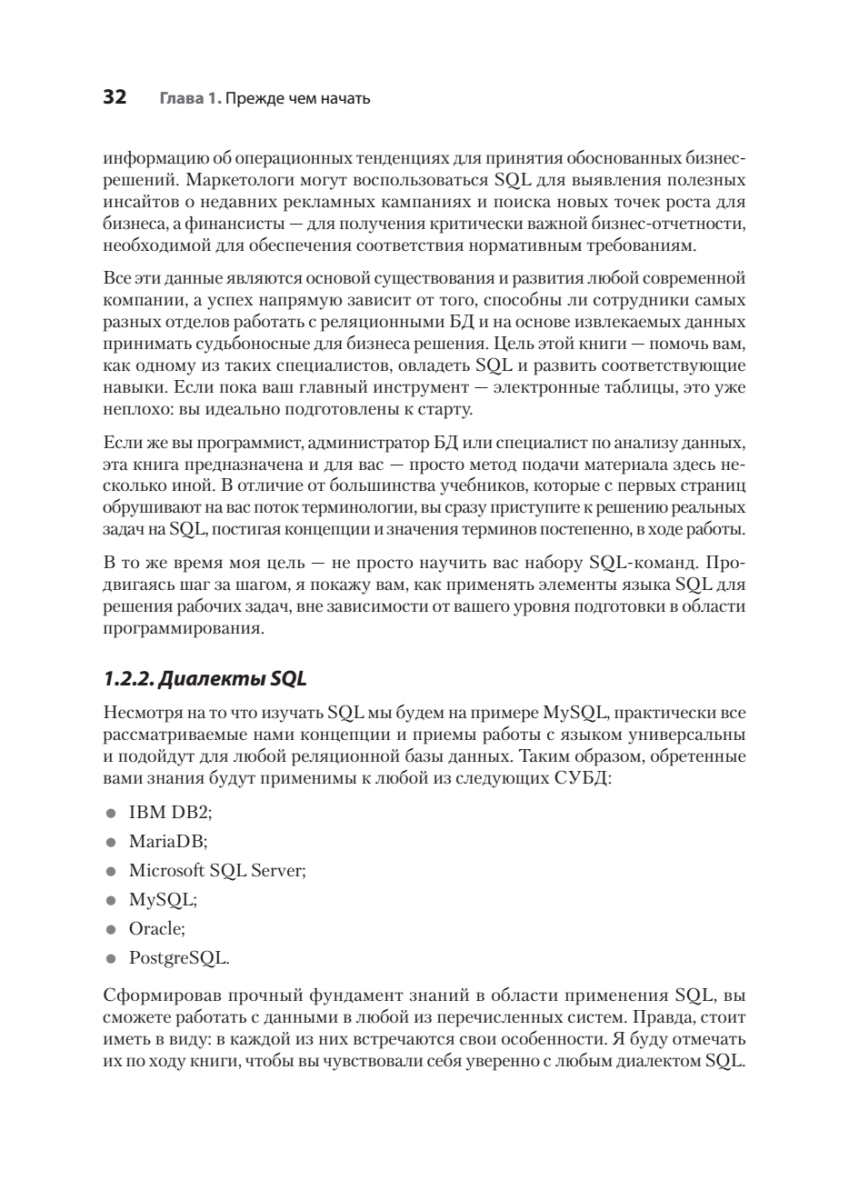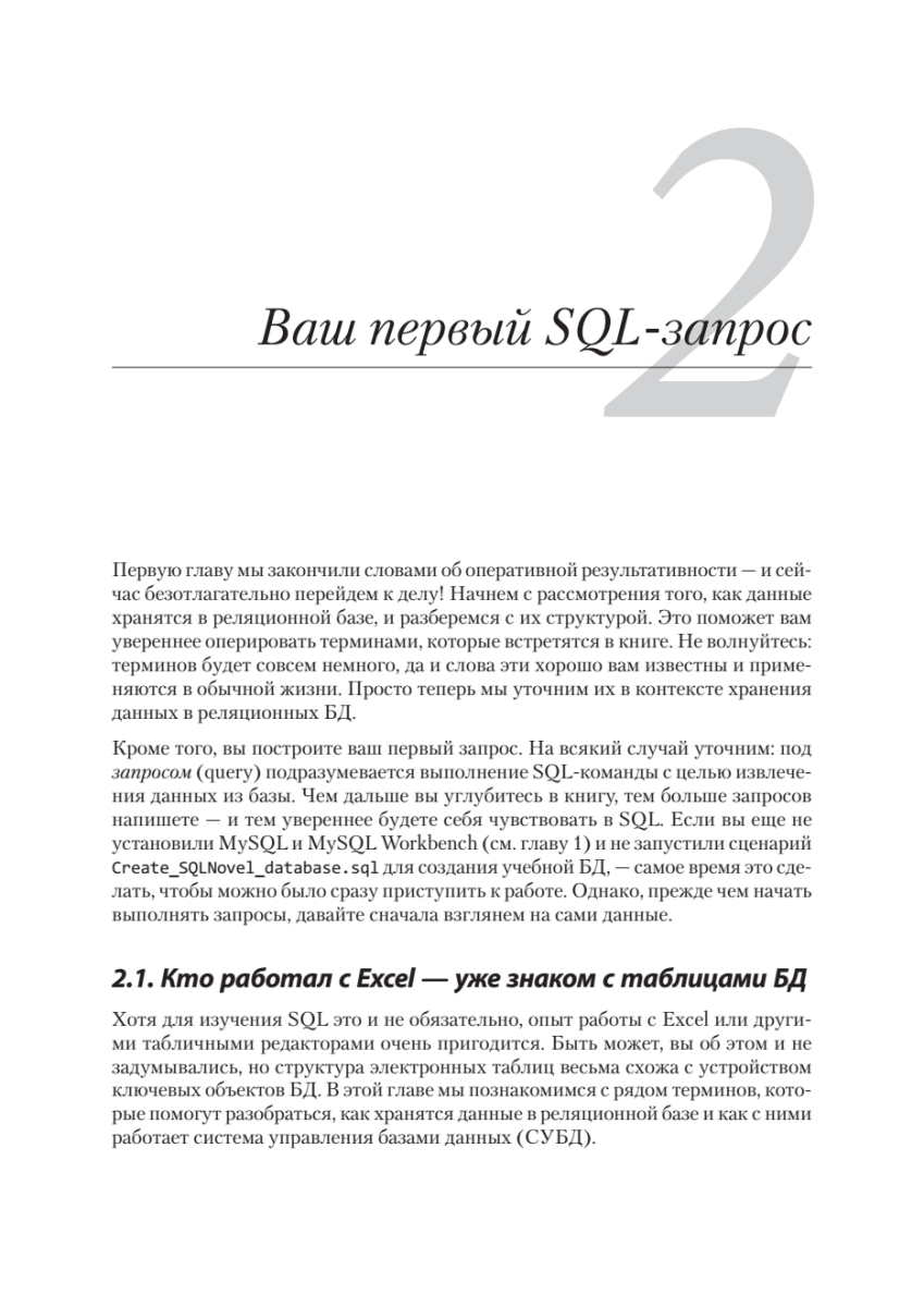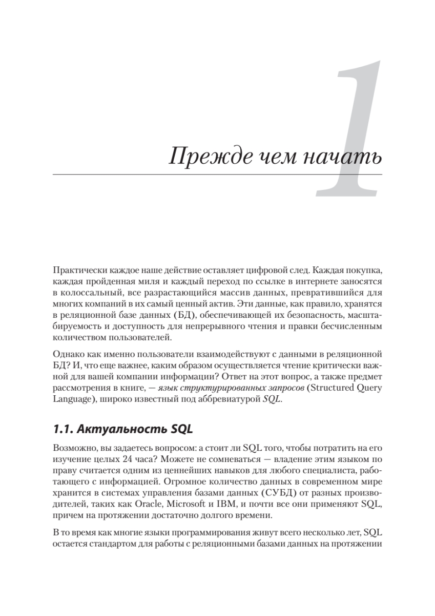 SQL, «структурированный язык запросов» (Structured Query Language) — это универсальное средство создания, управления и составления запросов к реляционным базам данных, таким как SQL Server, PostgreSQL и Oracle. Для аналитиков данных SQL — суперинструмент, позволяющий выйти за пределы обычных табличных редакторов и систем бизнес-аналитики. При этом язык SQL интуитивен и на удивление прост: немного практики во время чтения книги — и вы уже с легкостью извлекаете данные, перестраиваете таблицы и создаете яркие, наглядные отчеты и презентации!
