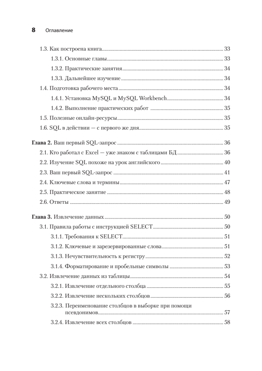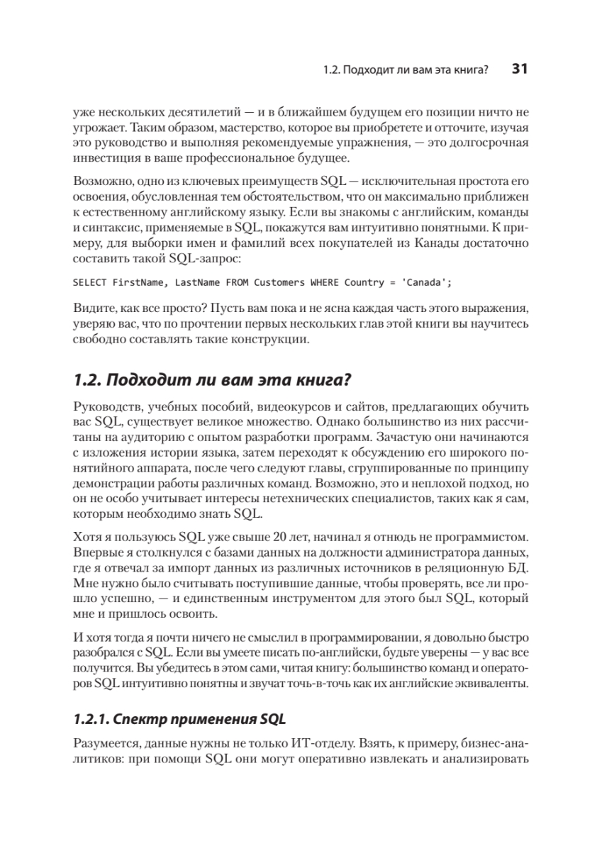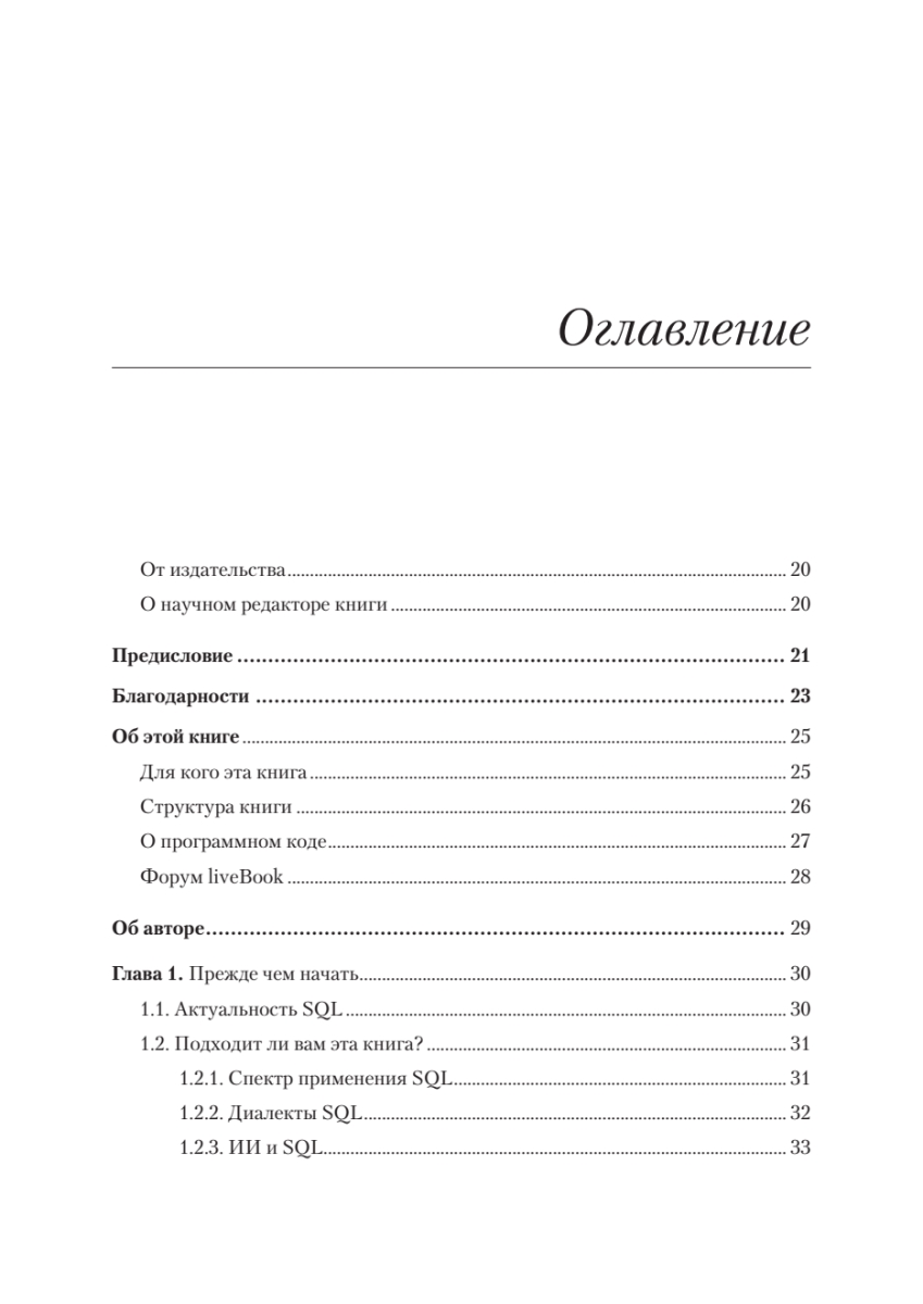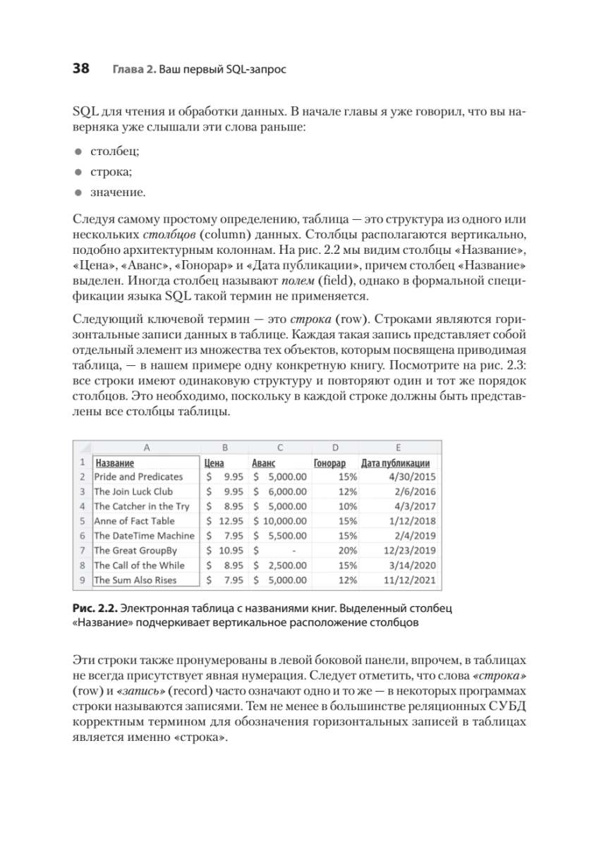 SQL, «структурированный язык запросов» (Structured Query Language) — это универсальное средство создания, управления и составления запросов к реляционным базам данных, таким как SQL Server, PostgreSQL и Oracle. Для аналитиков данных SQL — суперинструмент, позволяющий выйти за пределы обычных табличных редакторов и систем бизнес-аналитики. При этом язык SQL интуитивен и на удивление прост: немного практики во время чтения книги — и вы уже с легкостью извлекаете данные, перестраиваете таблицы и создаете яркие, наглядные отчеты и презентации!