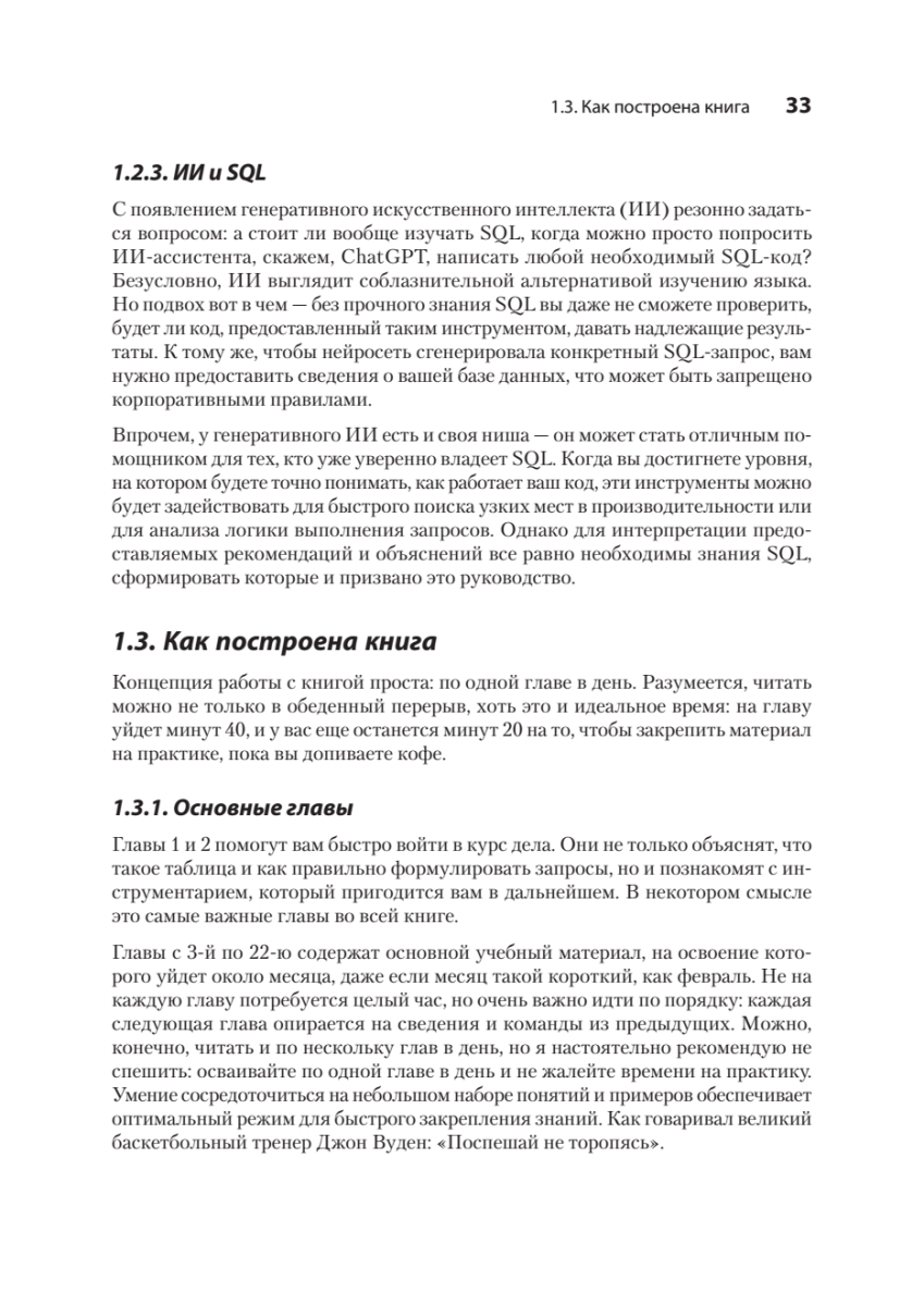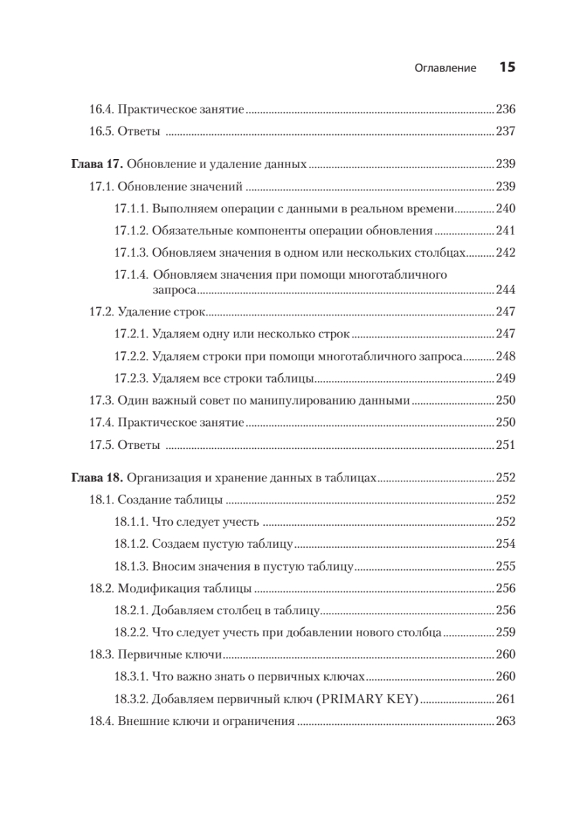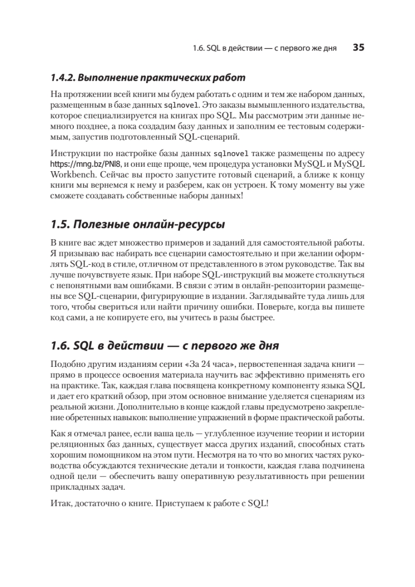 Книга предназначена для аналитиков данных и начинающих специалистов в сфере информационных технологий, включая тех, кто не имеет ни малейшего опыта работы с реляционными базами данных. В ней вас ждут 24 компактных урока, посвященных ключевым аспектам владения языком SQL, таким как извлечение, фильтрация и обработка данных. Каждый урок завершается практической работой, рассчитанной примерно на 15 минут. Вы и не заметите, как научитесь составлять эффективные запросы, возвращающие именно те данные, что вам нужны. Постепенно у вас сформируется ценное интуитивное понимание того, как базы данных функционируют в реальных бизнес-сценариях.