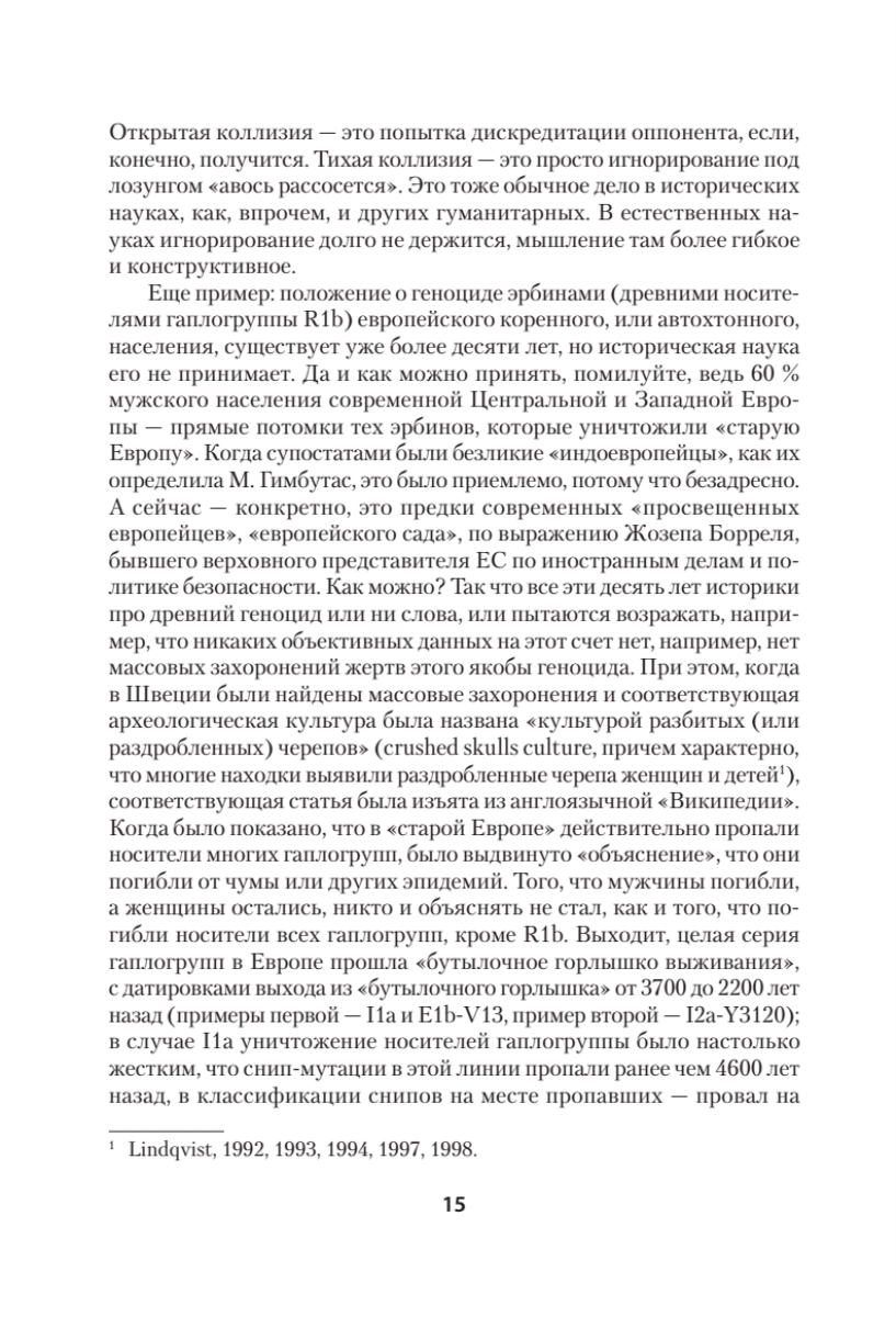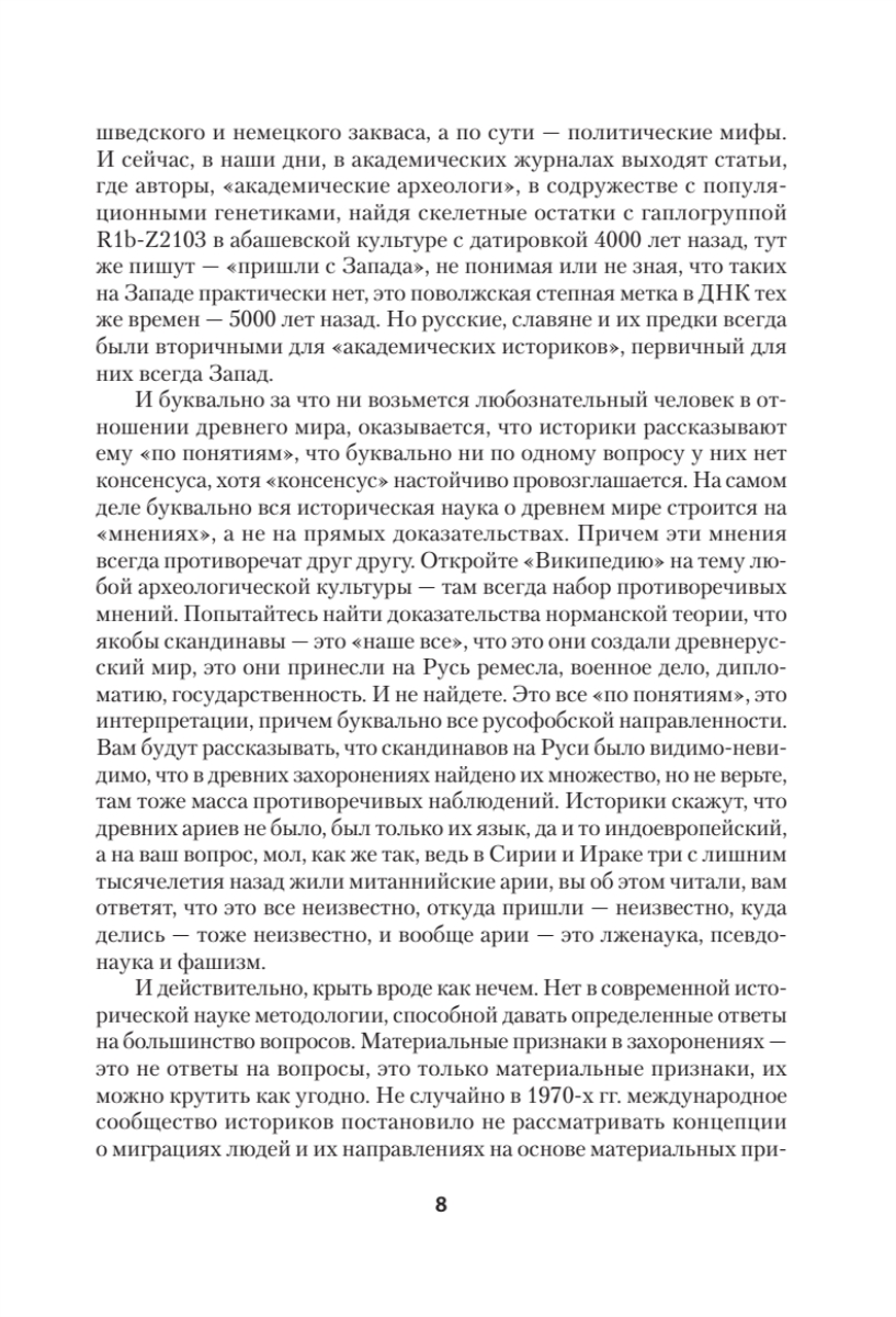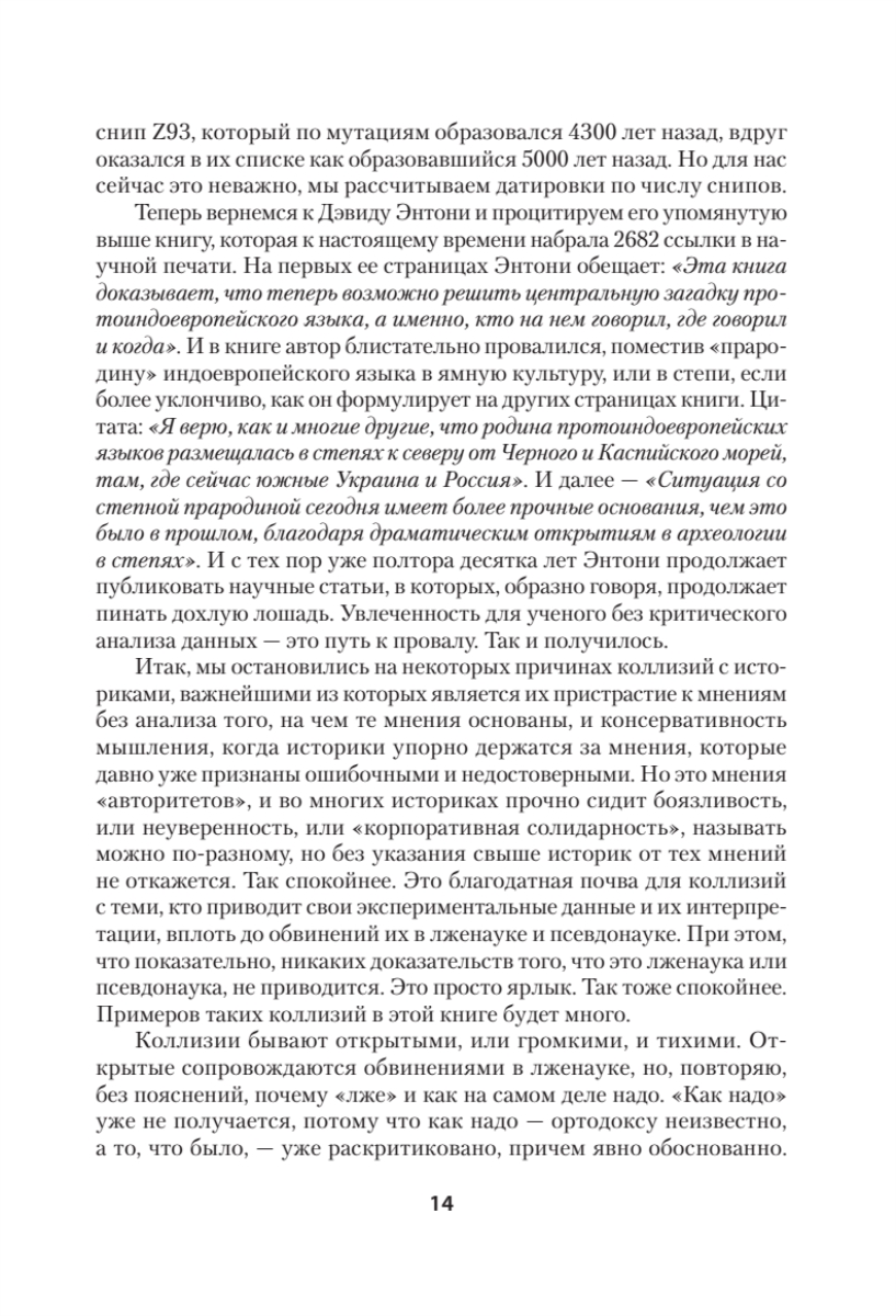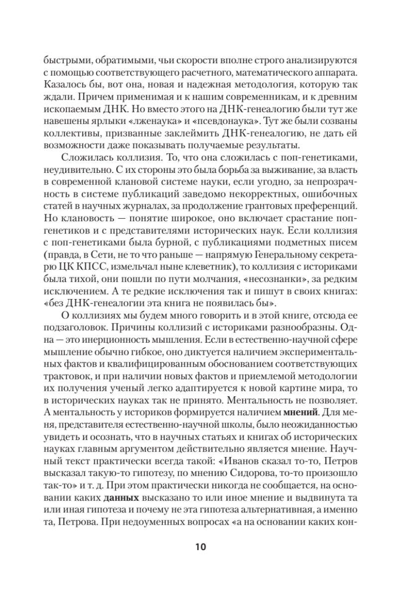 Перед вами – третья книга из серии «ДНК-генеалогия славян». Первые две, ставшие бестселлерами, имели подзаголовки «Происхождение и история» и «Новые открытия». Подзаголовок этой, третьей книги – «Коллизии с историками». Автор книги – президент Академии ДНК-генеалогии, профессор Московского и Гарвардского университетов, профессор АН СССР, член Национальной академии наук, член Всемирной Академии наук и искусств, основанной А. Эйнштейном, лауреат Государственной премии СССР по науке и технике, автор десятков книг, изданных на многих языках, и сотен научных статей – рассказывает о ДНК-генеалогии славян и других народов на протяжении десятков тысяч лет, и о том, как строго научные, обоснованные результаты и выводы ДНК-генеалогии входят в коллизии с многими воззрениями «академических» историков, лингвистов, популяционных генетиков. На многих примерах автор показывает, что эти коллизии были неизбежными, поскольку любой, кто пытался хоть немного углубиться в историю славян, неизбежно увязал в трясине «академических» представлений о том, что славяне якобы появились только полторы тысячи лет назад, видимо, как-то ниоткуда, и язык их появился тоже полторы тысячи лет назад, в 6-м веке нашей эры, как будто языки могут «появиться» вот так, прямо в определенное столетие. Стало окончательно ясно, что норманская теория, по которой скандинавы это «наше всё», и которых на Руси было якобы видимо-невидимо, оказалась фальшивкой. Арии оказались действительно древним племенем, с четкой меткой в их ДНК. Оказалось, что Запад ведет систематическую войну с нашими предками уже пять тысяч лет, и все эти тысячелетия проигрывает. Что никаких «финских охотников и рыболовов» на Русской равнине не было, их предки прибыли на территорию будущей Финляндии только уже в нашей эре, хотя историки столетиями провозглашали, что «финны древнее русских». Что скифы – вовсе не «предки русских», это – другая ДНК-генеалогическая линия, ведущая свое начало опять же с Русской равнины многие тысячелетия назад. Об этом и многом другом рассказывает эта книга, иллюстрируя все эти положения на конкретных данных. Ничего подобного историки, лингвисты и попгенетики показать не могли, не было у них соответствующей методологии, отсюда и коллизии как средство сохранения «чести мундира» путем дискредитации оппонентов.