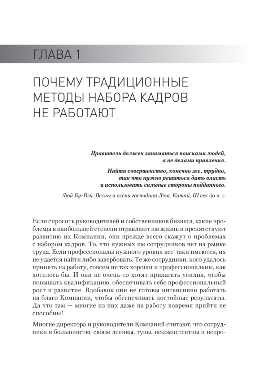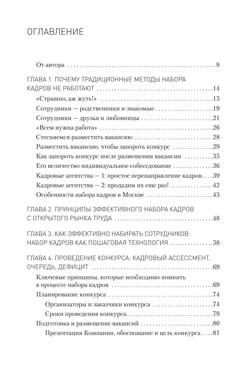 ¶¶Книга представляет конкретные причины, почему не работают традиционные методы, и уникальную технологию набора персонала как с открытого рынка, так и с внутреннего путем проведения конкурса на основе кадрового ассессмента. Предлагается и альтернативный вариант — вербовка, необходимая, когда Вы уже присмотрели интересующего сотрудника и Ваша цель — пригласить на работу в Компанию именно его. Благодаря внедрению в Ваш бизнес предложенной системы набор кадров станет для Вас не проблемой, а конкурентным преимуществом.