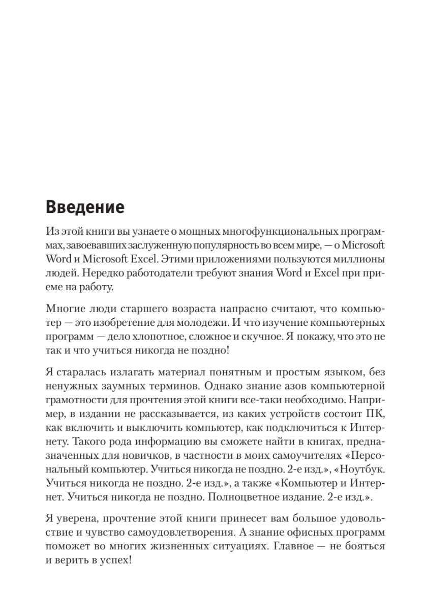 Эта книга посвящена новым версиям Microsoft Word и Excel 2013. Она предназначена для тех, кто хочет научиться работать в этих популярных многофункциональных программах. В ней нет сложных определений и заумных терминов. Большое количество иллюстраций делает процесс обучения максимально наглядным, а практические примеры значительно ускоряют освоение материала. Прочитав ее, вы поймете, что большой жизненный опыт не препятствие для освоения компьютерных программ. Главное — желание и уверенность в своих силах. Ведь не зря говорят, что учиться никогда не поздно!