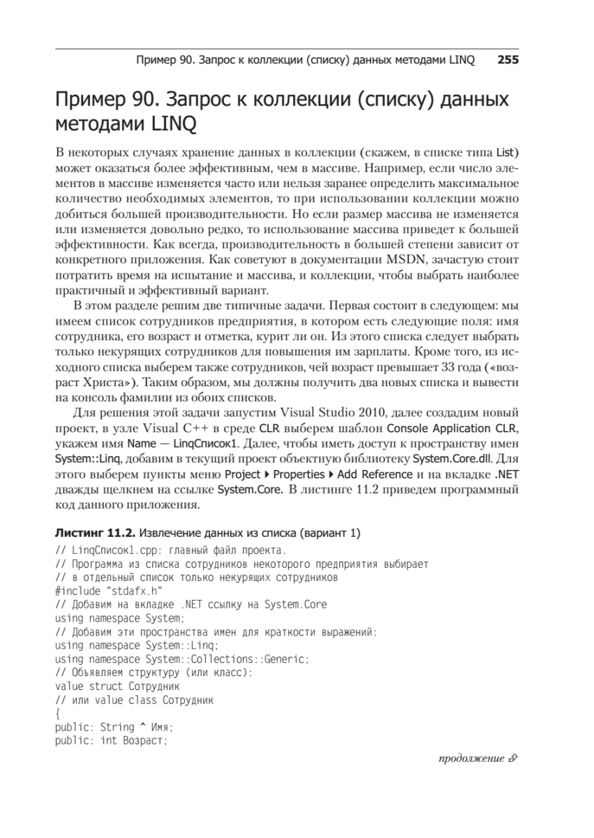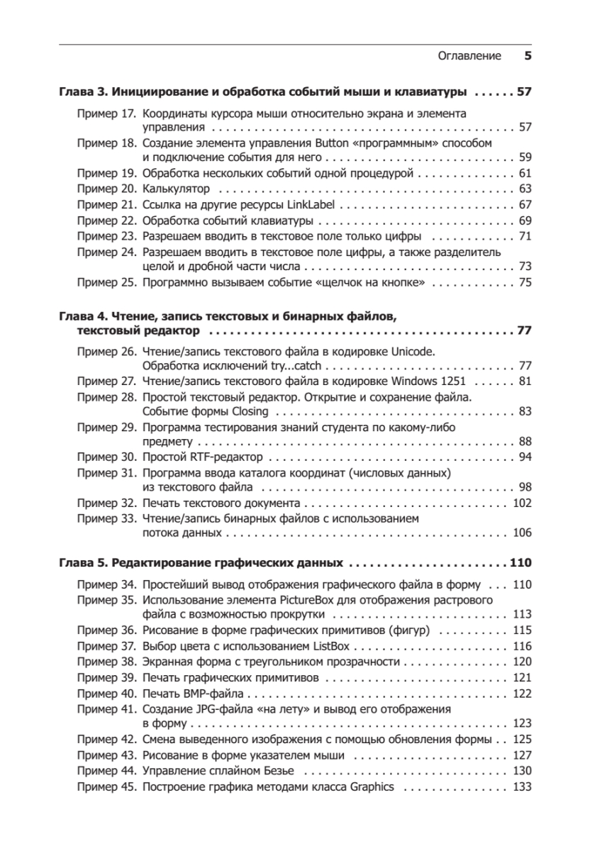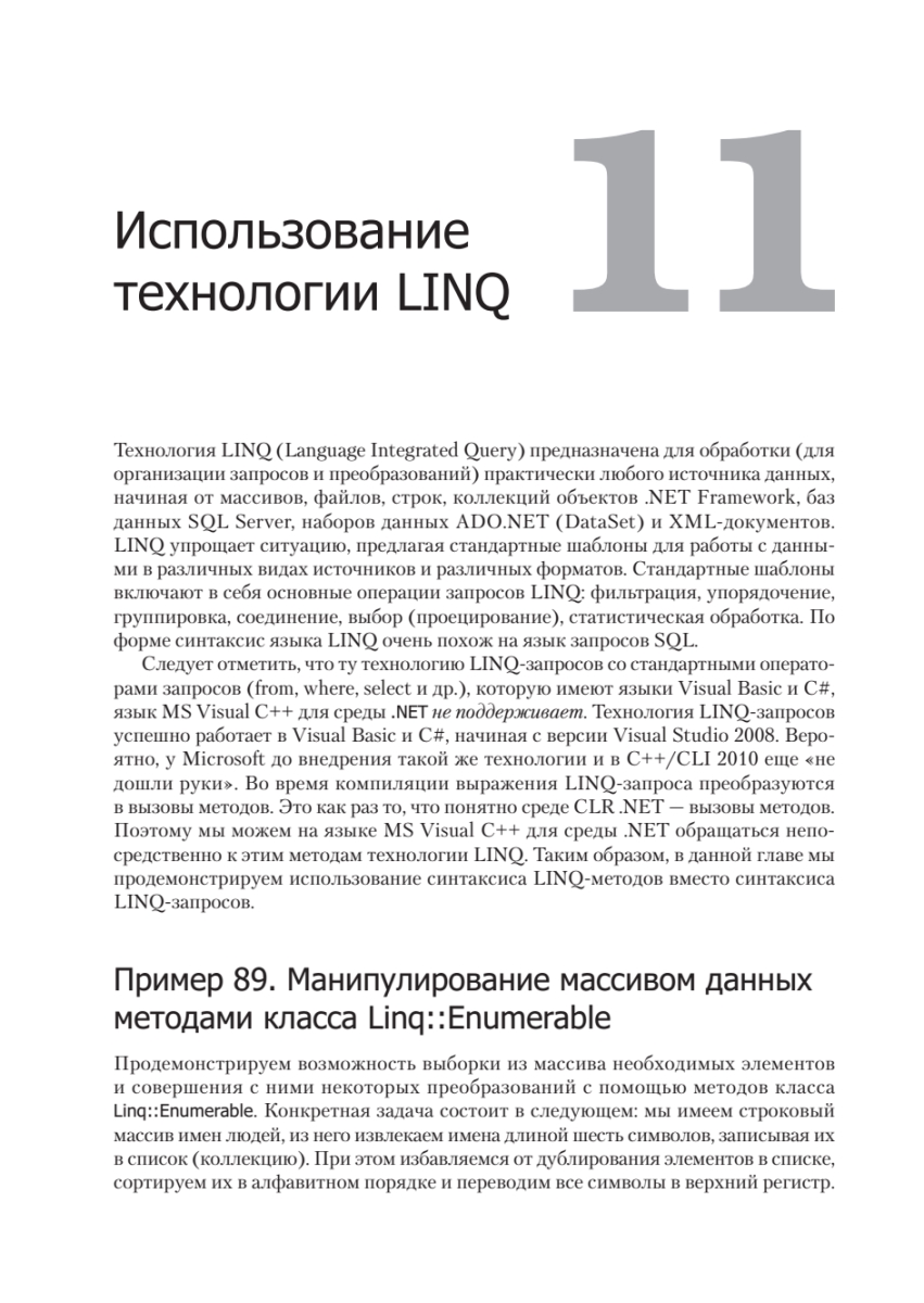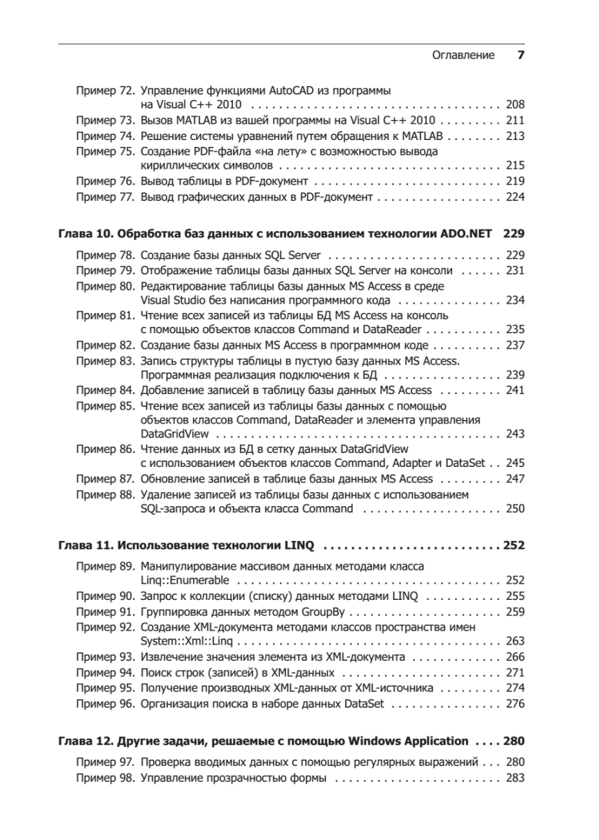 Книга посвящена программированию в среде Visual Studio 2010 на языке программирования C++/CLI. Автор выделил наиболее типичные и актуальные задачи, которые обычно стоят перед программистами, и представил их готовые решения. Разобрано более сотни конкретных примеров и алгоритмов. Рассмотрены программы с экранной формой и элементами управления в форме. Приведены примеры чтения и записи файлов в долговременную память. Описана работа с графикой и буфером обмена. Приведено несколько подходов к выводу диаграмм. Рассмотрены манипуляции табличными данными, в том числе организация связанных таблиц. Показан принцип использования элемента управления WebBrowser для отображения различных данных, а также для программного заполнения веб-форм. Обсуждены примеры программирования с применением функций объектных библиотек систем MS Excel, MS Word, AutoCAD и MATLAB. Описано создание PDF-файлов. Разобраны вопросы обработки баз данных SQL Server и MS Access с помощью технологии ADO.NET. Представлено много различных авторских оригинальных решений задач программирования, которых читатель не сможет найти в интернете. Издание предназначено для начинающих программистов, программистов среднего уровня, а также для программистов, имеющих опыт разработки на других языках и желающих ускоренными темпами освоить новый для себя язык MS Visual C++/CLI.