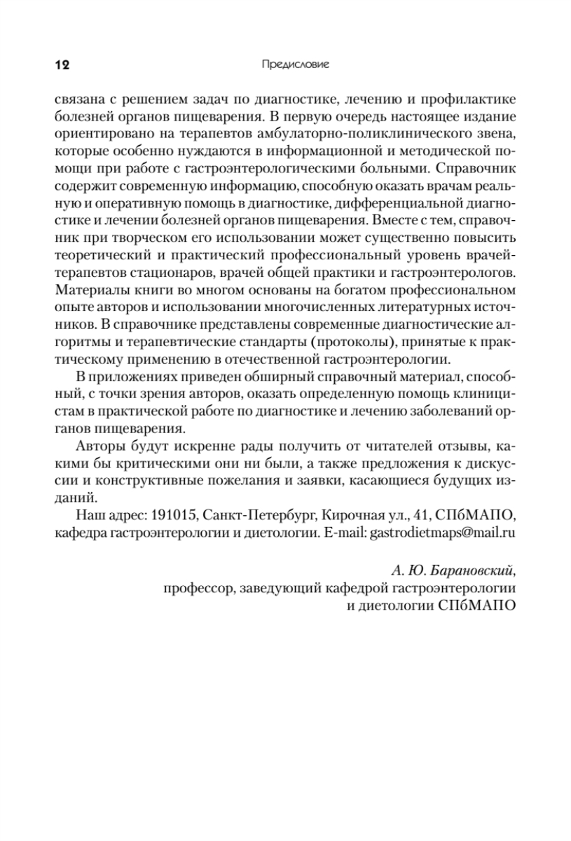 В справочном руководстве, созданном усилиями авторского коллектива во главе с профессором А. Ю. Барановским, представлены современные сведения по наиболее распространенным заболеваниям желудочно-кишечного тракта. Описаны ключевые вопросы этиологии, патогенеза, клиники, диагностики, дифференциальной диагностики, лечения и профилактики. Для гастроэнтерологов, диетологов, врачей общей практики, педиатров и студентов старших курсов медицинских вузов.