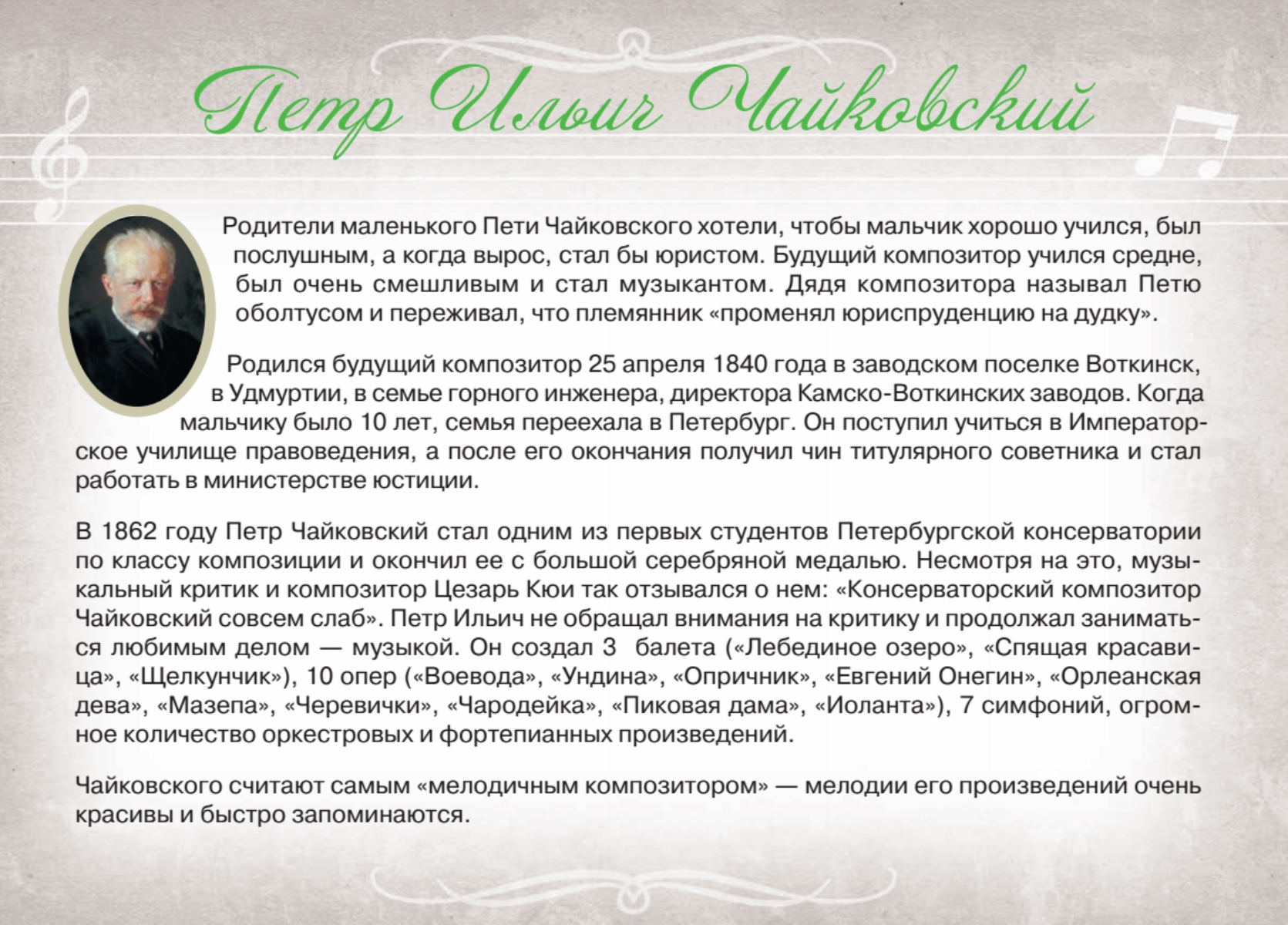 Нотная тетрадь удобного формата на спирали с необходимой справочной информацией. Краткая биография Петра Ильича Чайковского вдохновит ребенка на музыкальные подвиги!
