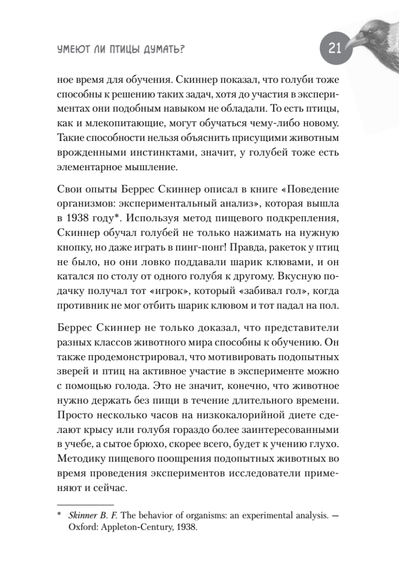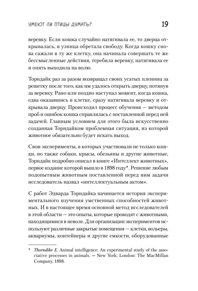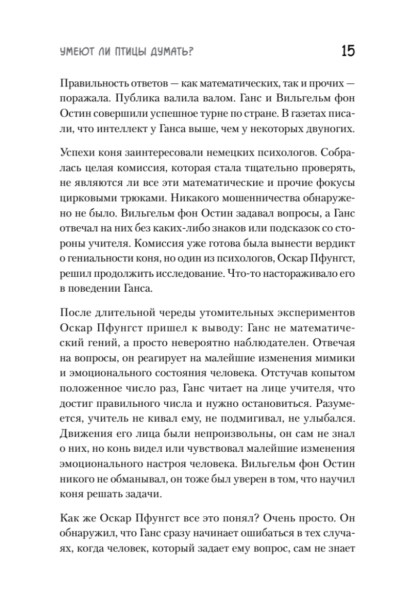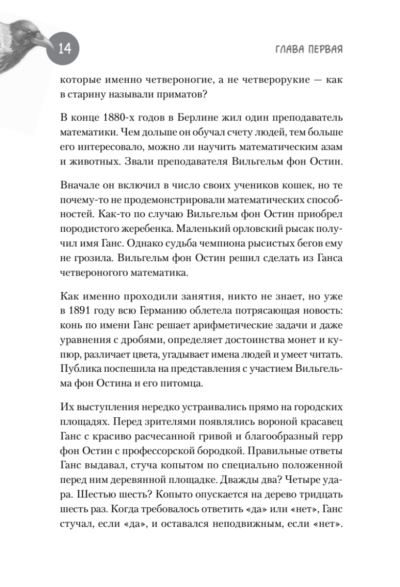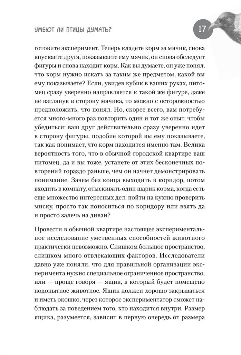 Про особую сообразительность ворон знают все. Многие не раз наблюдали, как каркающая вредина выпотрошила урну, ограбила кота, обворовала птичью кормушку, расстегнула молнию на рюкзаке, стащила из-под носа ключи или кусок пиццы. А многим знакома их слаженная работа в небольших «криминальных группировках» и склонность к невинным развлечениям типа катания с горки и качания на проводах. Неужели эти птицы действительно настолько умны, что порой кажутся не глупее нас с вами? Или, может быть, их поведение — это просто результат работы каких-то генетических программ или сложных инстинктов? Можем ли мы всерьез говорить о вороньем интеллекте или это только наивные домыслы дилетантов? Научно-популярная книга Юлии Дунаевой отвечает на эти вопросы, в легкой и занимательной форме рассказывая читателям о результатах научных исследований специалистов, которые изучают особенности элементарного мышления ворон и других птиц. В разных научных лабораториях мира, в том числе и в нашей стране, экспериментаторы предъявляют карлушам разнообразные задачки на сообразительность и потом тщательно анализируют полученные результаты. К каким же выводам приходят ученые, пытающиеся прочитать вороньи мысли?