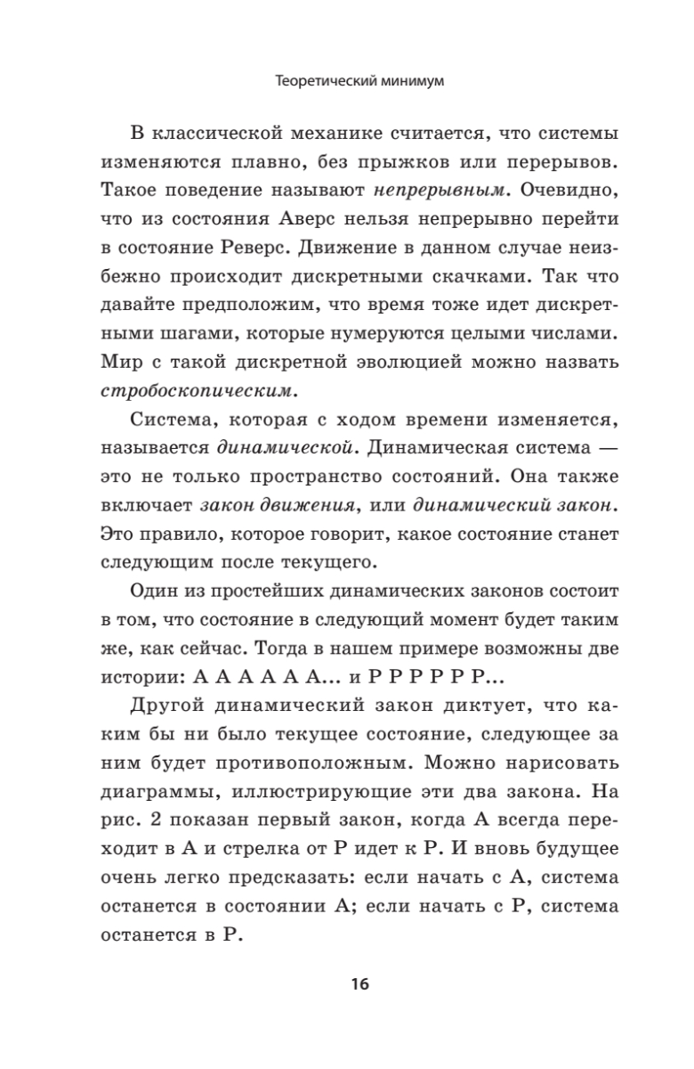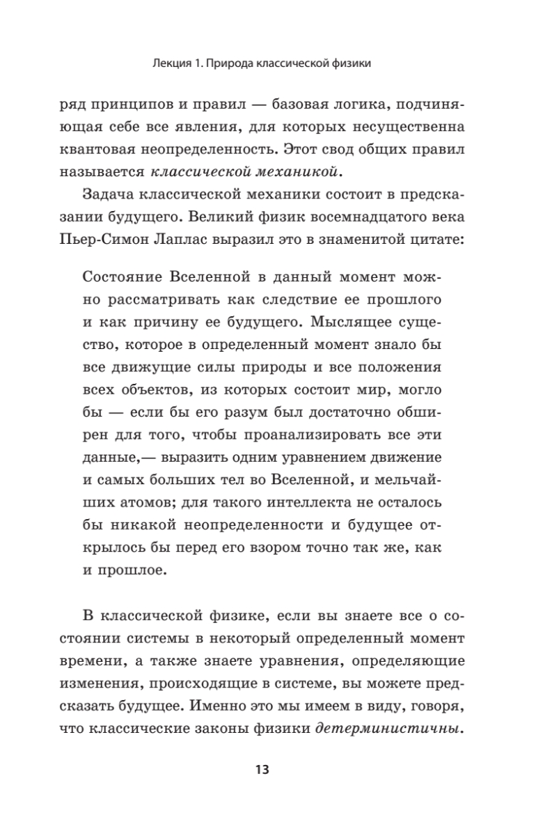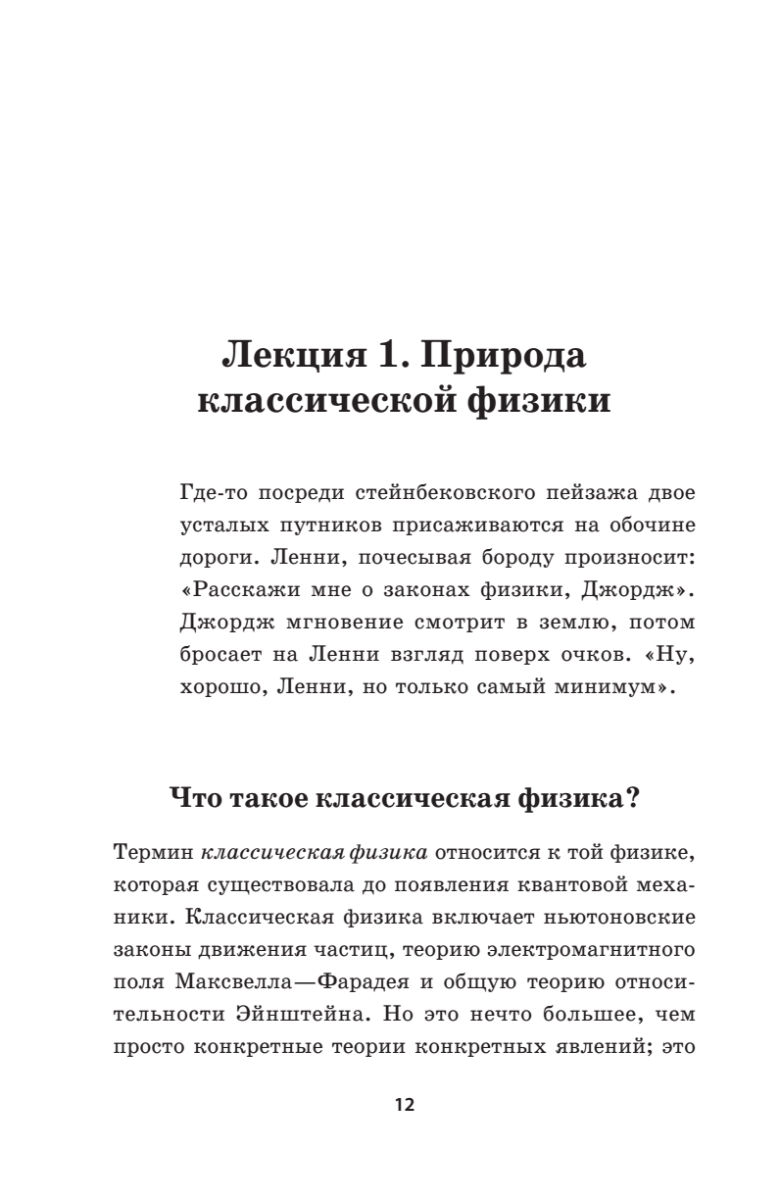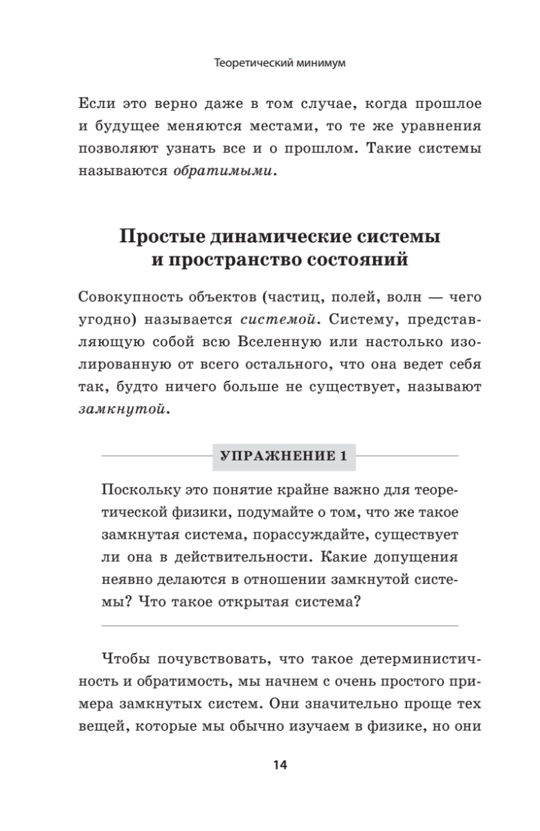 Сразу хочу обратить внимание на одну деталь. Несмотря на громкий подзаголовок «Всё, что нужно знать о современной физике», книга посвящена только одному её разделу — классической механике. Эта область покрыта достаточно серьёзно: описан математический аппарат (дифференцирование, интегрирование, линейные дифференциальные уравнения, градиент, дивергенция, ротор), даются лагранжева и гамильтонова формулировки механики. Без сомнения всё делается, чтобы подвести читателя к квантам, но кванты в книжку не вошли. Книга охватывает только первый курс лекций автора из серии «теоретический минимум», а всего автор опубликовал шесть основных и девять дополнительных курсов. Будем надеяться, что остальные рано или поздно тоже будут изданы на русском языке.