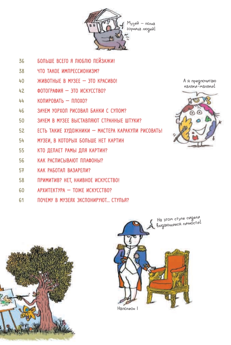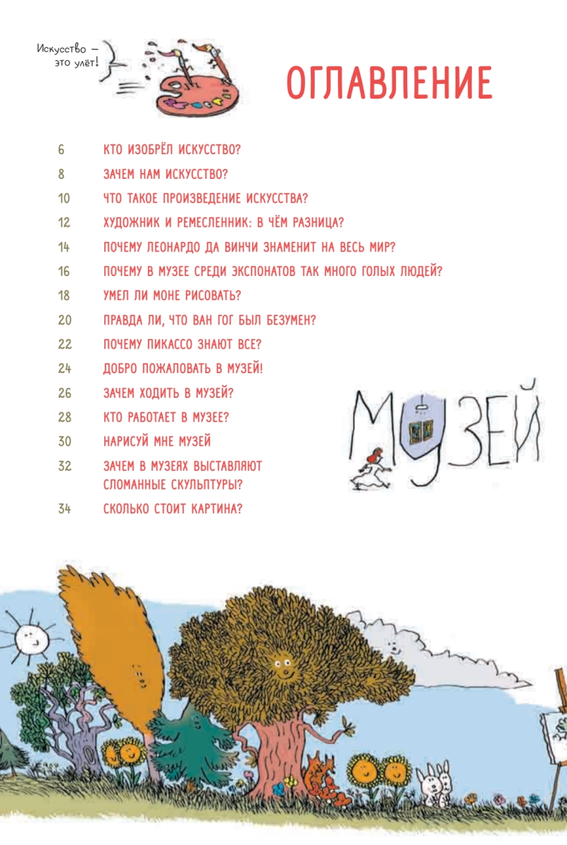Зачем нужно искусство? Как Пикассо стал известен во всём мире? Кто придумал музеи? Сколько может стоить картина? Почему в музее выставлены стулья?…Шедевры и художественные стили, факты об известных художниках, выставки и музеи – в этой книге много интересной информации об истории искусств. Автор книги искусствовед Полин Понс поможет лучше разобраться в живописи, скульптуре, фотографии, архитектуре и дизайне. А смешные иллюстрации Паскаля Леметра не оставят без улыбки ни ребёнка, ни взрослого.