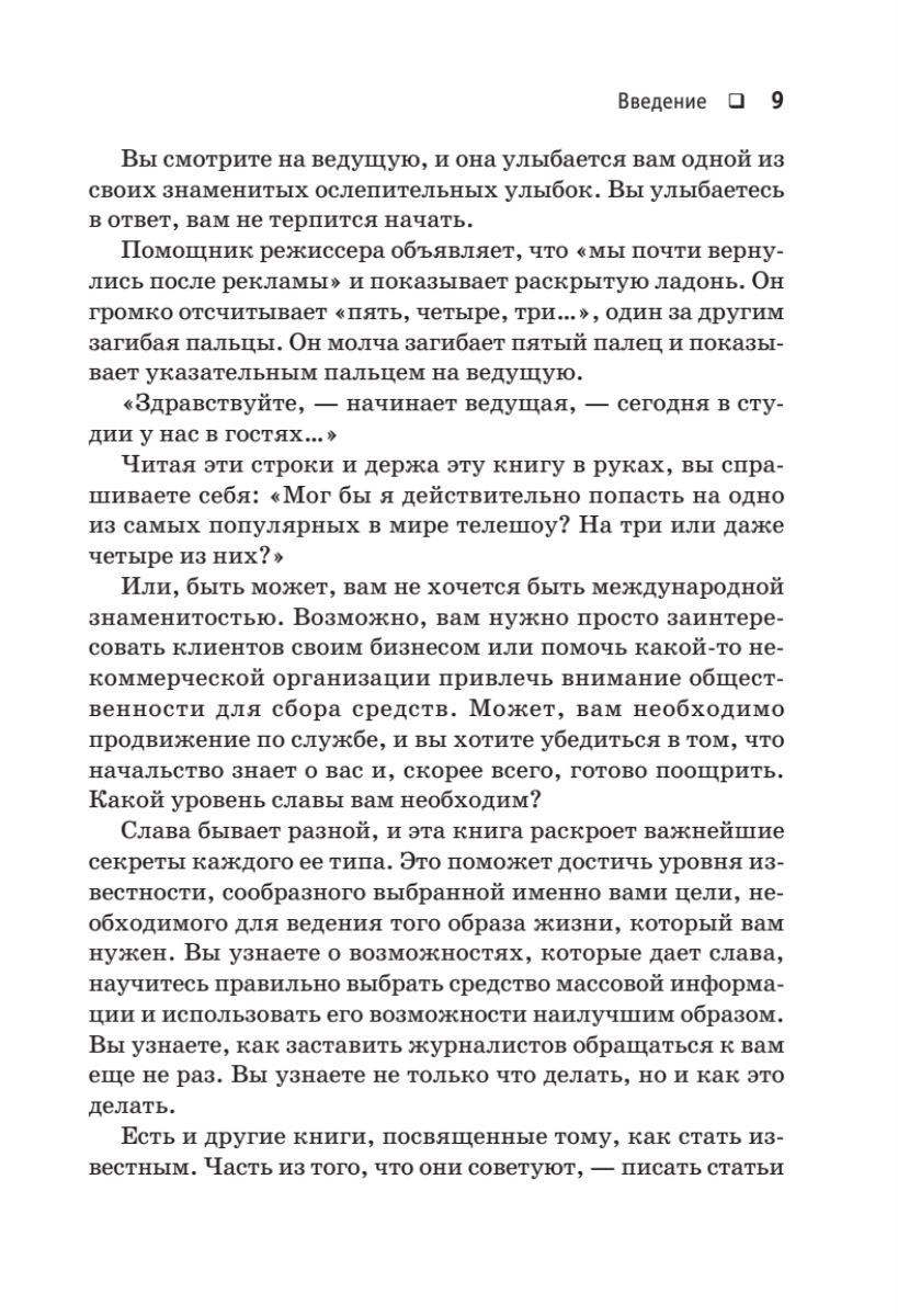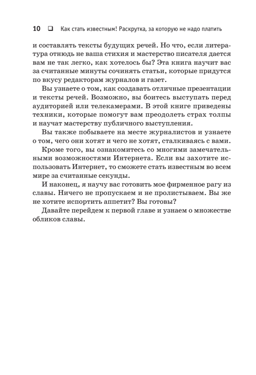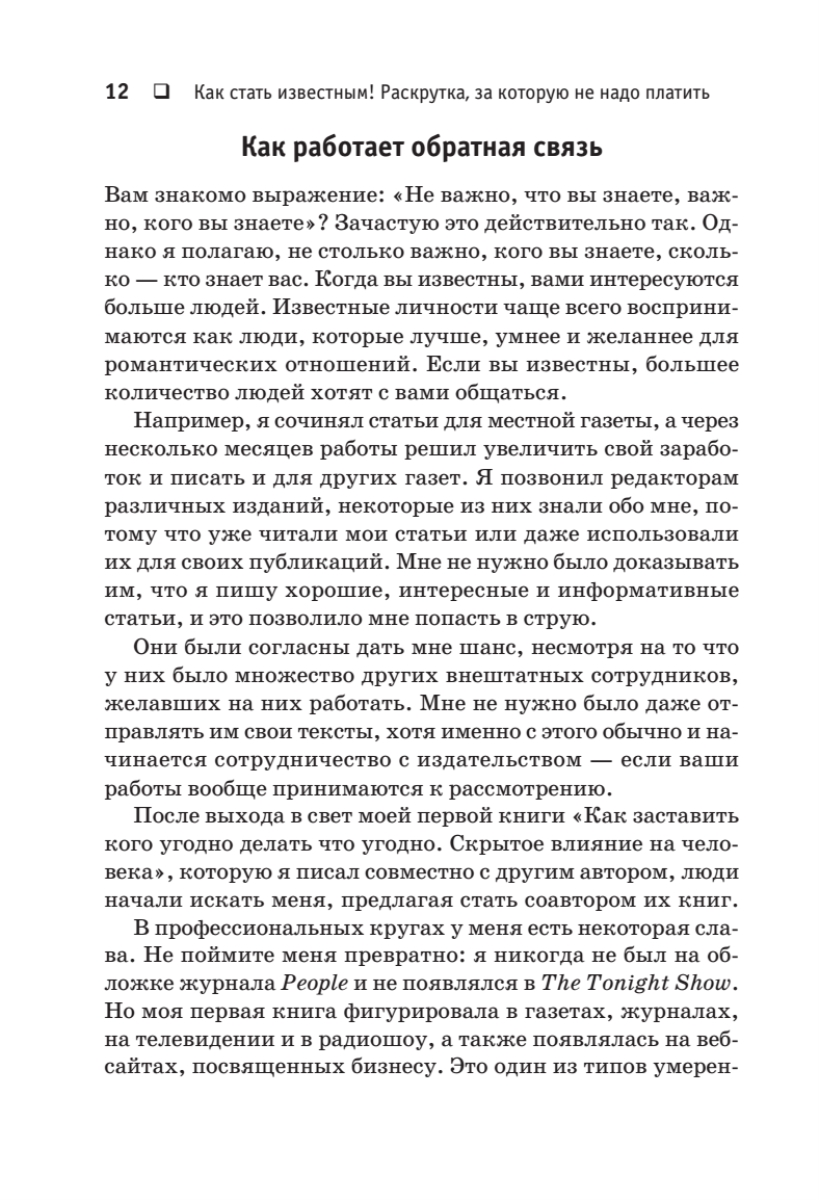 В наше время, когда громкое имя решает если не все, то очень многое, важность индивидуальной раскрутки невозможно переоценить.Автор этой книги, известный журналист, публицист и PR-менеджер, Данек Каус научит всех и каждого самой настоящей бесплатной раскрутке с использованием печатных СМИ, радио, телевидения, Интернета и так далее. Теорию и практику самопродвижения автор излагает просто и понятно, в формате step-by-step, полностью исключающем неточности и двойные толкования. Книгу, безусловно, оценят все, кто нуждается в развитии публичности: бизнесмены, менеджеры, писатели, адвокаты, педагоги, артисты, а также представители многих других профессий.
