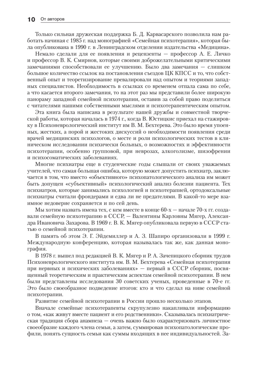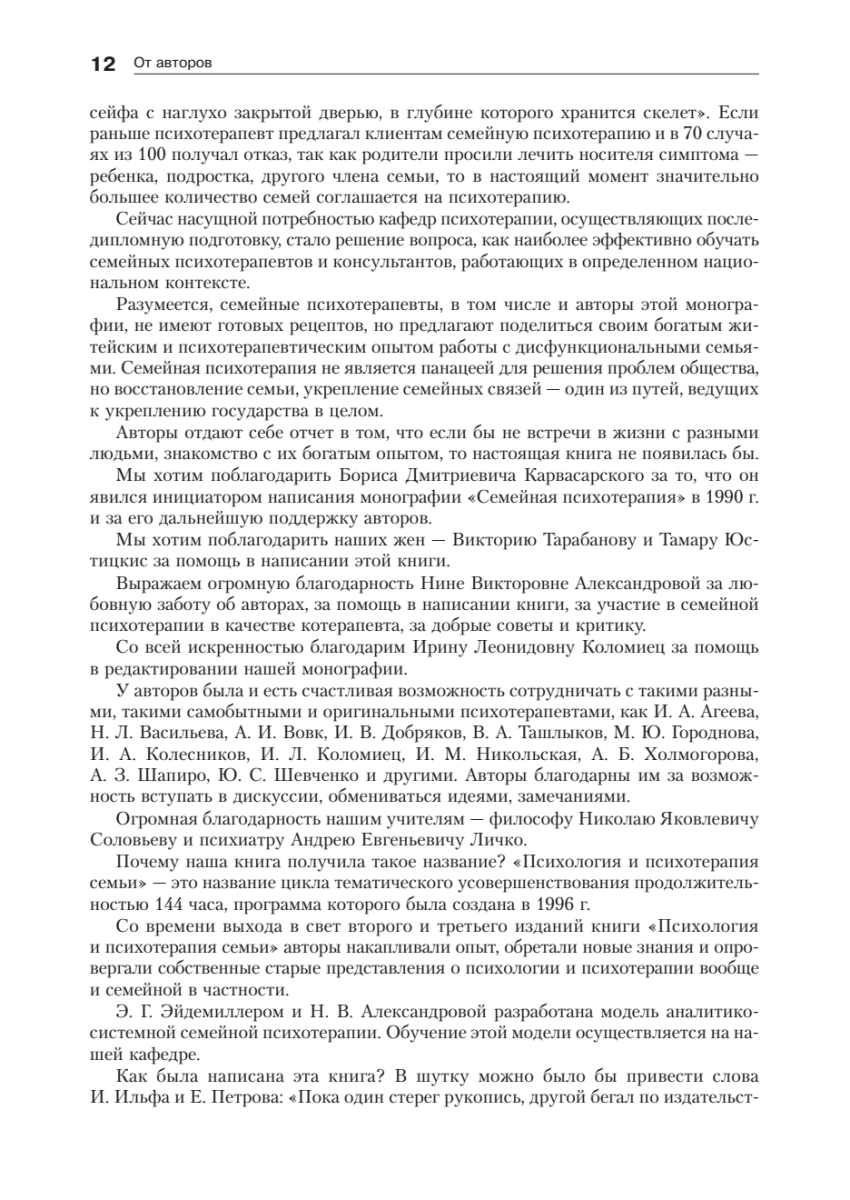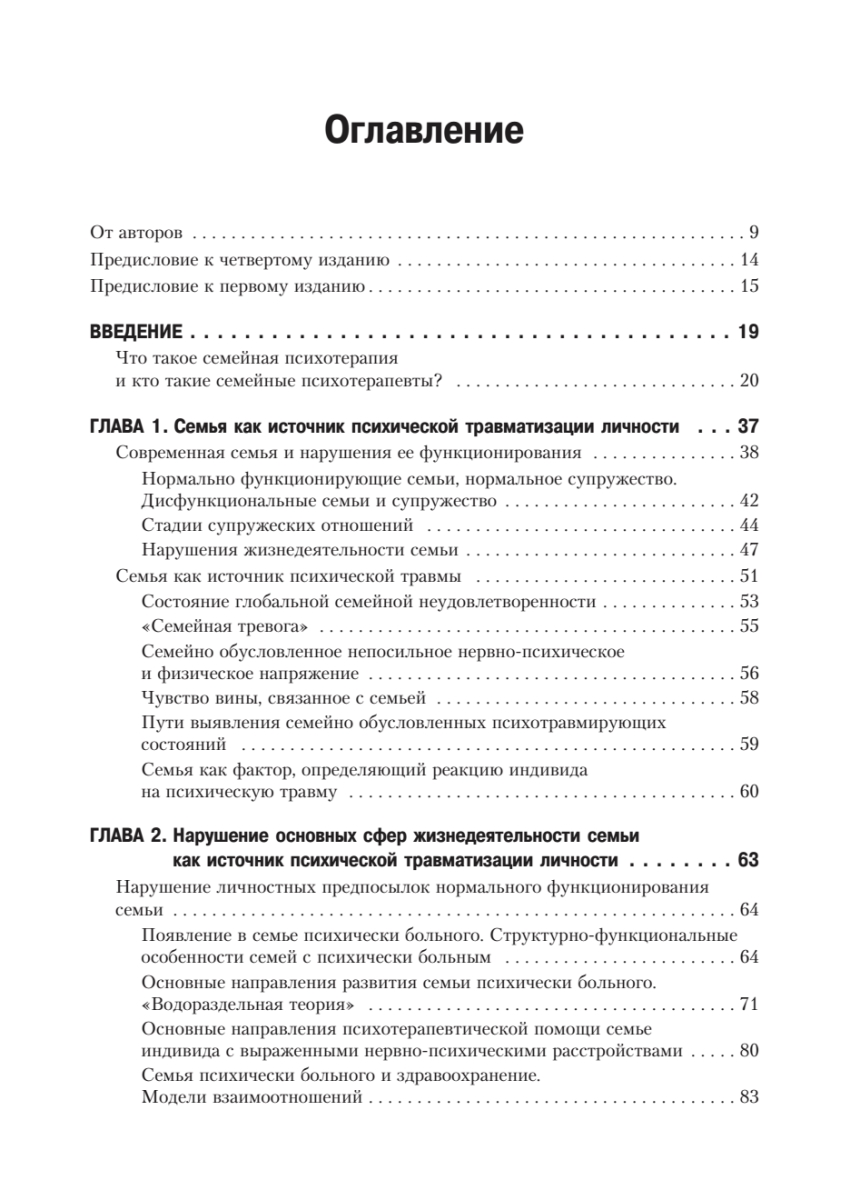 Четвертое издание монографии (предыдущие вышли в 1990, 1999, 2001 гг.) переработано и дополнено. В книге освещены основные психологические механизмы функционирования семьи — действие вертикальных и горизонтальных стрессоров, динамика семьи, структура семейных ролей, коммуникации в семье. Приведен обзор основных направлений и школ семейной психотерапии — психоаналитической, системной, конструктивной и других. Впервые авторами изложена оригинальная концепция «патологизирующего семейного наследования». Особый интерес представляют психологические методы исследования семьи, многие из которых разработаны авторами.