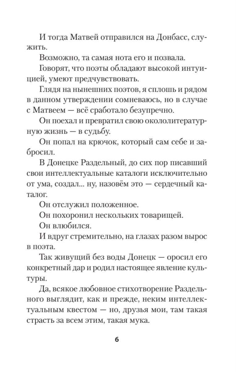 Как Николай Гумилёв писал о любви и африканских сражениях, так Матвей Раздельный пишет о любви и сражающемся Донбассе, создавая сильные образы, где личное и историческое переплетаются.
