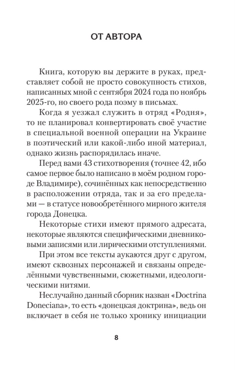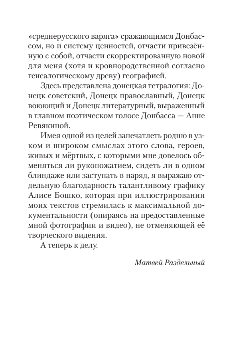 Матвей Раздельный – поэт, прозаик, публицист и литературный критик, автор разнообразных антологий и член жюри ряда литературных премий, уехал из родного города Владимира добровольцем на СВО, а после окончания контракта – остался жить в Донецке.“Doctrina Doneciana” – его дебютная поэтическая книга, которую можно сравнить с “Романтическими цветами” Николая Гумилёва: Гумилёв посвятил первое издание Анне Горенко (Ахматовой), а Раздельный – донецкой поэтессе Анне Ревякиной, Гумилёв написал цикл стихов о любви и сражениях в Африке, а Раздельный – о любви и сражающемся Донбассе.При этом Раздельный ни секунды не подражает, хотя и намеренно отсылает к огромному количеству текстов классиков и современников, работая в свойственной только ему манере – методом скрещивания бытописательства и литературоведческих ребусов и шарад.