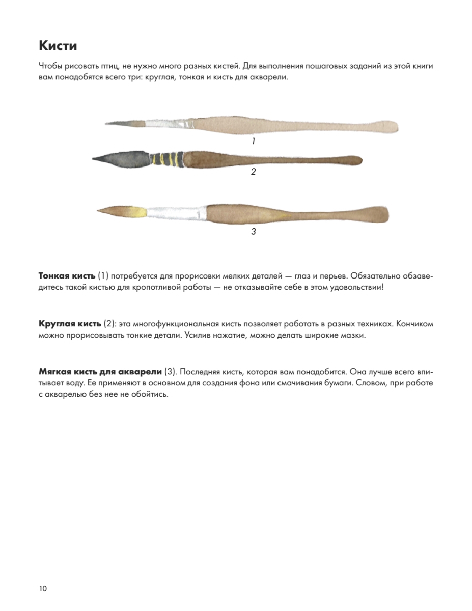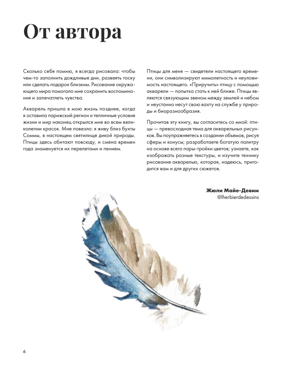 В книге собрано 16 вдохновляющих мастер-классов, которые помогут вам развивать навыки постепенно — от простого к сложному. Подробные советы охватывают все аспекты — от выбора бумаги, кистей и красок до секретов рисования реалистичных перьев, выразительных живых глаз и передачи текстуры. А по QR-кодам внутри книги вы сможете послушать пение птиц, чтобы еще глубже прочувствовать волшебную атмосферу природы.