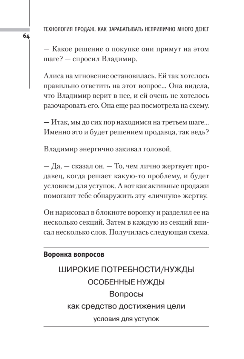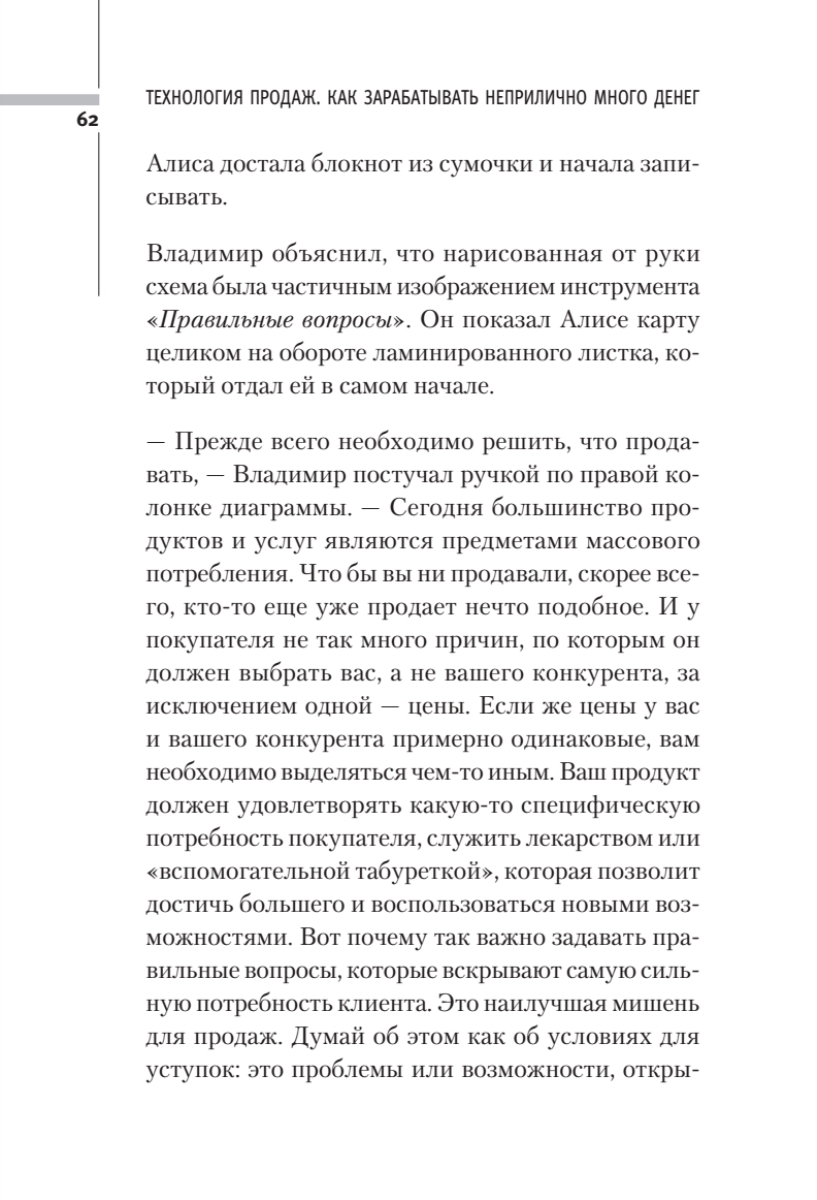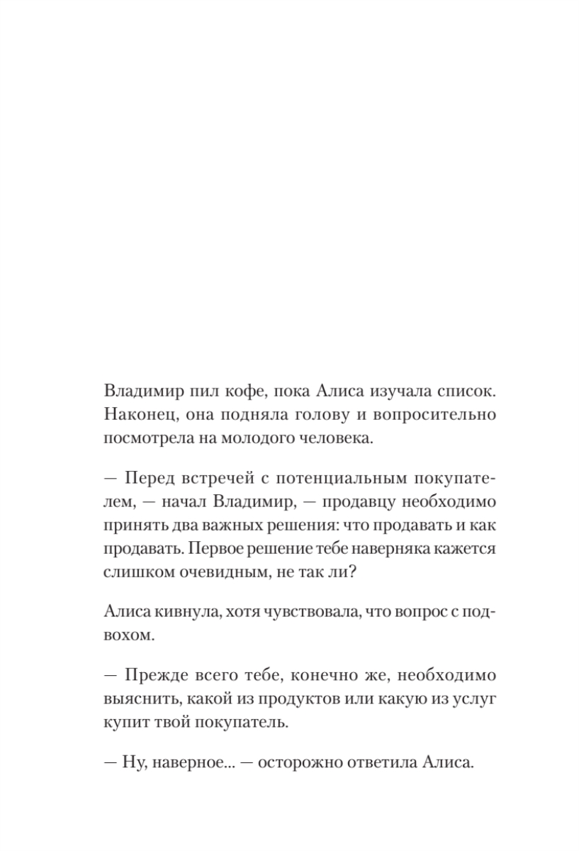 Книга, которую вы держите в руках, не похожа ни на какую другую. Это не обычная бизнес-литература, а захватывающий роман, который шаг за шагом научит вас передовым и действенным технологиям продаж.Почему вам стоит прочитать эту книгу:• Авторы — известные бизнес-тренеры и успешные предприниматели.• Книга написана в форме захватывающего романа, но при этом содержит профессиональные советы.Симпатичная девушка по имени Алиса, работающая менеджером по продажам, знакомится с Владимиром — профессиональным бизнес-тренером. Поначалу Алиса весьма скептически относится к новому знакомому: она считает, что знает о продажах все и Владимир не может научить ее ничему новому. Однако чем дольше они общаются, тем больше Алиса понимает, что с помощью новых знаний она способна выйти на совершенно новый уровень успеха. Владимир продолжает обучать Алису, и постепенно между ними зарождается романтическая связь.Увлекательная подача материала позволит читателю с удовольствием освоить эффективные и проверенные на практике секреты профессиональных продаж.
