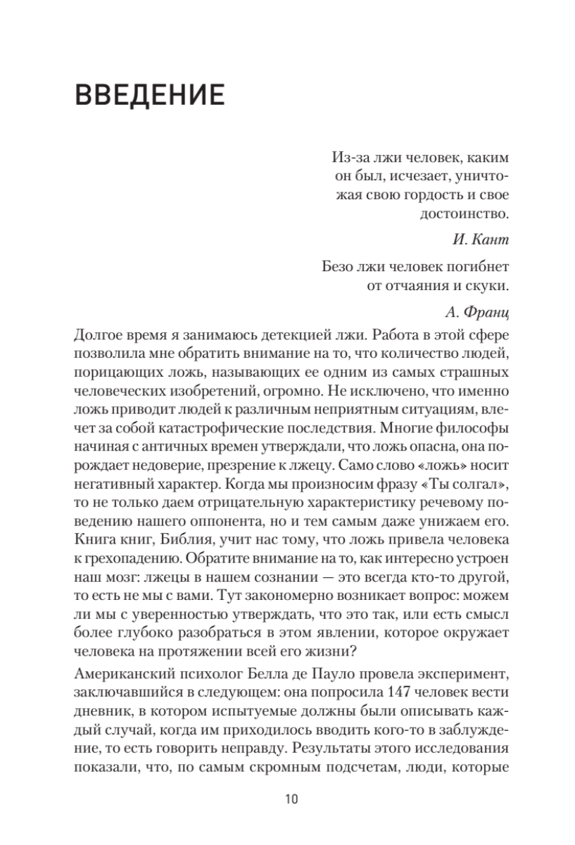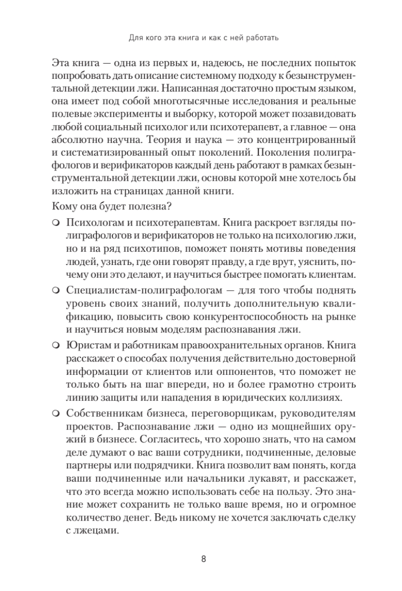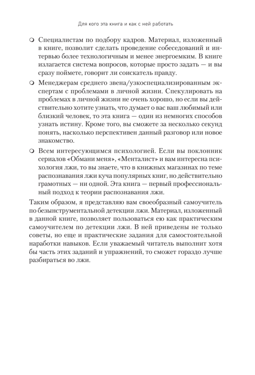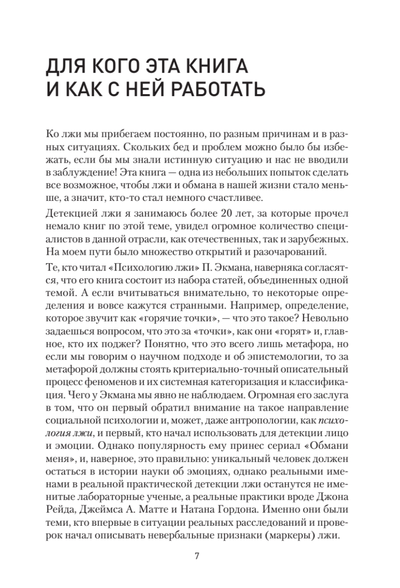 Ко лжи мы прибегаем постоянно, по разным причинам и в разных ситуациях. Скольких бед и проблем можно было бы избежать, если бы мы знали истинную ситуацию и нас не вводили в заблуждение. Эта книга — одна из попыток сделать все возможное, чтобы лжи и обмана в нашей жизни стало меньше, а значит, кто-то стал счастливее.Перед вами практическое пособие по безынструментальной детекции лжи. В нем приведены не только советы, но и задания для самостоятельной отработки навыков. Когда уважаемый читатель выполнит хотя бы часть предложенных заданий и упражнений, ложь станет для него достаточно очевидной.Несмотря на то, что текст изложен очень доступно, в его основу положены многотысячные исследования, реальные полевые эксперименты и выборка, которой может позавидовать любой социальный психолог или психотерапевт, а главное — она абсолютно научна.Издание подойдет всем, кто хочет обрести свободу, прямо смотреть лжи в глаза и видеть ее, с легкостью говорить правду и быть счастливым — откройте для себя иной взгляд не только на психологию лжи, но и на другие модели и мотивы поведения человека. Также книга будет интересна психологам и психотерапевтам, специалистам-полиграфологам, юристам и работникам правоохранительных органов, специалистам по подбору кадров, собственникам бизнеса, переговорщикам, руководителям проектов — поднимите уровень своих знаний, учитесь новым моделям распознавания лжи.