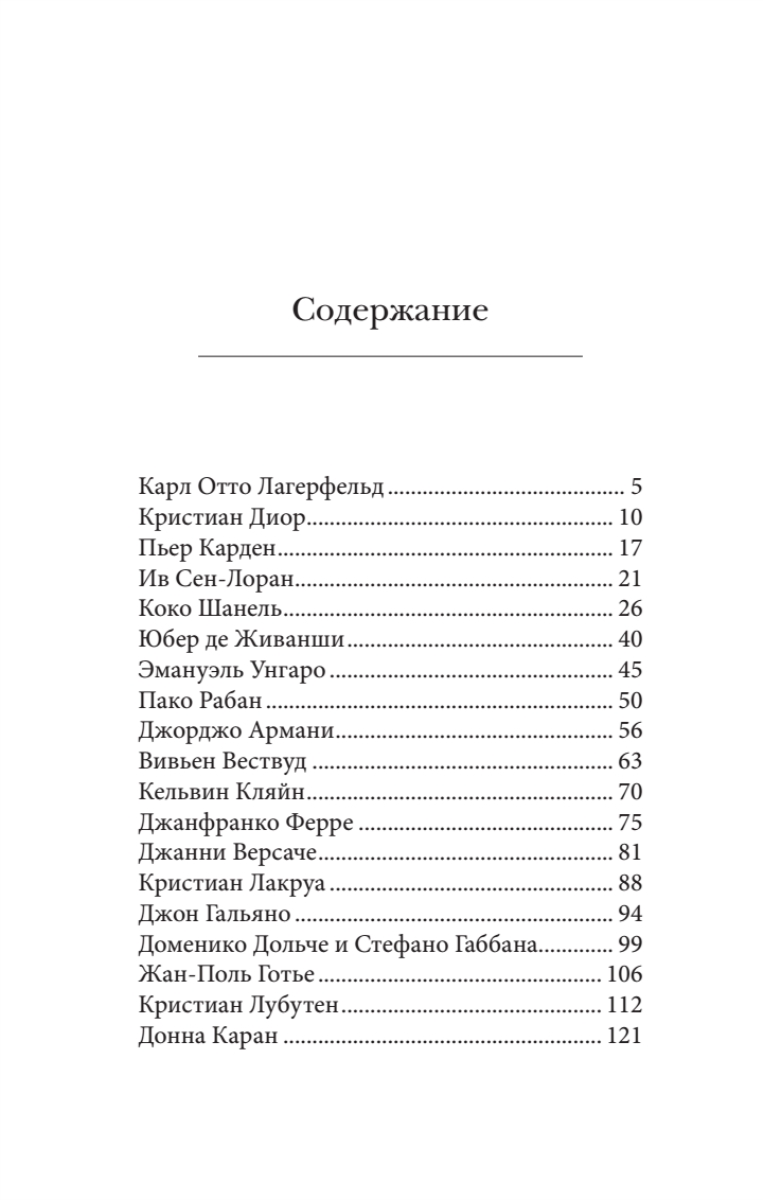 Книга содержит высказывания таких культовых персонажей в истории моды, как Коко Шанель, Пьер Карден, Ив Сен-Лоран, Юбер де Живанши, Эммануэль Унгаро, Пако Рабанн, Джоржо Армани, Карл Лагерфельд, Вивьен Вествуд, Кельвин Кляйн, Джанфранко Ферре, Джанни Версаче, Кристиан Лакруа, Жан-Поль Готье, Джон Гальяно, Кристиан Лубутен, Донна Каран, Доменико Дольче и Стефано Габбана.