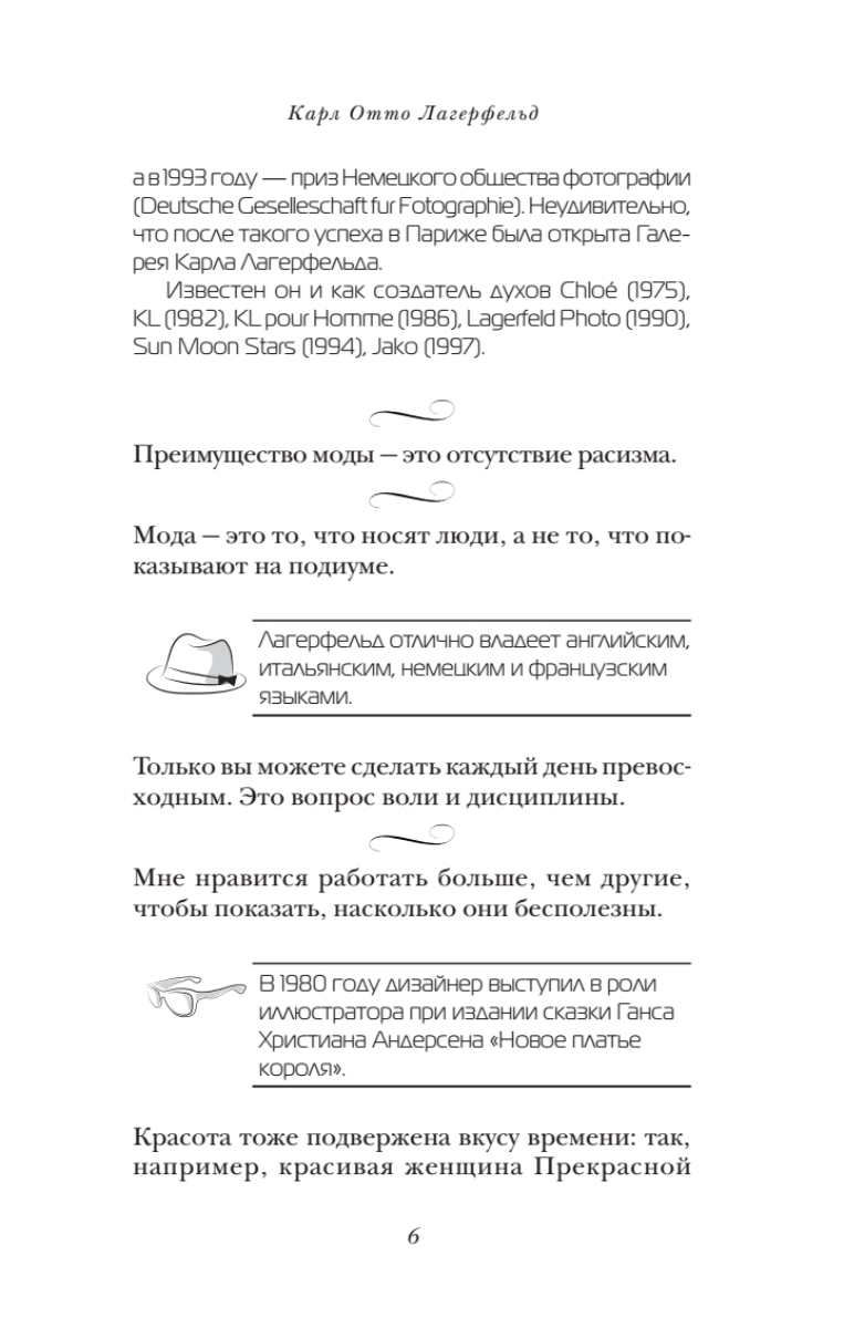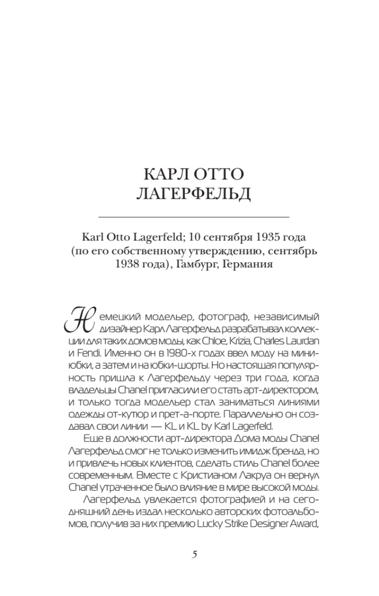 Мода — это не просто одежда. Это отражение эпохи, настоящее искусство. Она влияет на жизнь в целом: на живопись и дизайн, на литературу и технологии, на образ жизни и поведение людей, помогает им реализовать себя как в профессии, так и в творчестве. Кто же они — законодатели моды, культовые фигуры, которые создают историю этого искусства, делающего нашу жизнь прекраснее? Что они думают о творчестве, которому посвятили всю свою жизнь? Как рассуждают о том, что видят вокруг себя? Какими глазами смотрят на мир, на свою собственную и на нашу жизнь? Эта книга — попытка заглянуть по ту сторону подиума и понять, в какой атмосфере рождались и рождаются модные шедевры, какова цена успеха, как и чем жили и живут популярные модельеры. Как известно, гении талантливы абсолютно во всем, поэтому высказывания знаменитых кутюрье и мудры, и остроумны, и актуальны во все времена, а советы людей, настолько успешных в своем деле, пригодятся не только в отношении моды, но и вообще в жизни.