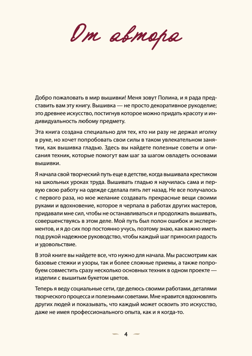 Вы давно заглядываетесь на аккуратные вышивки в соцсетях, но думаете, что создавать такие шедевры под силу только профессионалам? Благодаря этой книге вы измените свое мнение! Полина Гончарова, автор вдохновляющего блога Shveykapoly, поможет вам сделать первые уверенные стежки.В книге вы найдете пошаговые инструкции по выполнению разнообразных стежков, швов и цветочных элементов — от самых простых до более сложных, а понятные фотографии помогут освоить технику вышивки даже тем, кто никогда раньше не держал иголку в руках.Если вы думаете, что вышивать сложно, откройте эту книгу и начните удивительное путешествие в мир творчества!Просто. Красиво. Своими руками