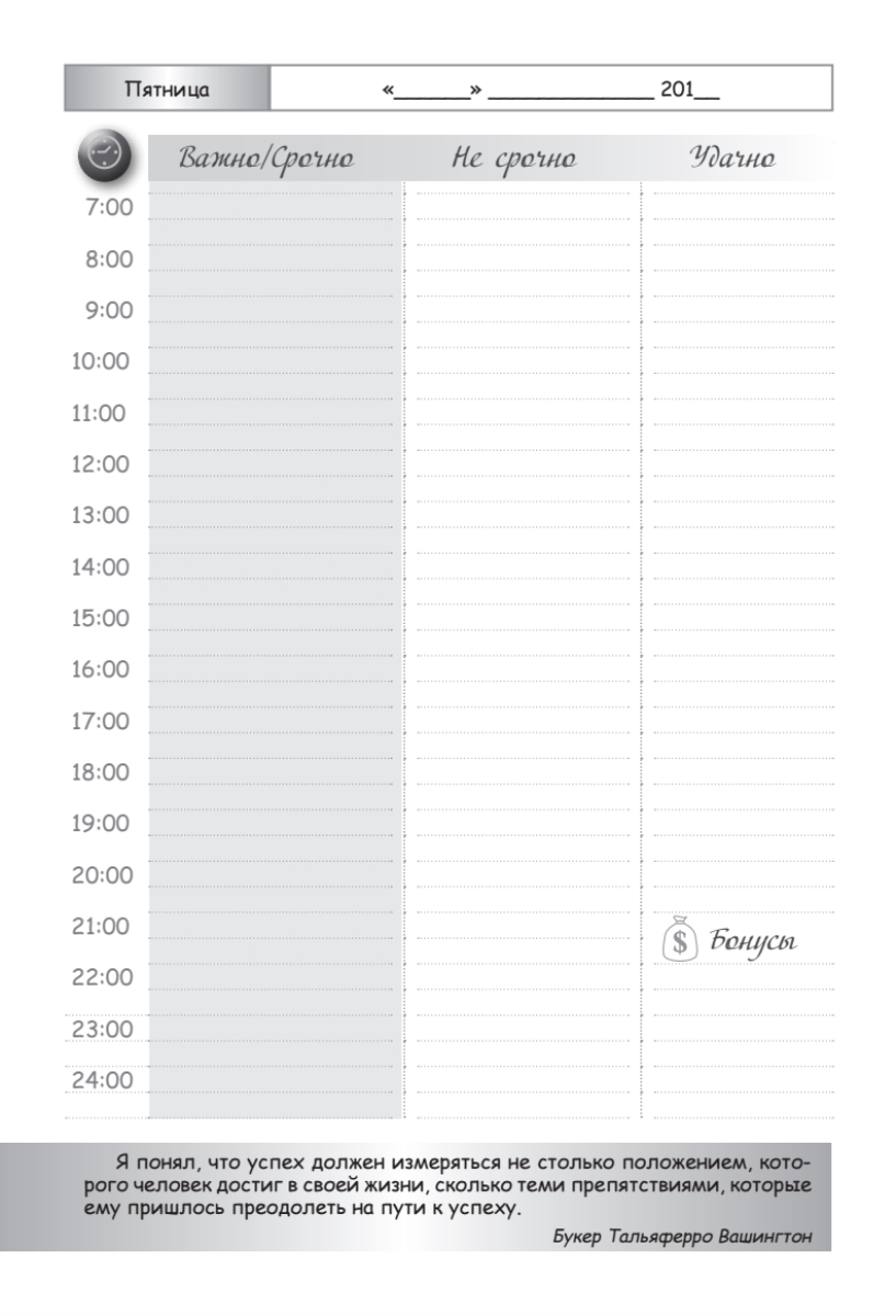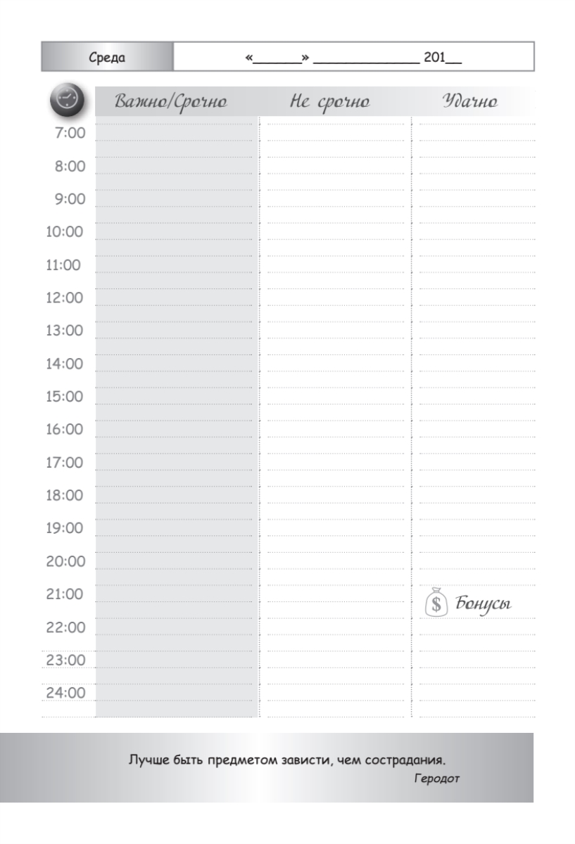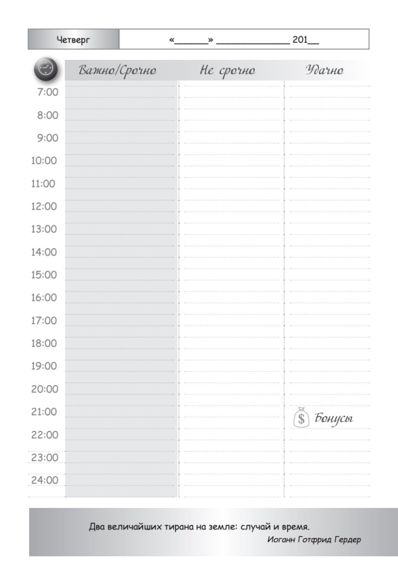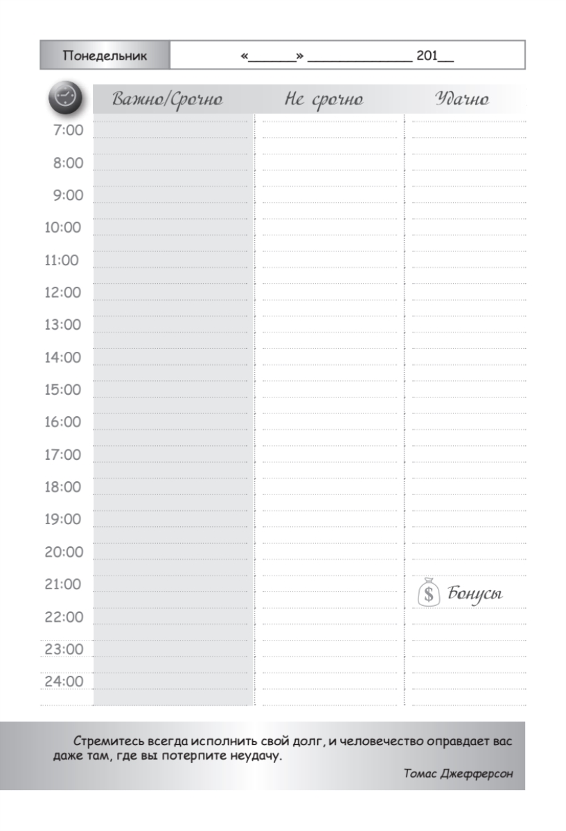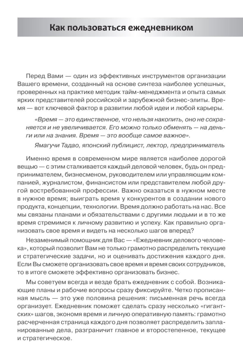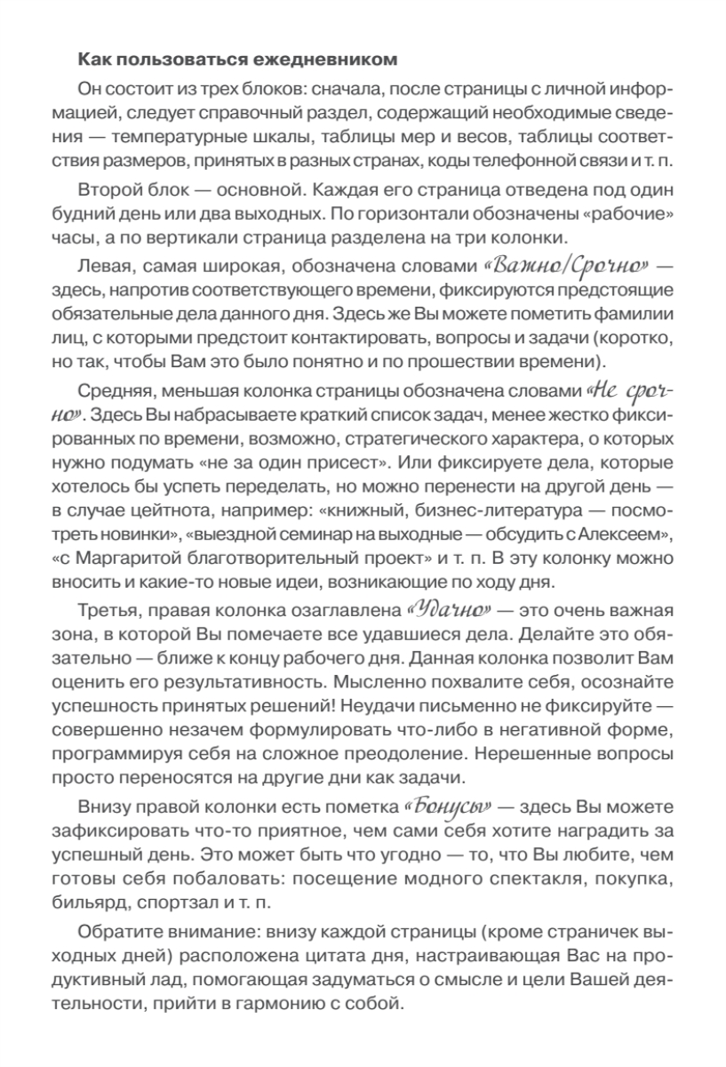«Ежедневник делового человека» составлен с учетом последних разработок в области деятельной психологии и тайм-менеджмента и включает в себя опыт ведущих современных бизнесменов и управленцев. Он эффективно помогает быстро настроиться на правильное и своевременное ведение дел, позволяет планомерно и успешно добиваться поставленных целей. Предназначен для деловых людей, дорожащих своим временем, - менеджеров по продажам, юристов и аудиторов, коммерческих директоров, рекламных агентов, риэлторов, экспертов-переговорщиков, руководителей компаний, предпринимателей.