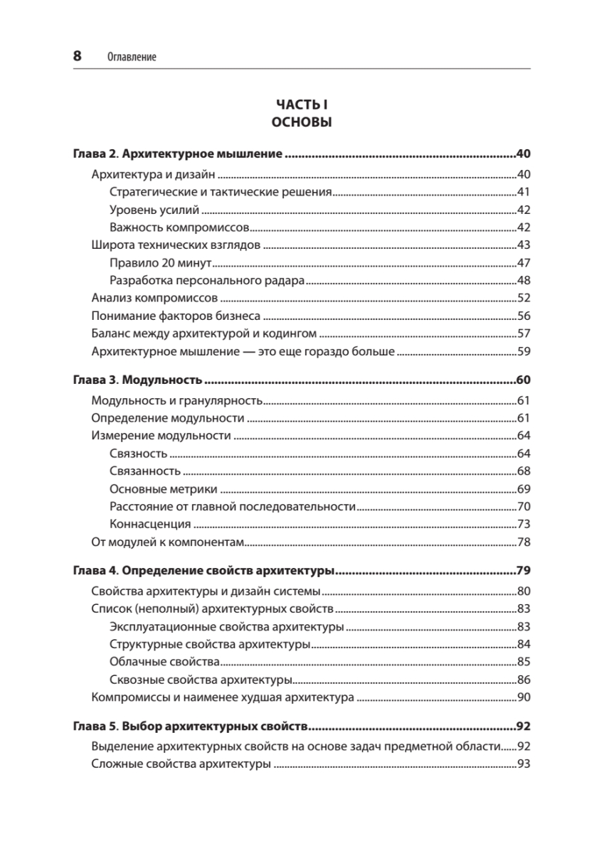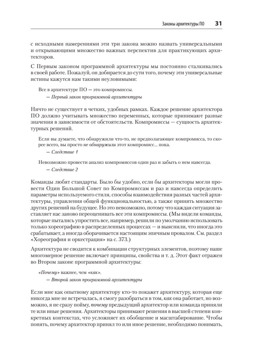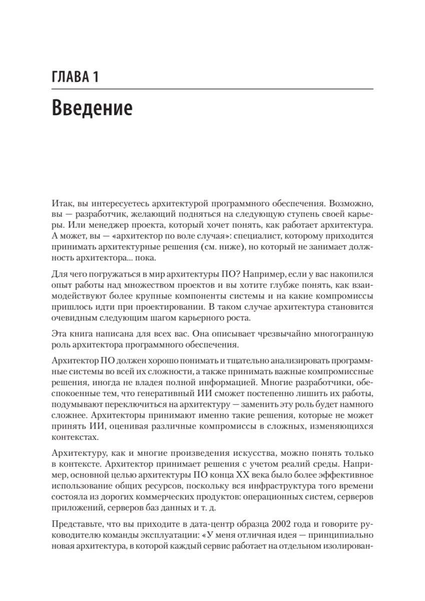 Глубокое понимание компромиссов: Книга учит анализировать trade-offs в архитектуре — от выбора стиля (микросервисы vs. монолит) до интеграции с ИИ, помогая принимать обоснованные решения, а не следовать модным трендам.