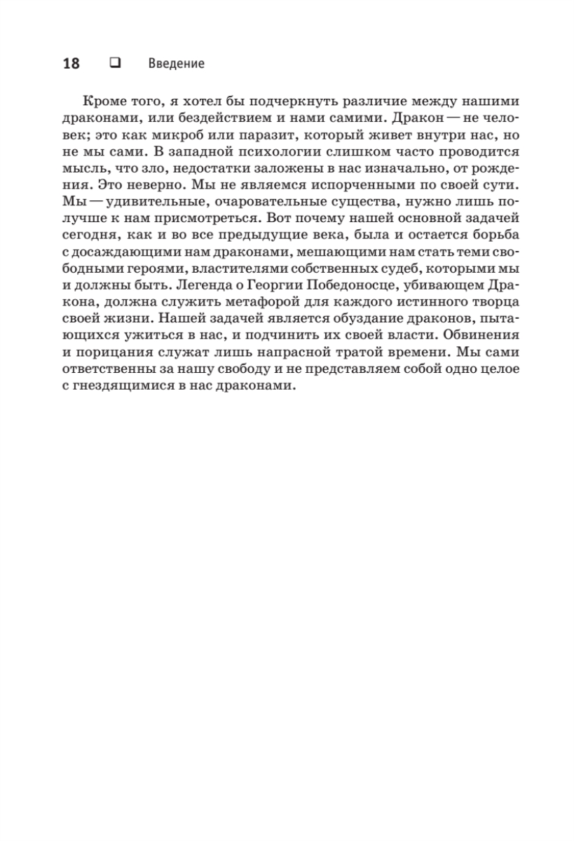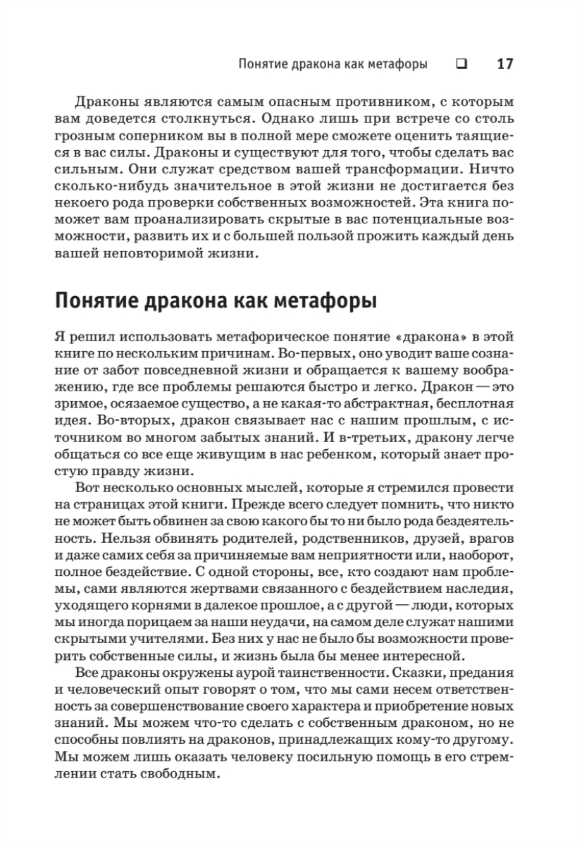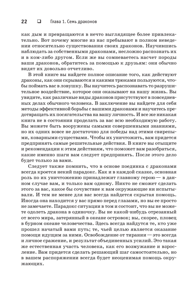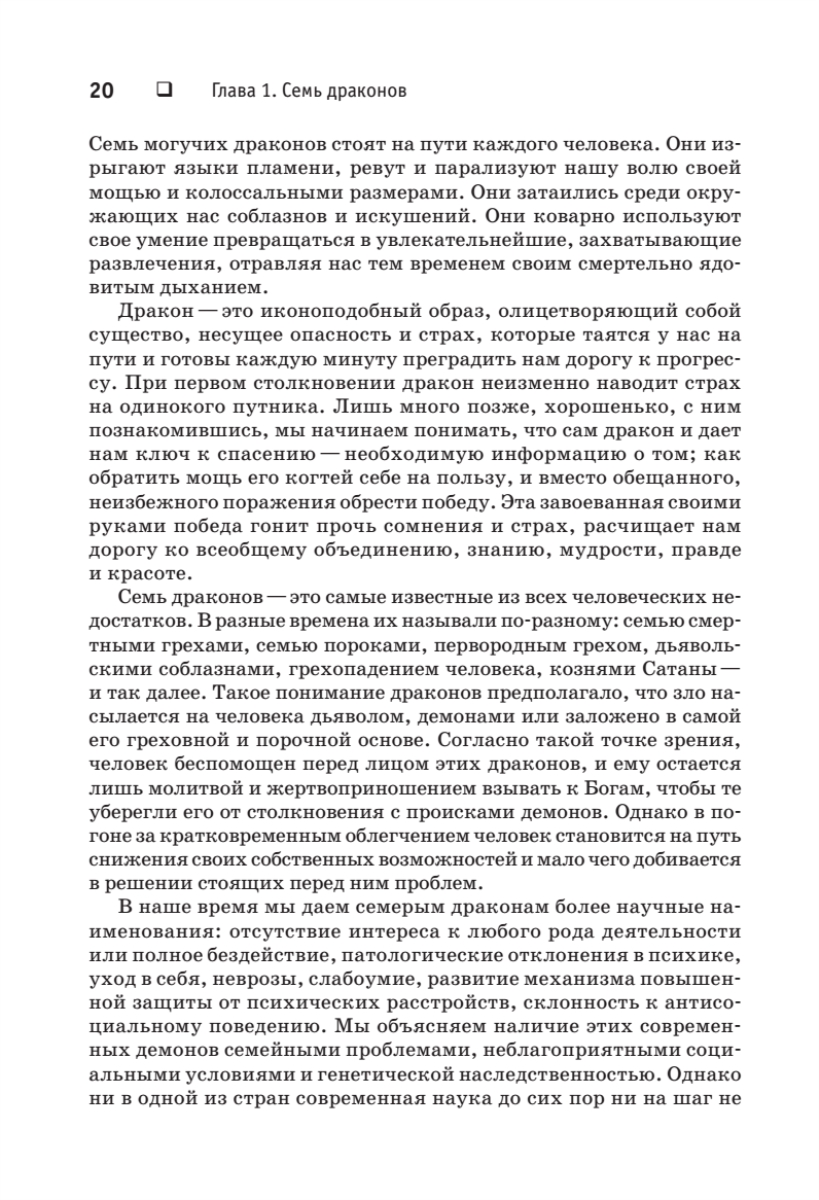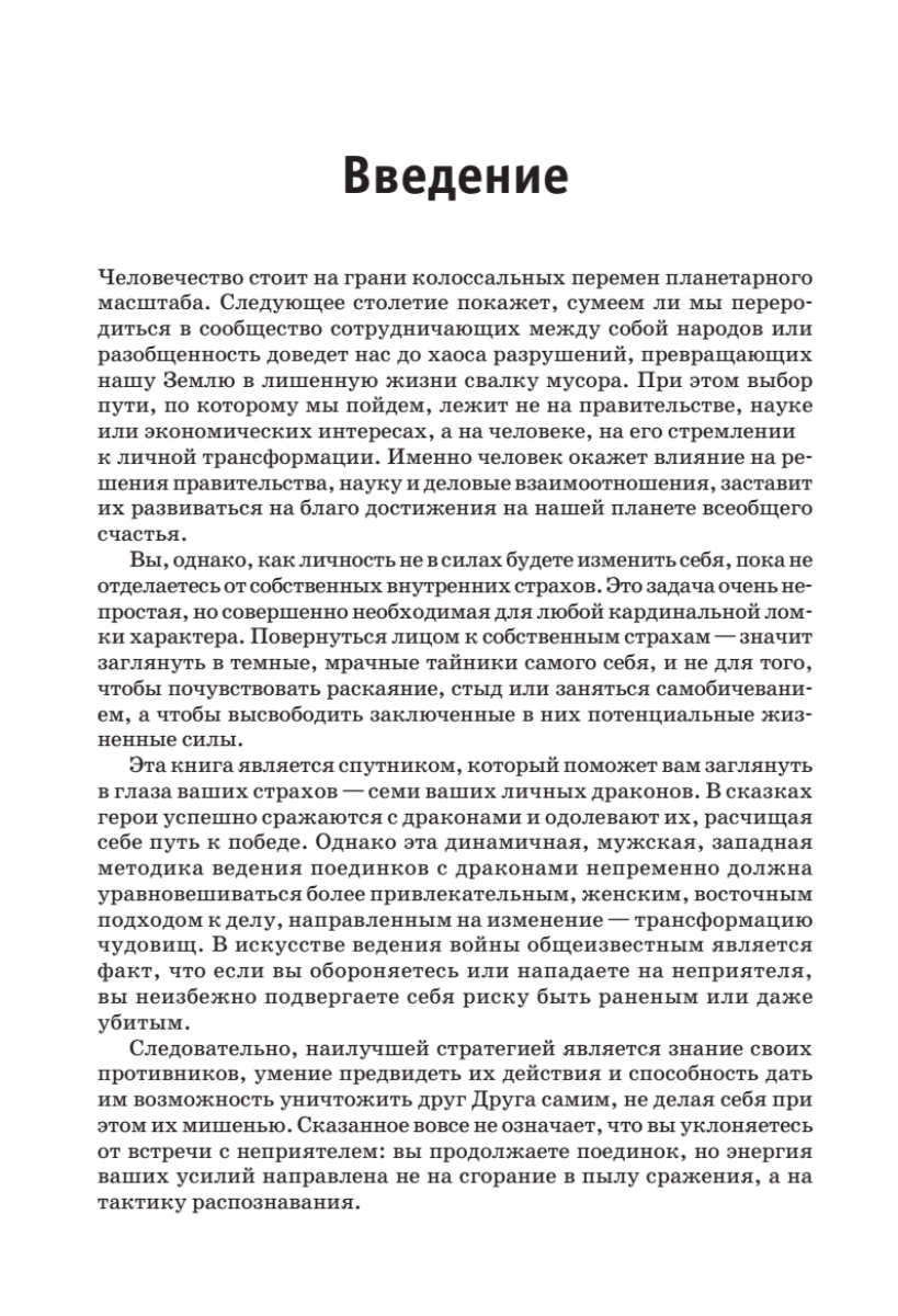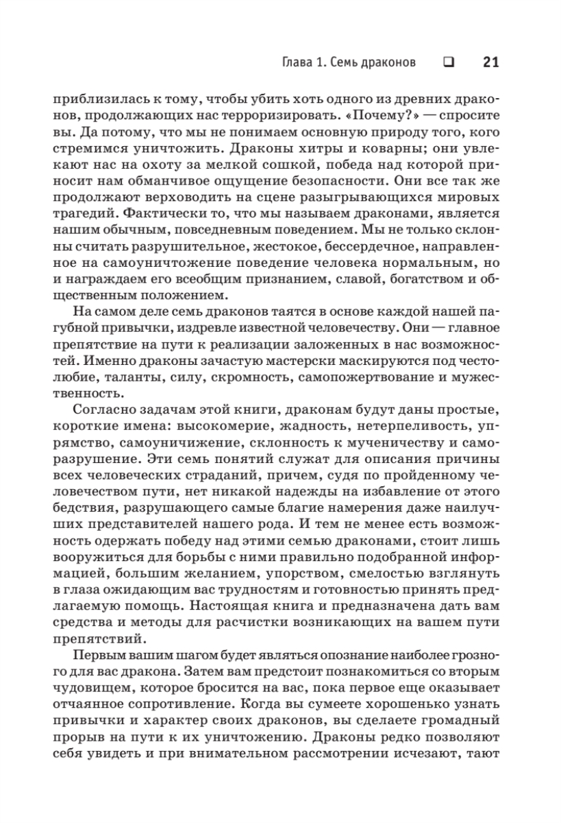 Более 20 лет книга Хосе Стивенса «Приручи своих драконов» остается бестселлером и меняет жизни многих людей. В чем же секрет ее успеха?Еще в начале своей карьеры психотерапевта автор обнаружил, что в современной психологии не хватает какого-то важного элемента. Он стал искать его в трудах древних мыслителей, мифах и сказках и смог ухватиться за ниточку познания, протянувшуюся к нам сквозь века, а потом и вплести ее в клубок современных идей. Так родилась методика, позволяющая выявлять глубинные проблемы и убирать барьеры, стоящие на пути большинства людей. Главные герои этой книги — семь драконов, представляющие собой семь основанных на страхе поведенческих реакций человека. Стивенс построил их парами: дракон высокомерия стоит рядом с драконом самоуничижения, дракон нетерпеливости — с драконом мученичества, дракон жадности — с драконом саморазрушения, а последний, седьмой — дракон упрямства, — способен поладить с каждым из шести предыдущих. Все эти чудовища уже много веков держат человечество в своих лапах, мешая людям жить полноценной жизнью. Они хитры и коварны и хорошо прячутся у нас в душе, чтобы творить свои темные дела исподтишка и не дать себя обнаружить. Однако Хосе Стивенс знает, как их найти и обезвредить. В этой книге он дает оружие, благодаря которому вы сможете приручить своих драконов и использовать силу этих мистических существ.