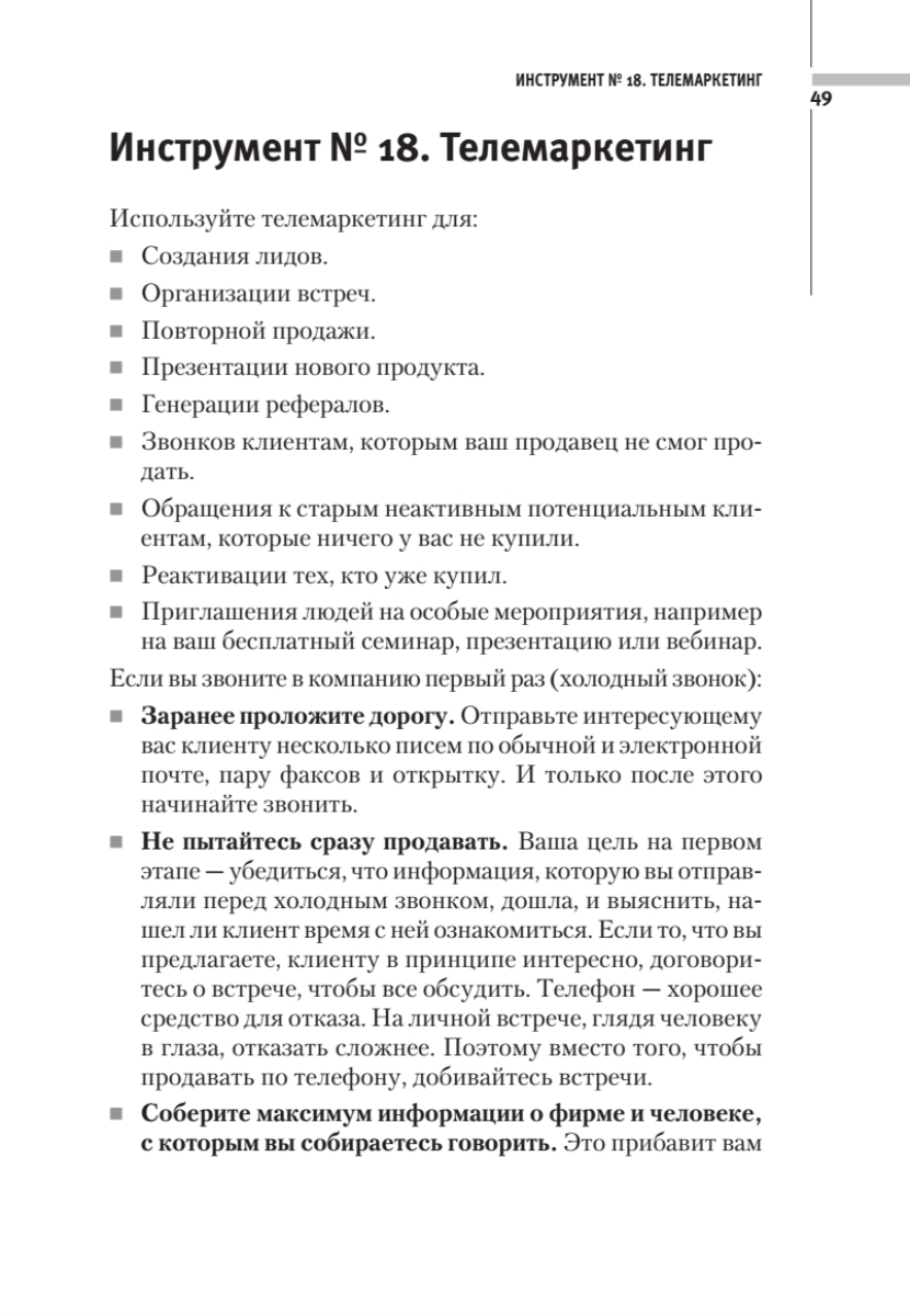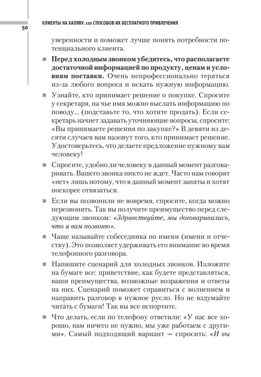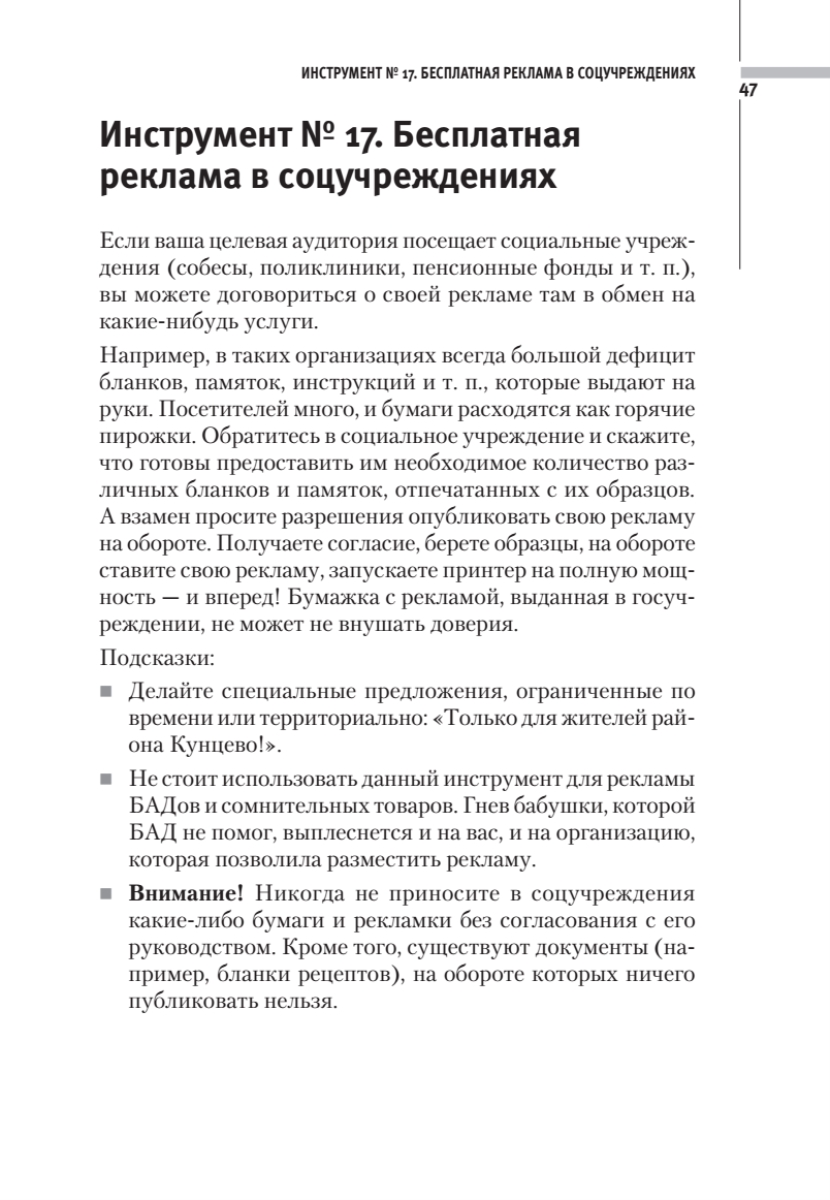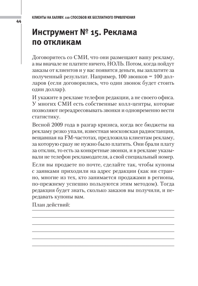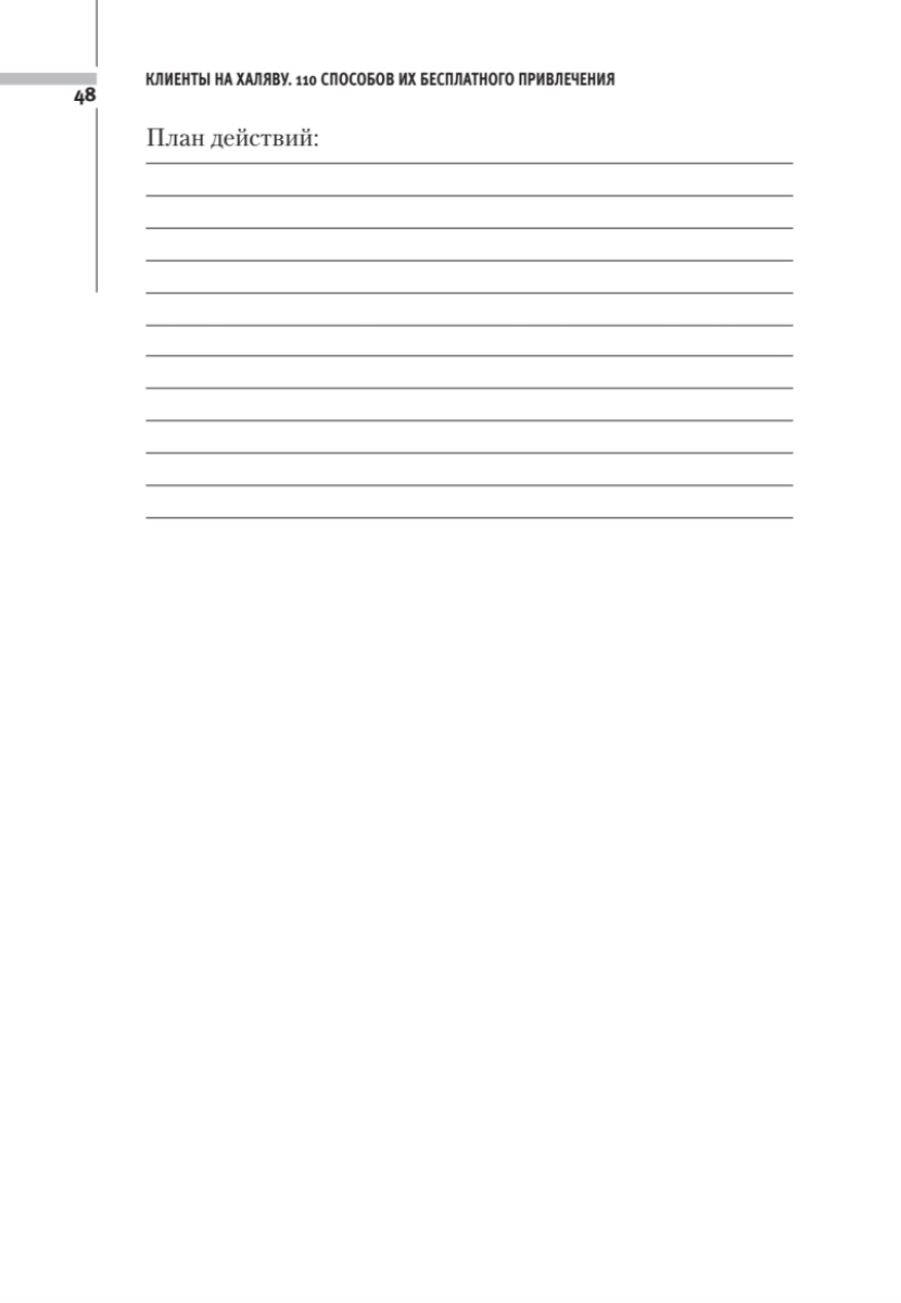 Часто намного эффективнее слегка потратиться, чем пытаться изобрести еще один хитрый способ «затащить» нескольких клиентов. Но легко судить, когда маркетинговый бюджет есть. А если денег не то чтобы мало... что, если их совсем нет? Что делать, если бюджет на рекламу и привлечение клиентов просто отсутствует? В этой книге собрано 110 способов бесплатного привлечения новых клиентов в ваш бизнес, которые можно просто брать и использовать!Какие-то из них смогут принести вам всего лишь несколько клиентов, а какие-то — множество. Что-то может вообще сработать не сразу, а только тогда, когда вы внедрите еще десяток технологий. Но одно можно гарантировать наверняка — ничего не сработает до тех пор, пока вы не примете решения внедрить все 110 технологий и не начнете их реализовывать! Рассматривайте эту книгу как прямое руководство к действию.