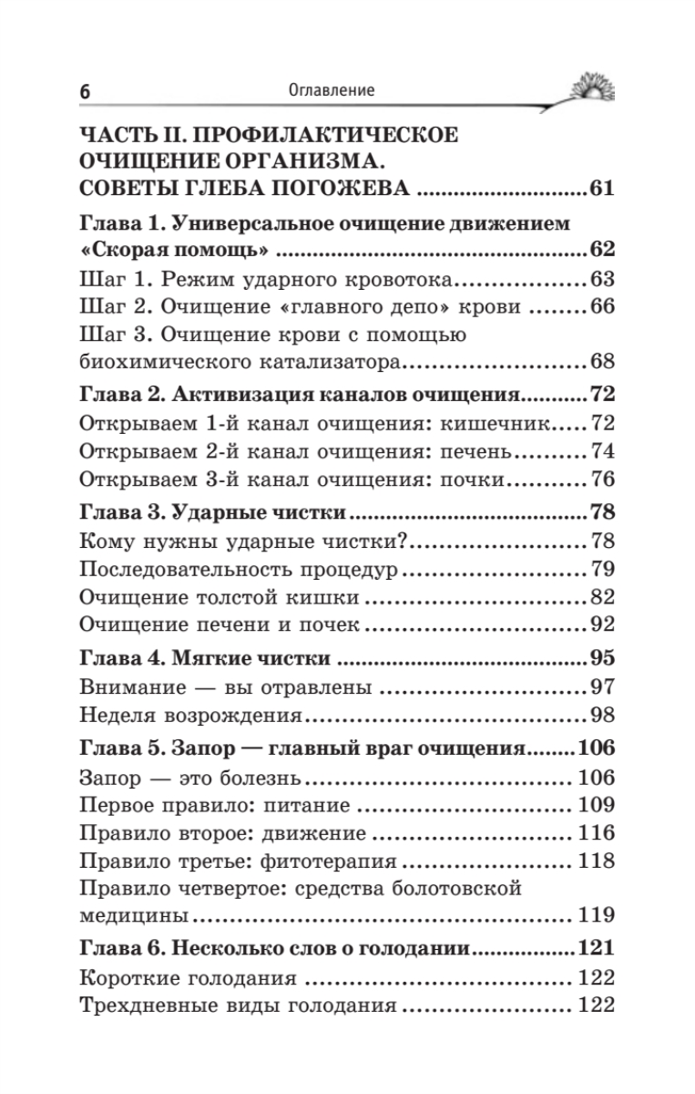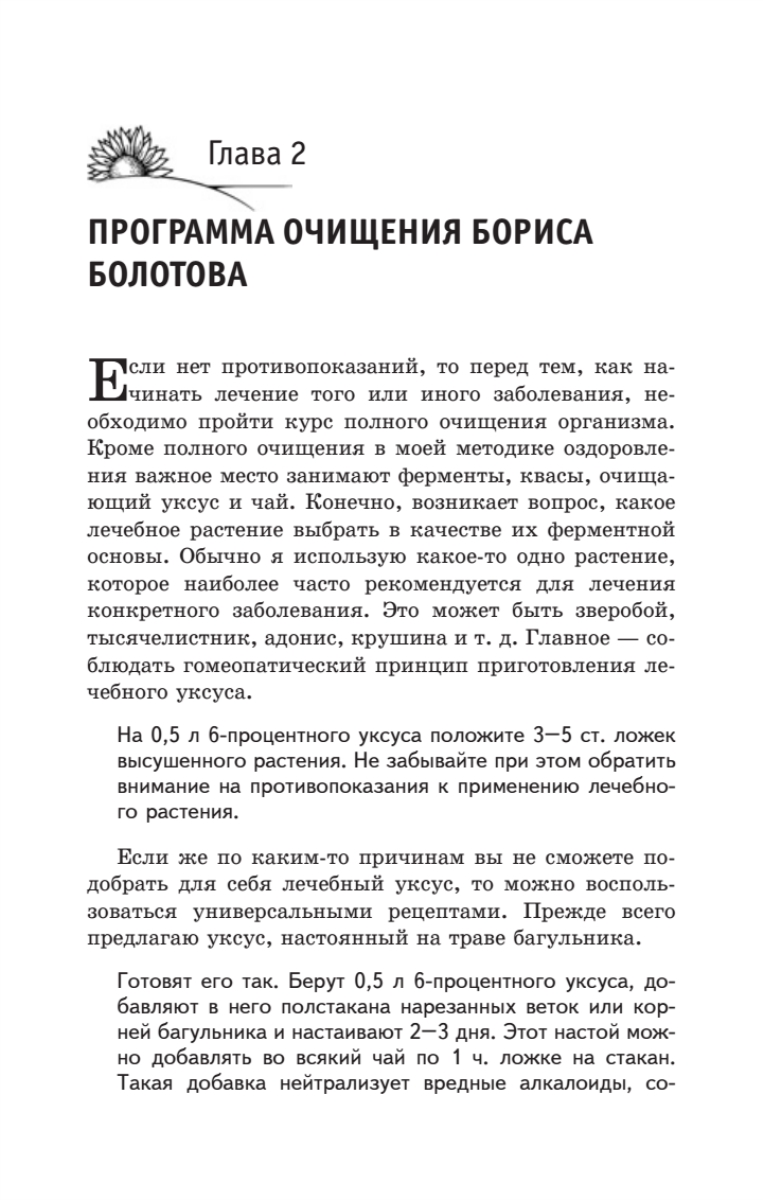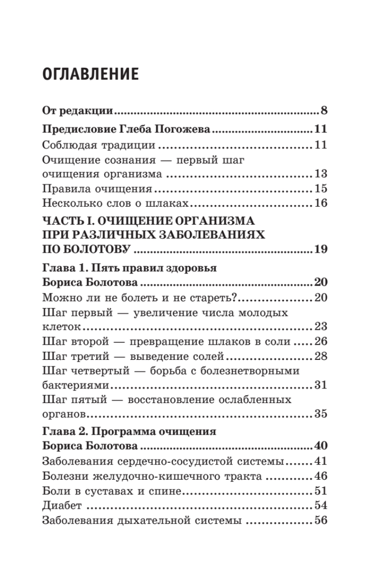 Борис Васильевич Болотов — крупнейший ученый современности, химик, физик, биолог, отдавший 40 лет научному поиску. Первая часть книги, написанная академиком Болотовым, посвящена очистительным процедурам, проводить которые автор рекомендует при различных заболеваниях. Он предлагает применять специально разработанные им средства очистительного комплекса — ферменты, уксусы, квасы, шарики (жмыхи).Во второй части книги, написанной его учеником, ученым и практиком Глебом Погожевым, рассматриваются очистительные процедуры для профилактики различных заболеваний. Автор подробно останавливается на вопросе необходимости проведения ударных чисток организма, приводит методику такого очищения, рассматривает разные варианты мягких чисток. Каждая глава этой книги — открытие, в каждой страничке — надежда, в каждом слове — польза.Страница Б. Болотова в Интернете расположена на сайте www.beztabletok.ru. Телефон московского представительства Б. Болотова: 8 (499) 748-31-87.