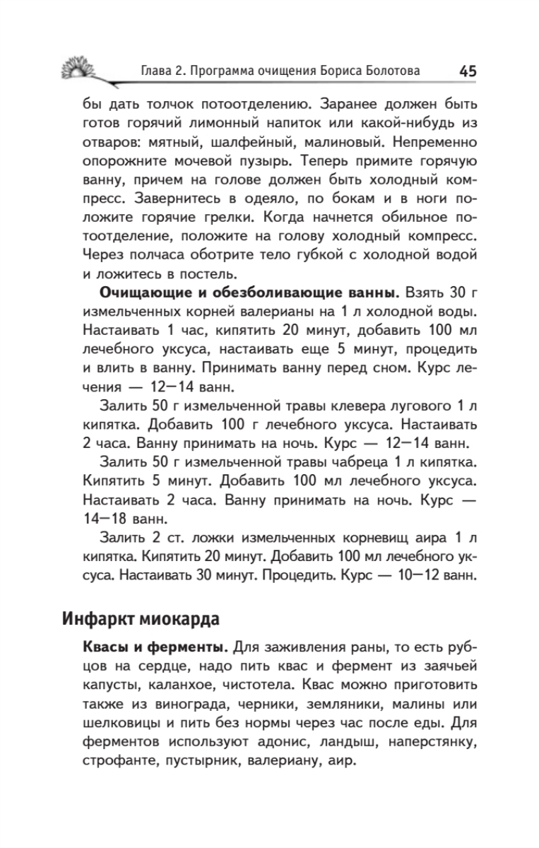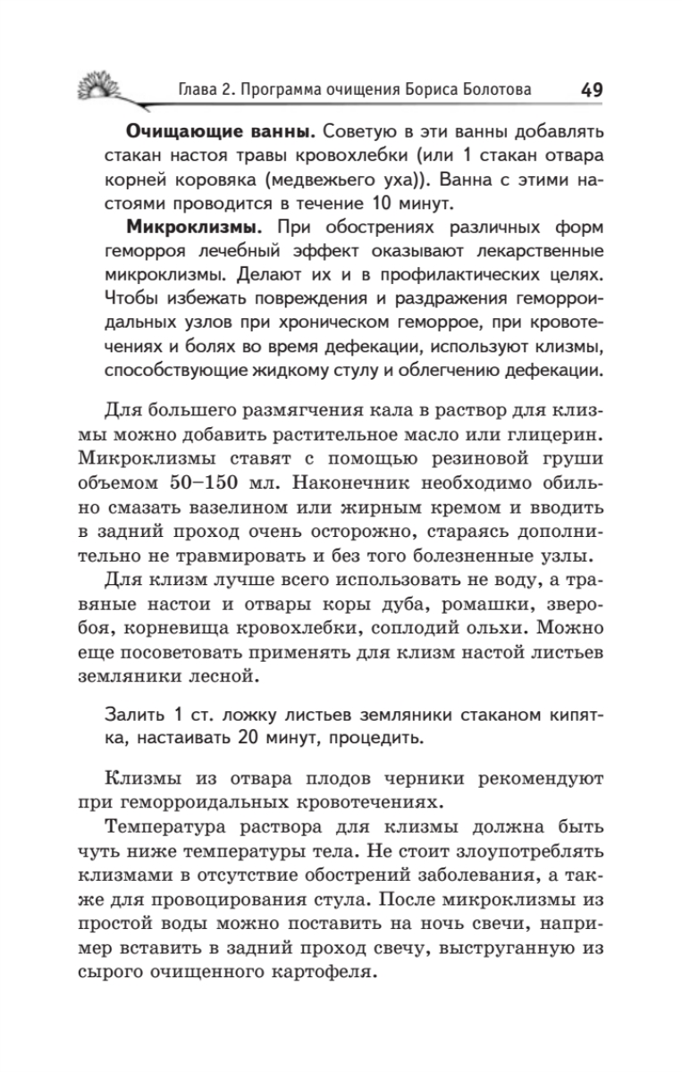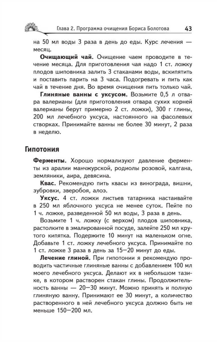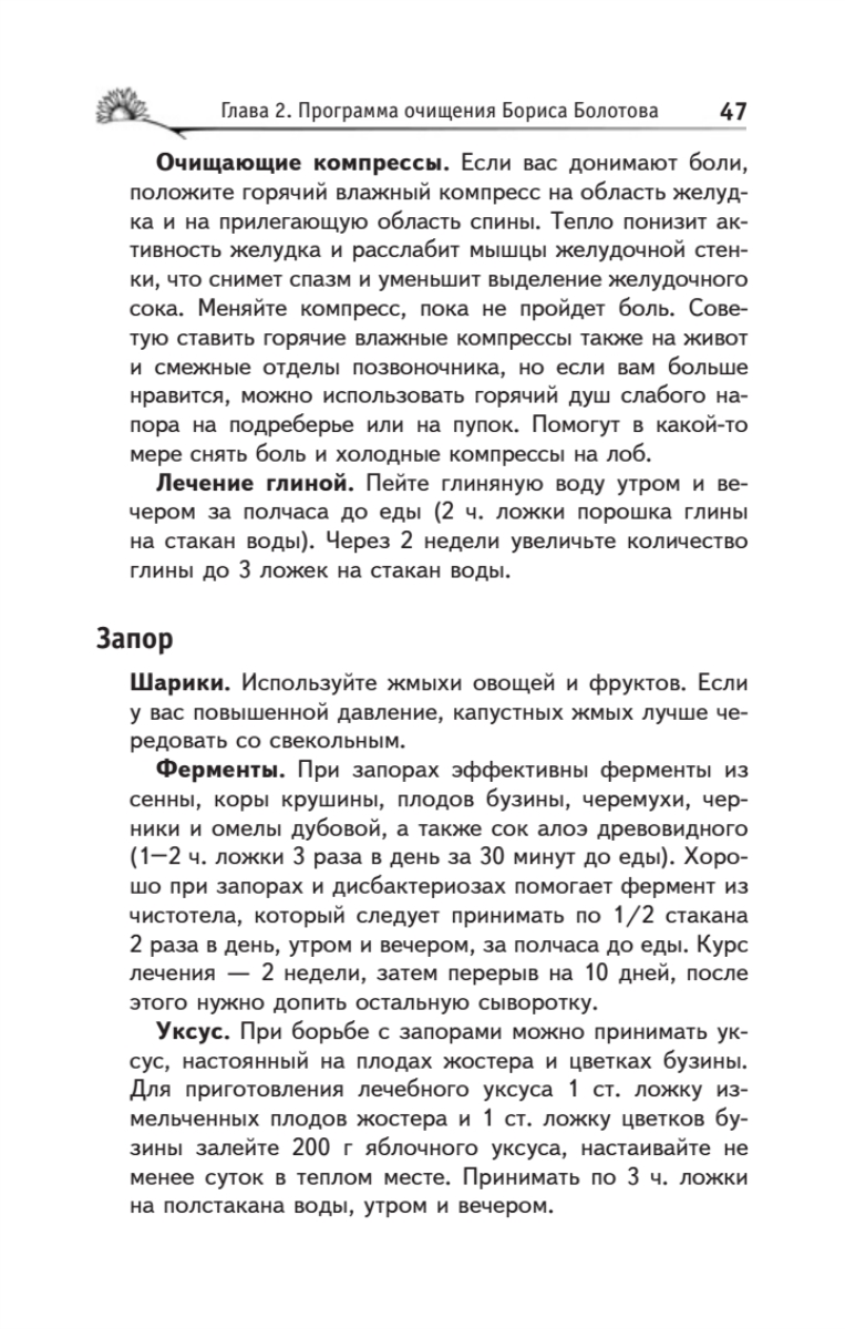 Борис Васильевич Болотов — крупнейший ученый современности, химик, физик, биолог, отдавший 40 лет научному поиску. Первая часть книги, написанная академиком Болотовым, посвящена очистительным процедурам, проводить которые автор рекомендует при различных заболеваниях. Он предлагает применять специально разработанные им средства очистительного комплекса — ферменты, уксусы, квасы, шарики (жмыхи).Во второй части книги, написанной его учеником, ученым и практиком Глебом Погожевым, рассматриваются очистительные процедуры для профилактики различных заболеваний. Автор подробно останавливается на вопросе необходимости проведения ударных чисток организма, приводит методику такого очищения, рассматривает разные варианты мягких чисток. Каждая глава этой книги — открытие, в каждой страничке — надежда, в каждом слове — польза.Страница Б. Болотова в Интернете расположена на сайте www.beztabletok.ru. Телефон московского представительства Б. Болотова: 8 (499) 748-31-87.